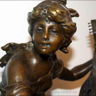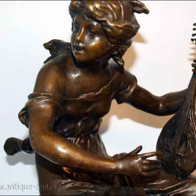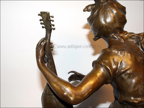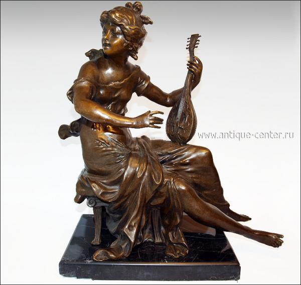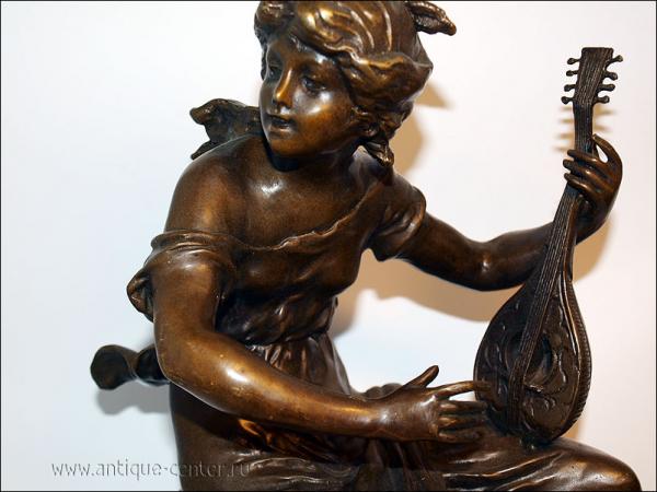 Скульптурная композиция выполнена в академической традиции и представляет собой сидящую музицирующую девушку. В левой ее руке - мандолина, правая приподнята вверх, драпированные одежды плавно струятся по телу. Подобные аллегорические женские образы были очень популярны как в салонном искусстве, так и в новаторских приемах модерна.