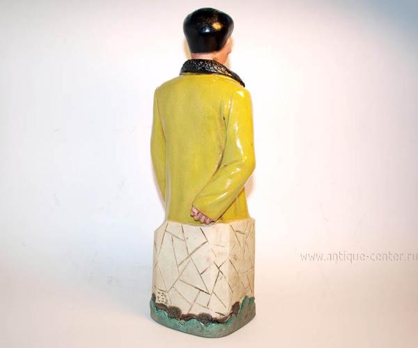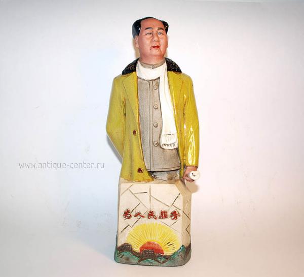 Представленная композиция – поясная фигура Мао Цзэдуна (1893-1976 гг.), китайского государственного и политического деятеля XX века, главного теоретика маоизма. Скульптура помещена на прямоугольное основание с рельефным символическим изображением страны восходящего солнца. Фигура Мао реалистичная, традиционная для идеализированных изображений коммунистических вождей. При малых размерах поражает монументальностью образа. Технически скульптура выполнена на хорошем уровне, детально и аккуратно проработана и расписана.