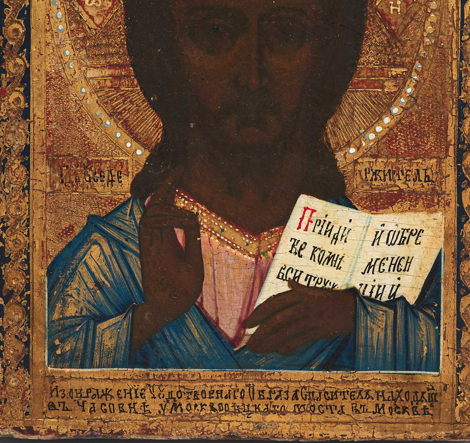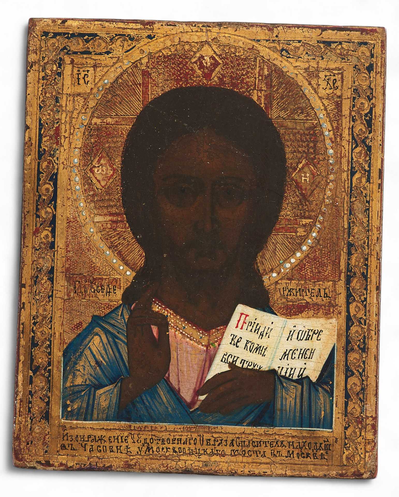 На иконе изображена оплечная фигура Иисуса Христа в фас с Евангелием в левой руке и с благословляющей правой рукой. Евангелие в руках Христа открыто. На открытых страницах надпись: «Приидите ко мне ecu труждающиеся».