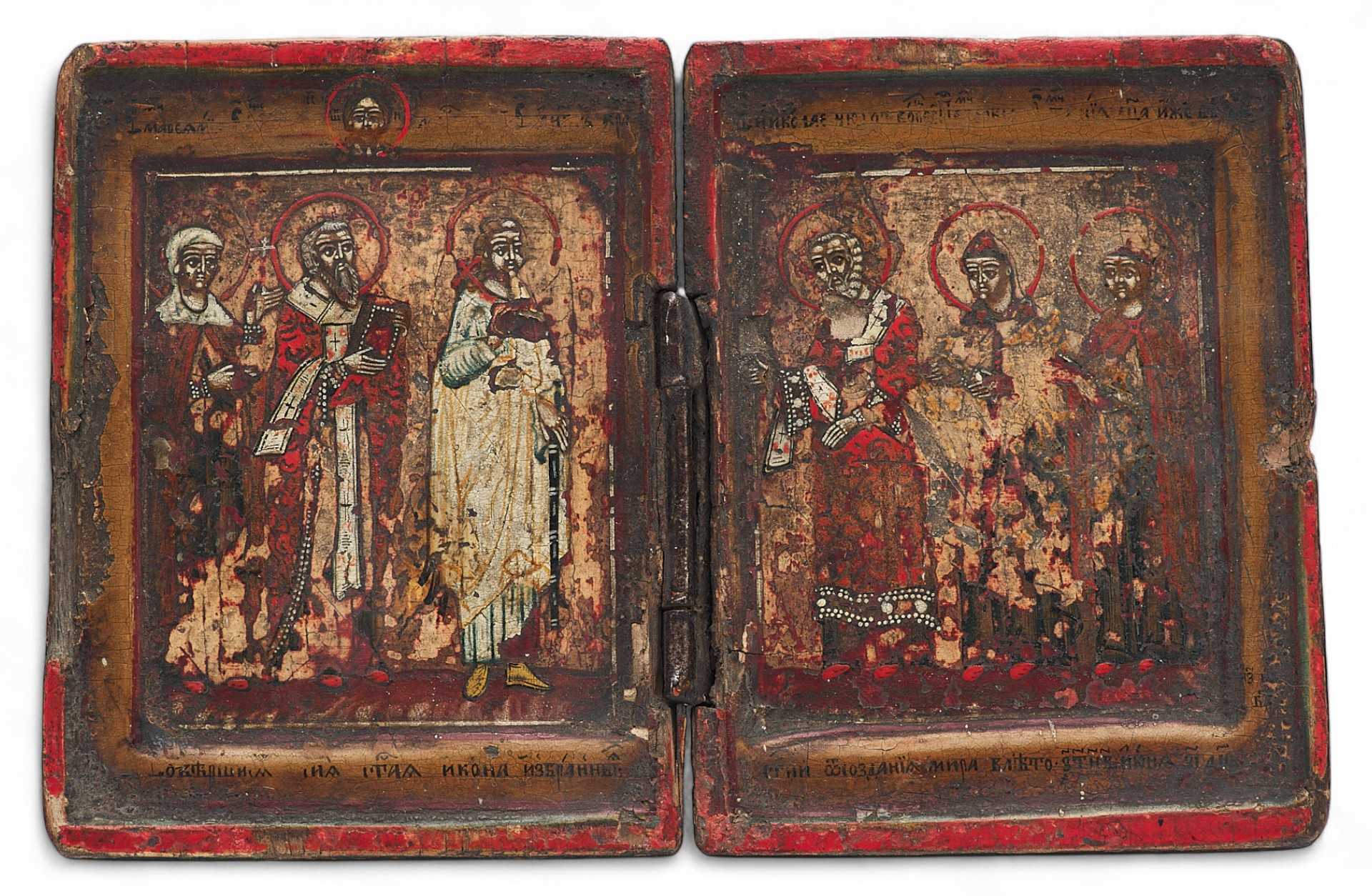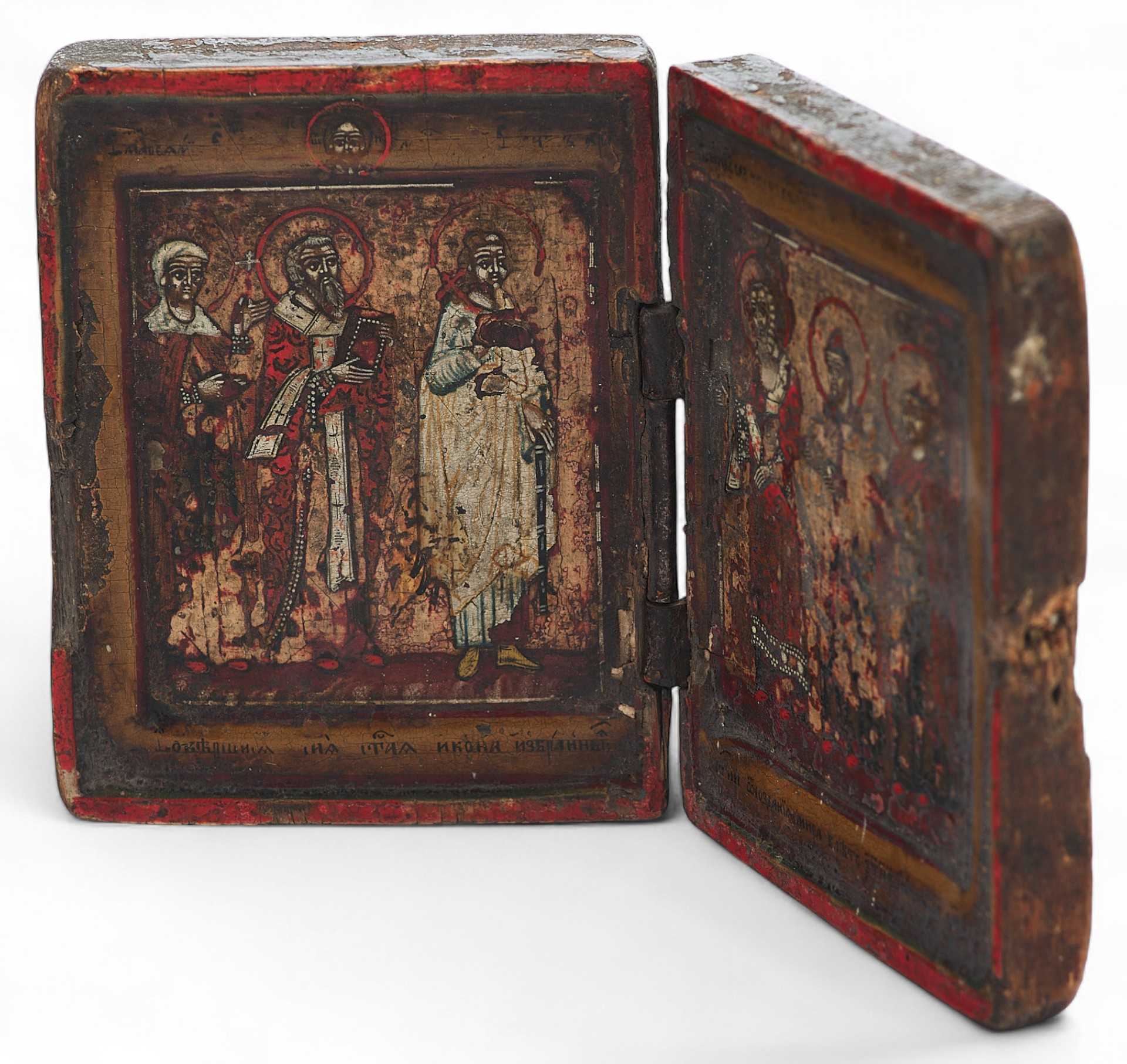 Живопись на складне исполнена профессиональным иконописцем в технике яичной темперы и золочения.