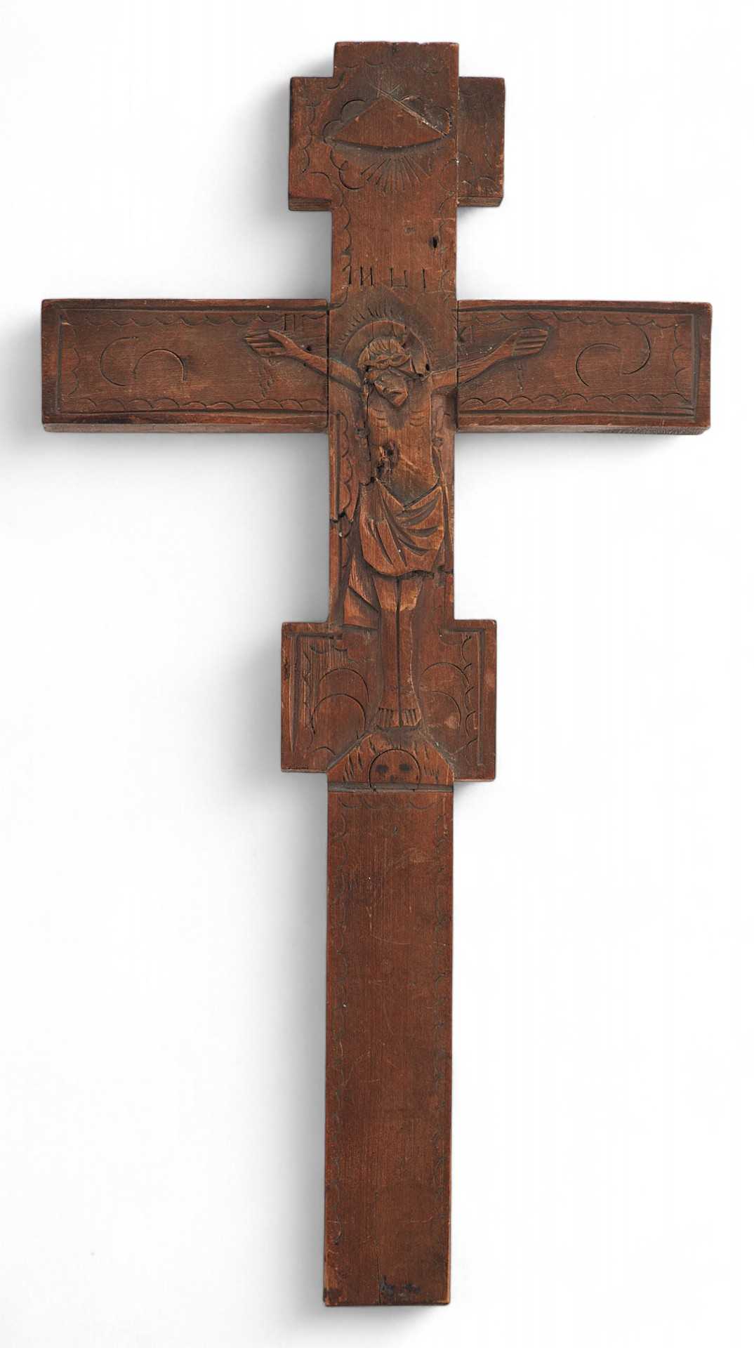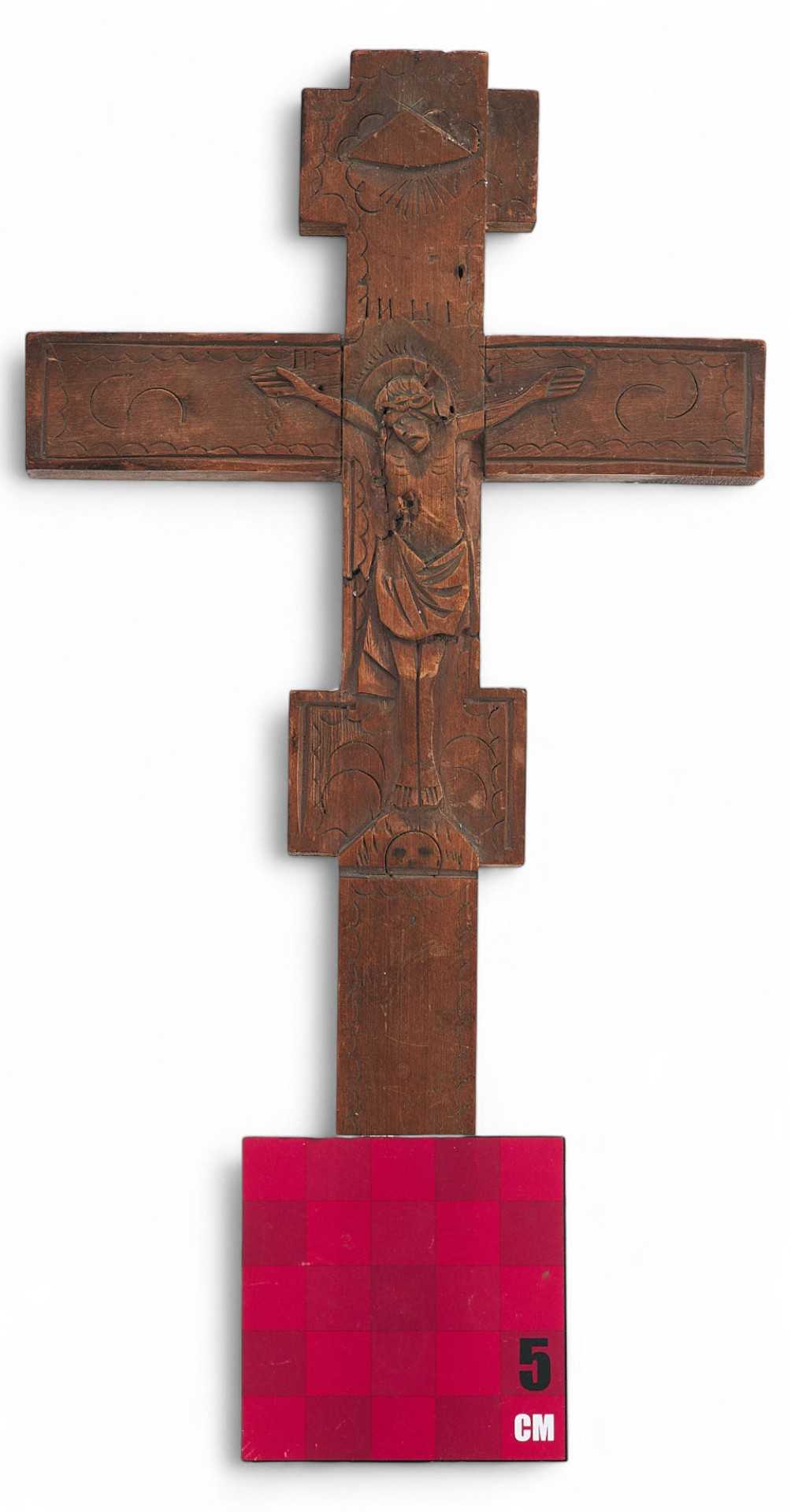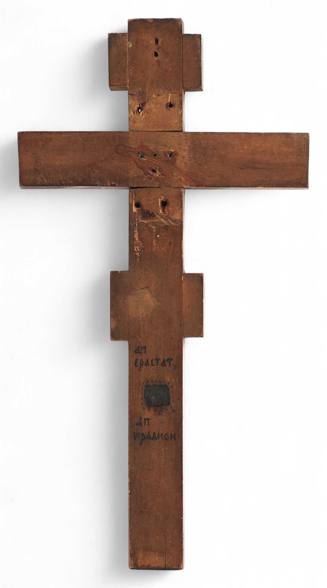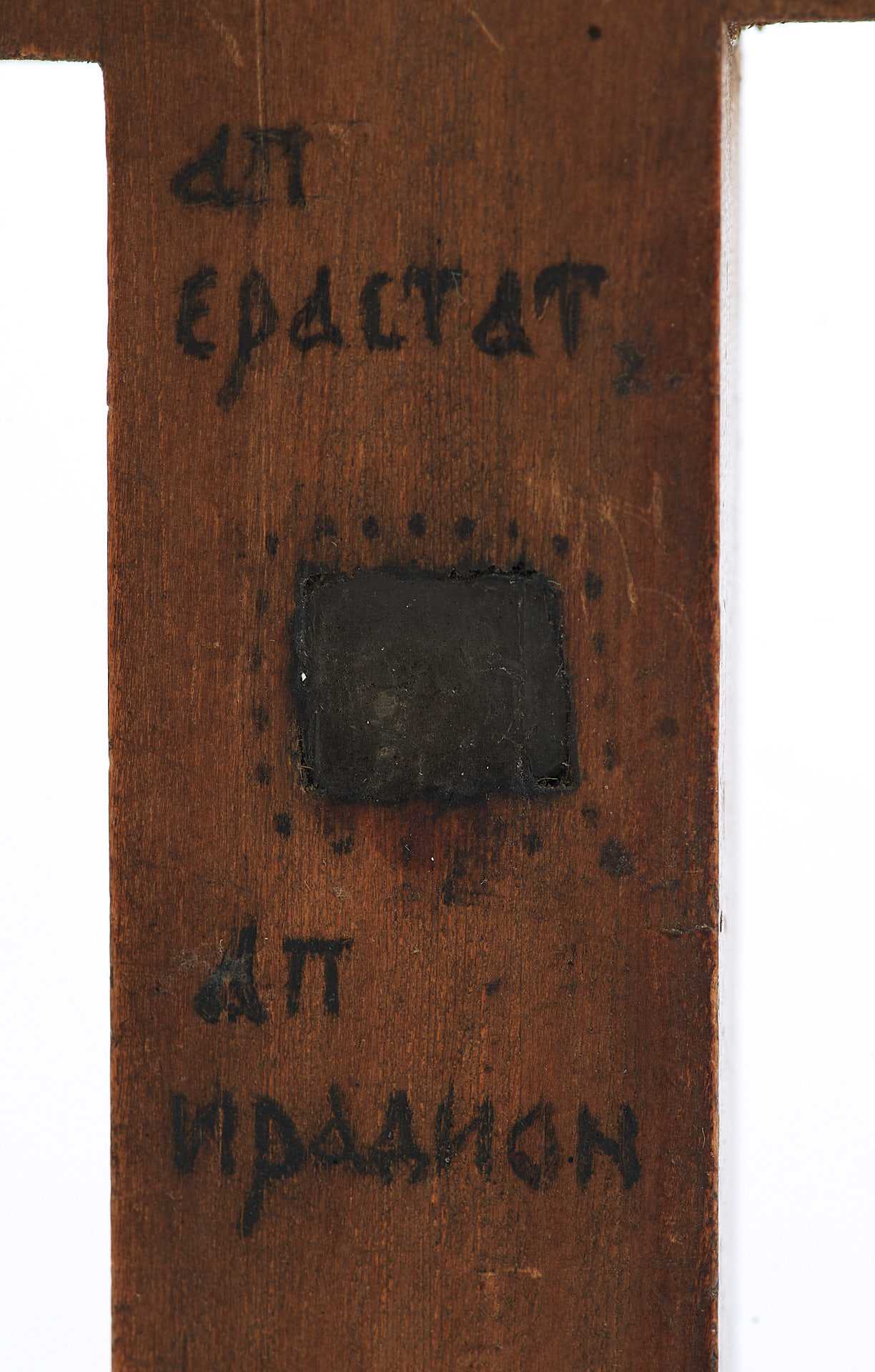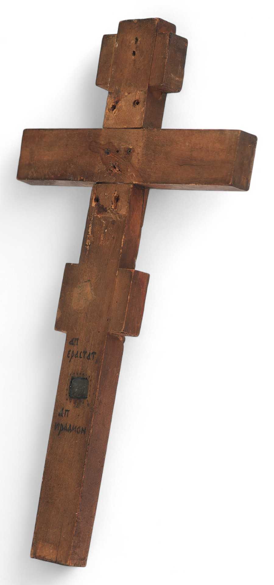 Восьмиконечный крест-мощевик с рельефной резьбой в виде распятой фигуры Иисуса Христа. На обороте креста имеется отверстие-мощевик запечатанный воском и надпись: «Ап(остол) Ерастрат, Ап(остол) Ирадион» (апостолы из 70). Надпись