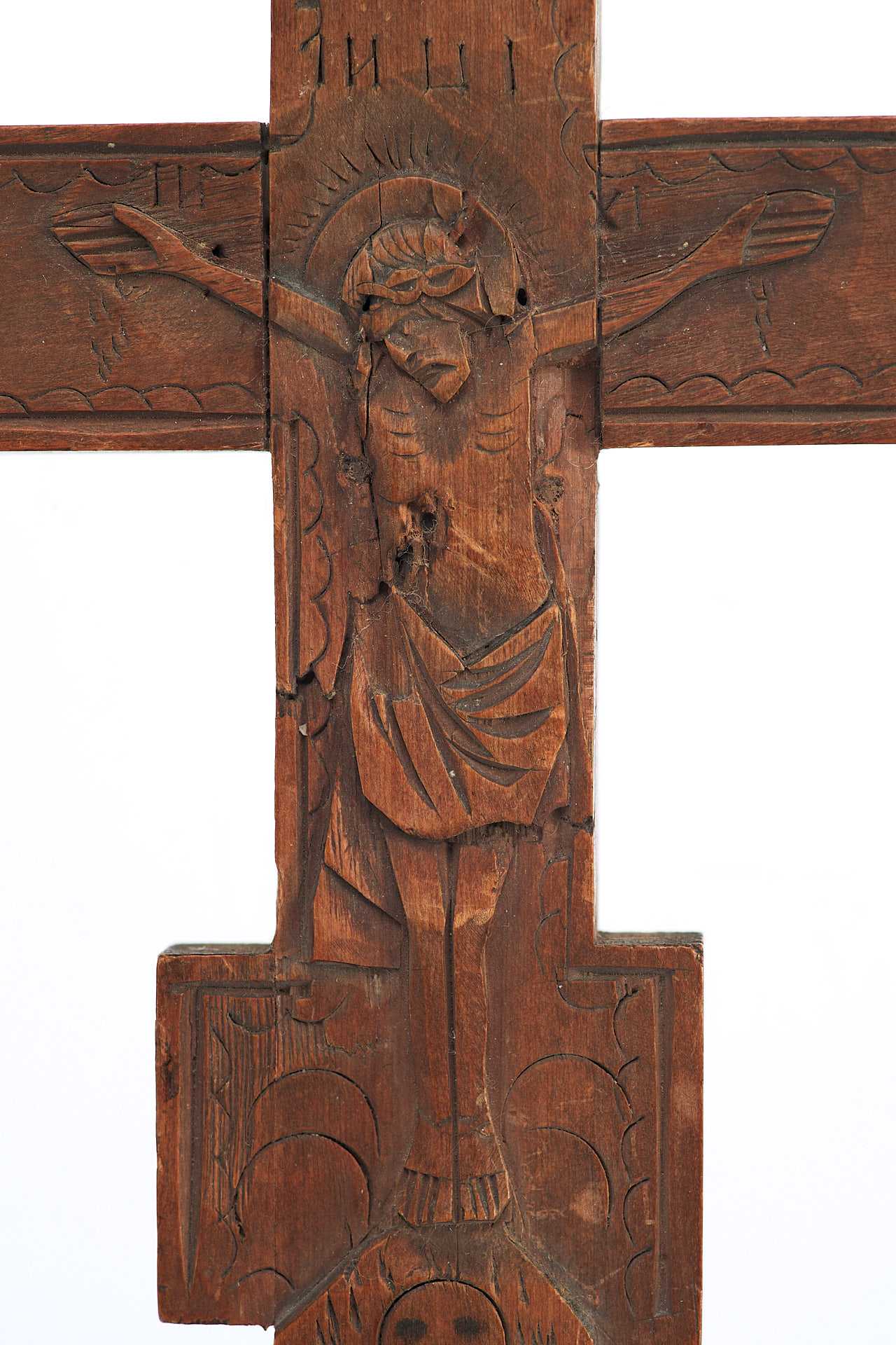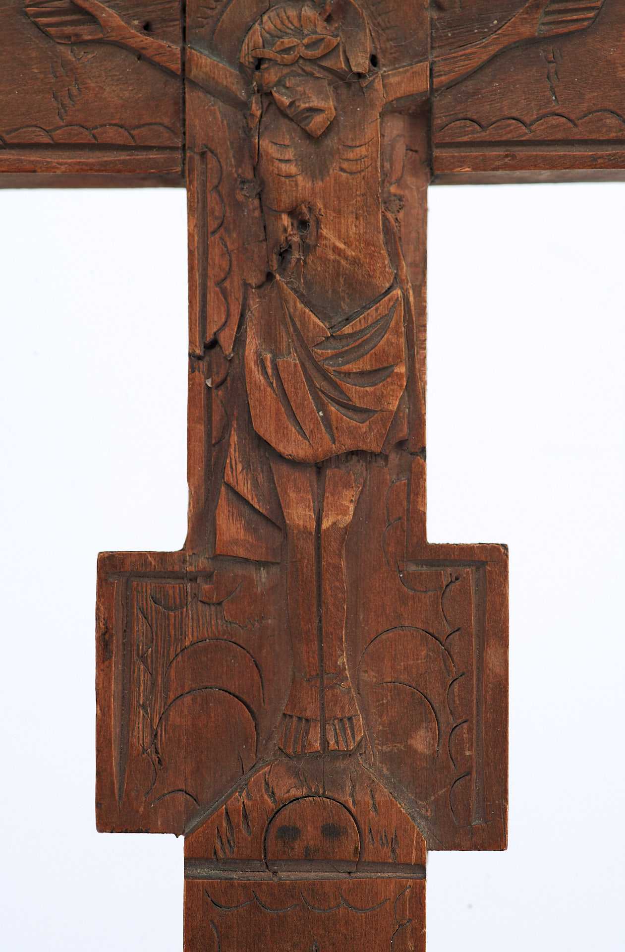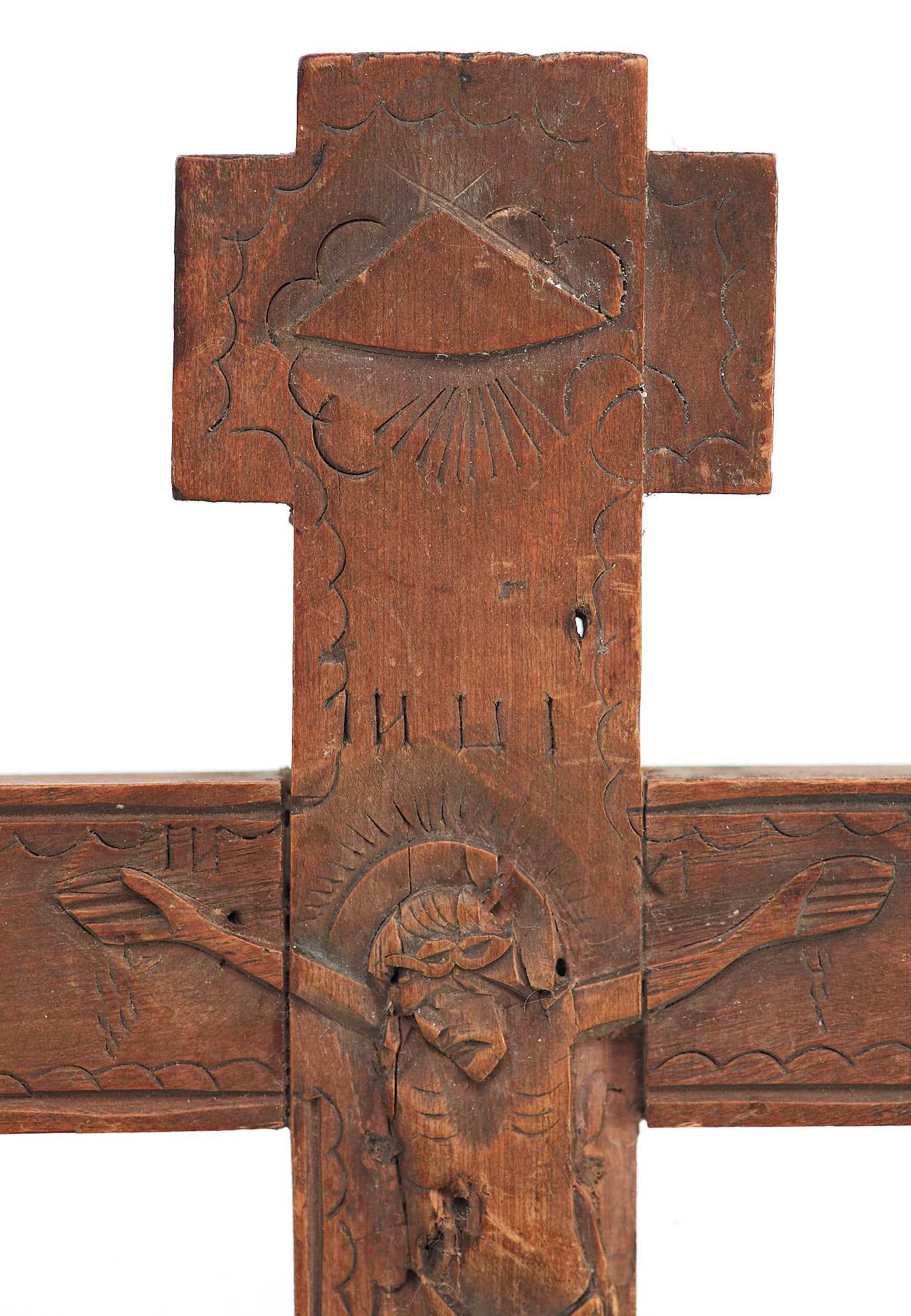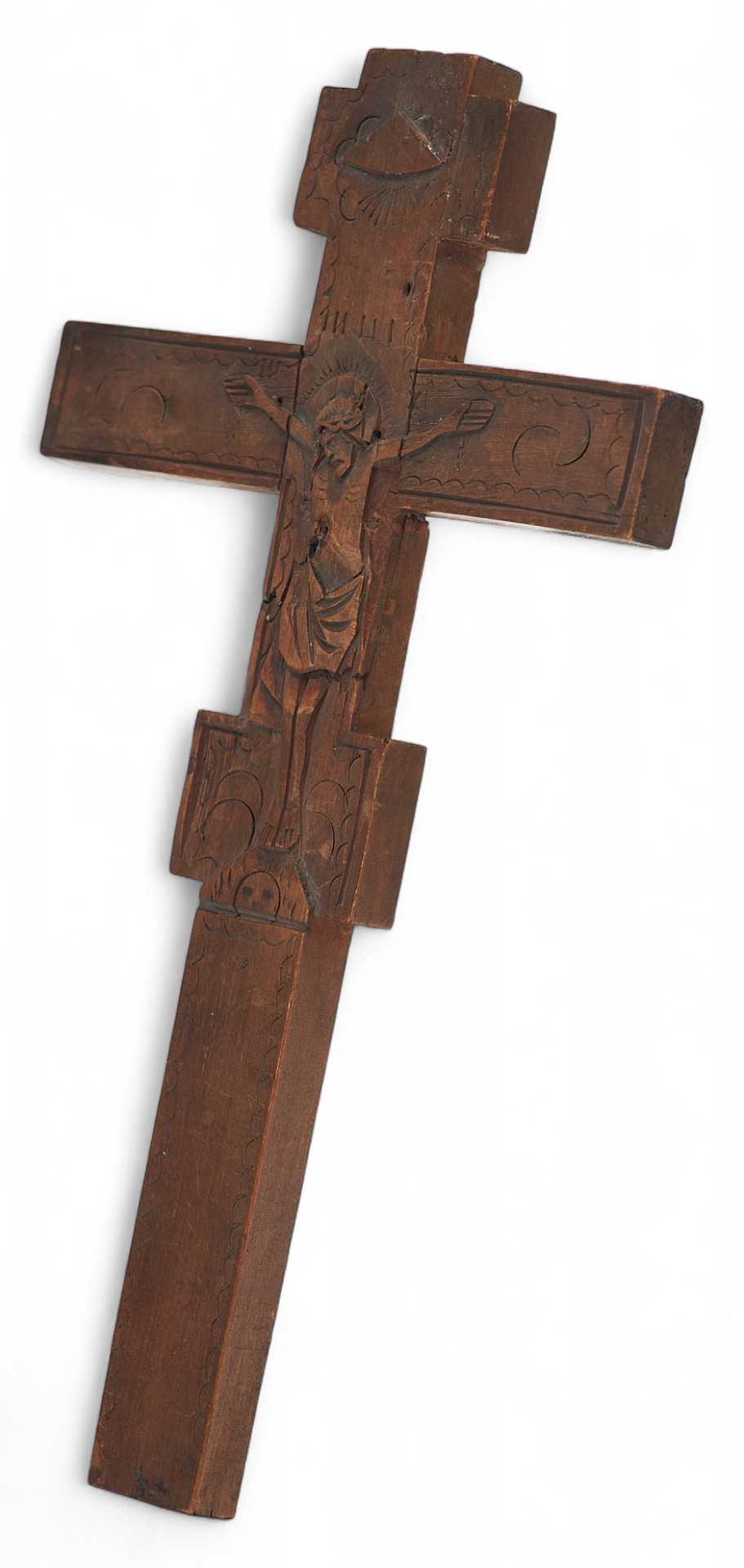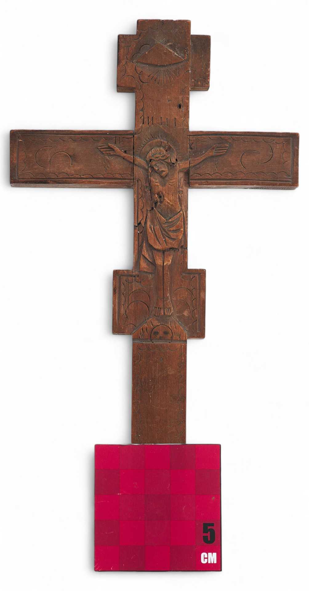 Восьмиконечный крест-мощевик с рельефной резьбой в виде распятой фигуры Иисуса Христа. На обороте креста имеется отверстие-мощевик запечатанный воском и надпись: «Ап(остол) Ерастрат, Ап(остол) Ирадион» (апостолы из 70). Надпись