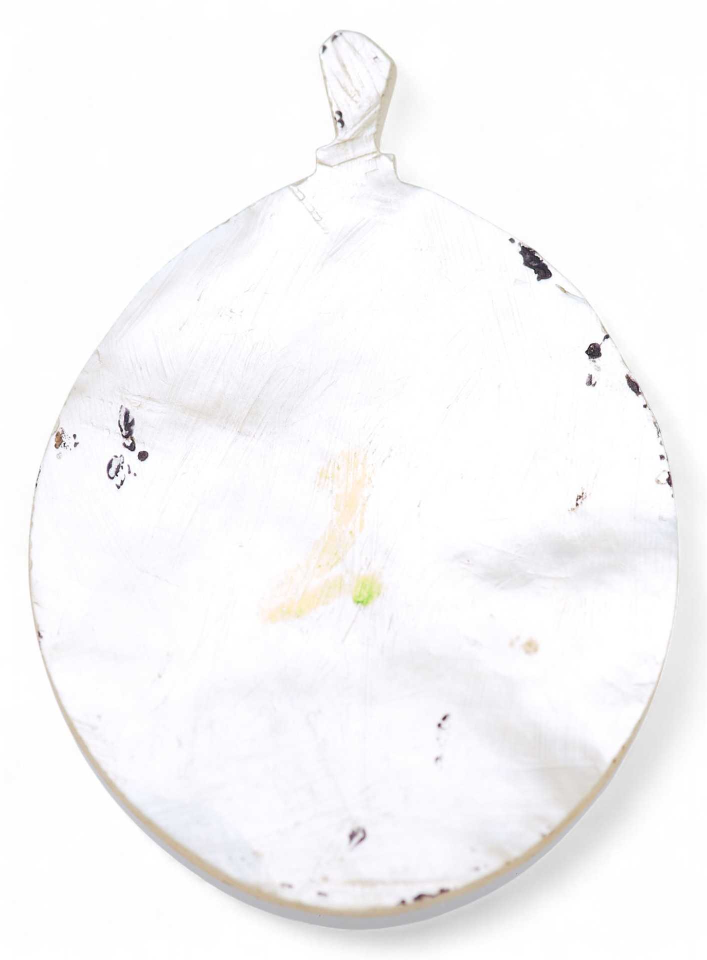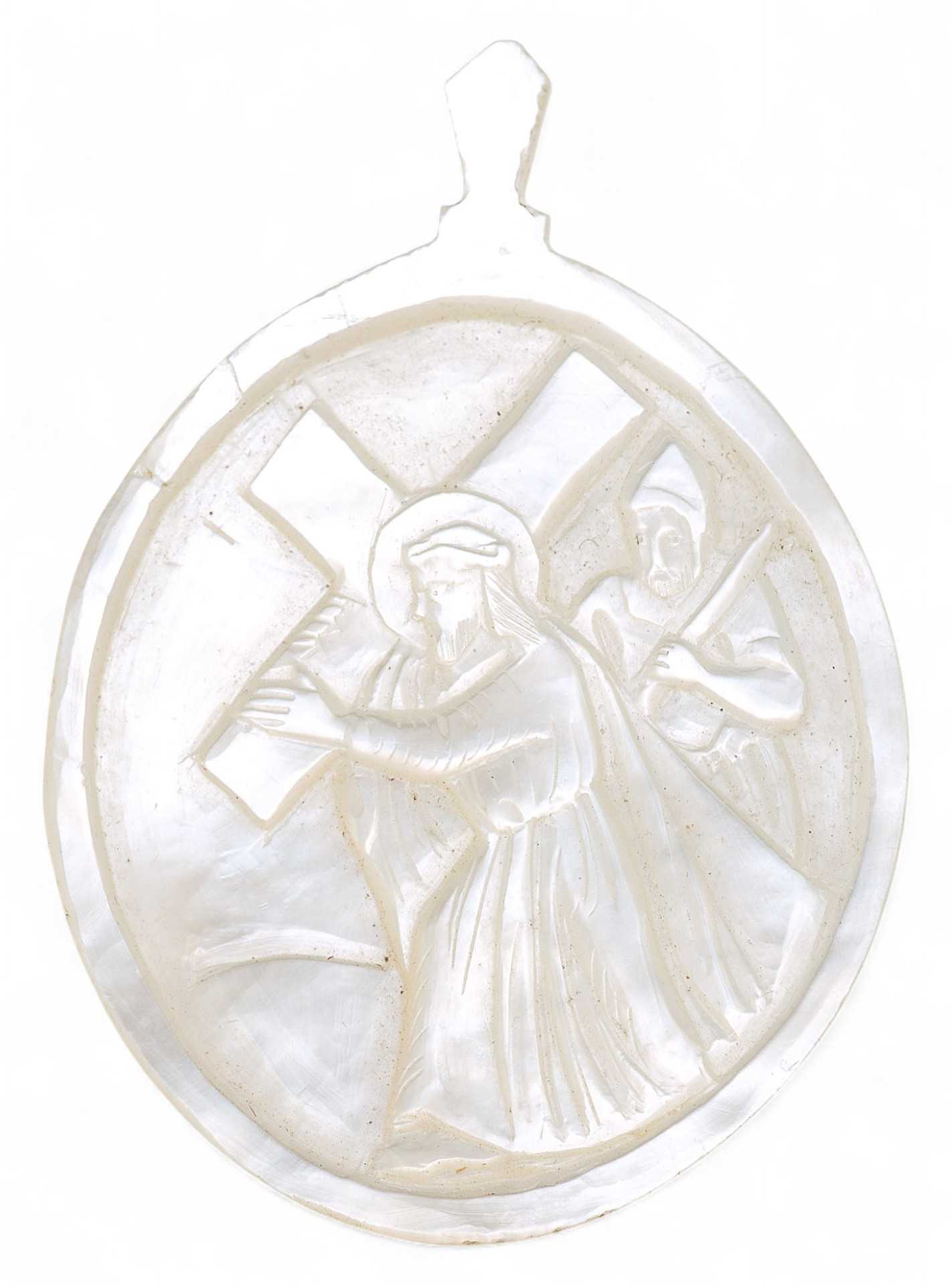 На перламутровой пластине овальной формы изображено Несение Креста — Путь Спасителя на Голгофу.