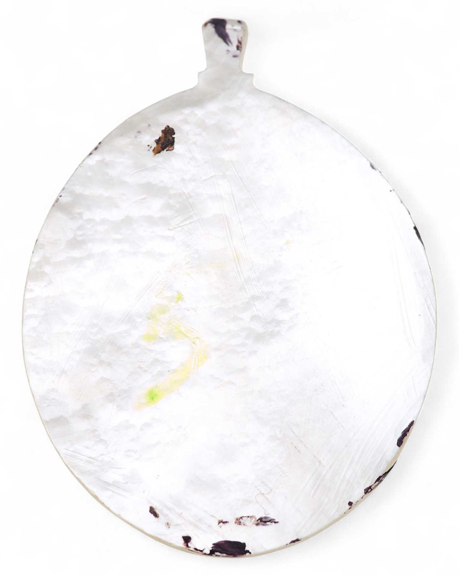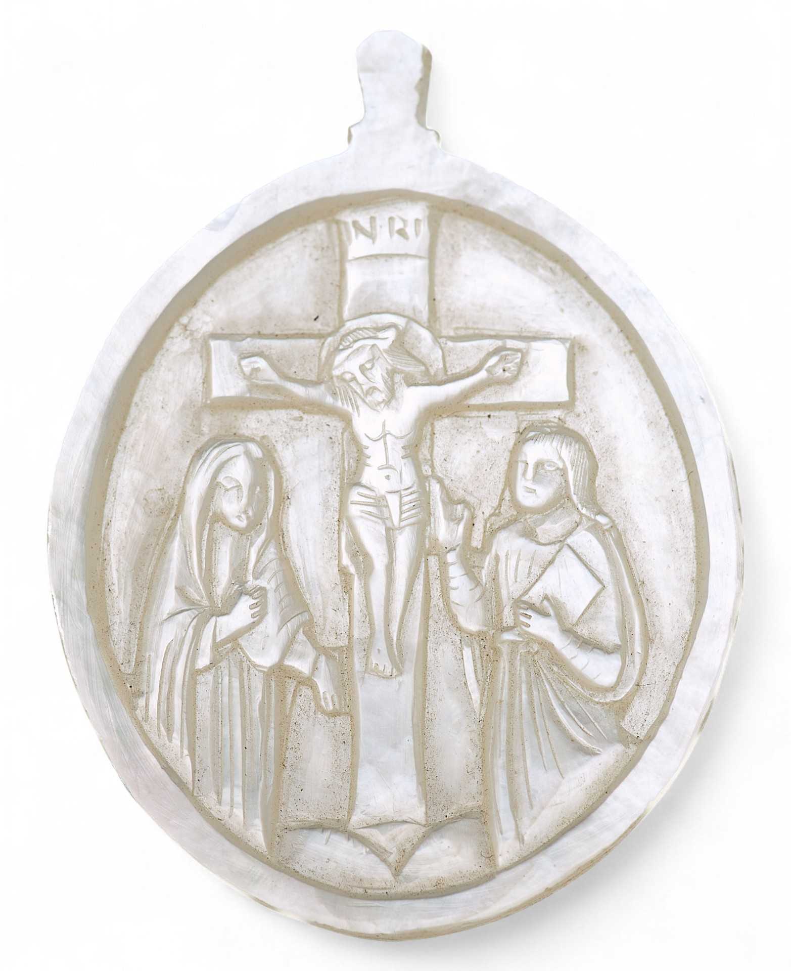 На перламутровой пластине овальной формы изображено Распятие предстоящими Богоматерью и Иоанном Богословом.