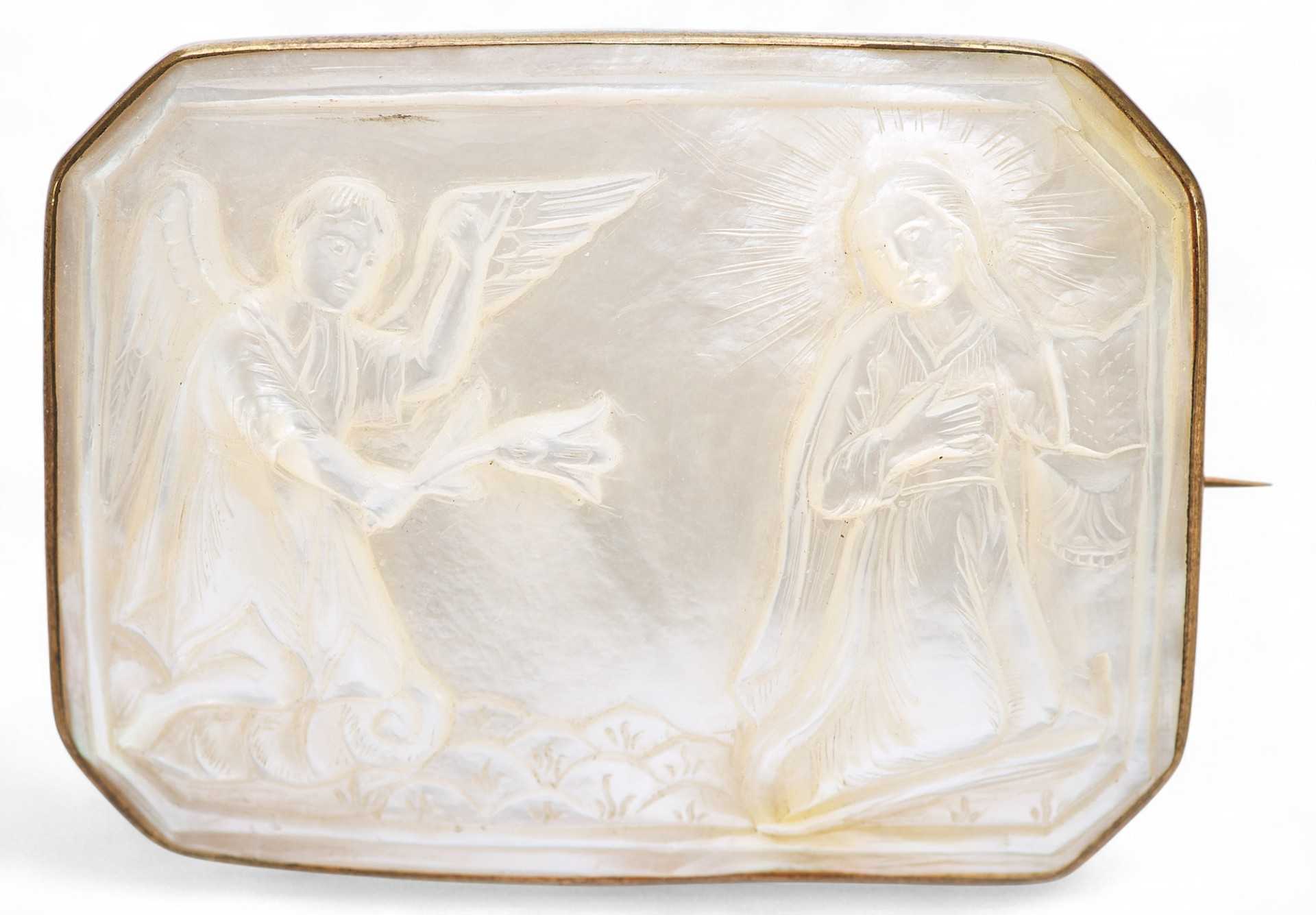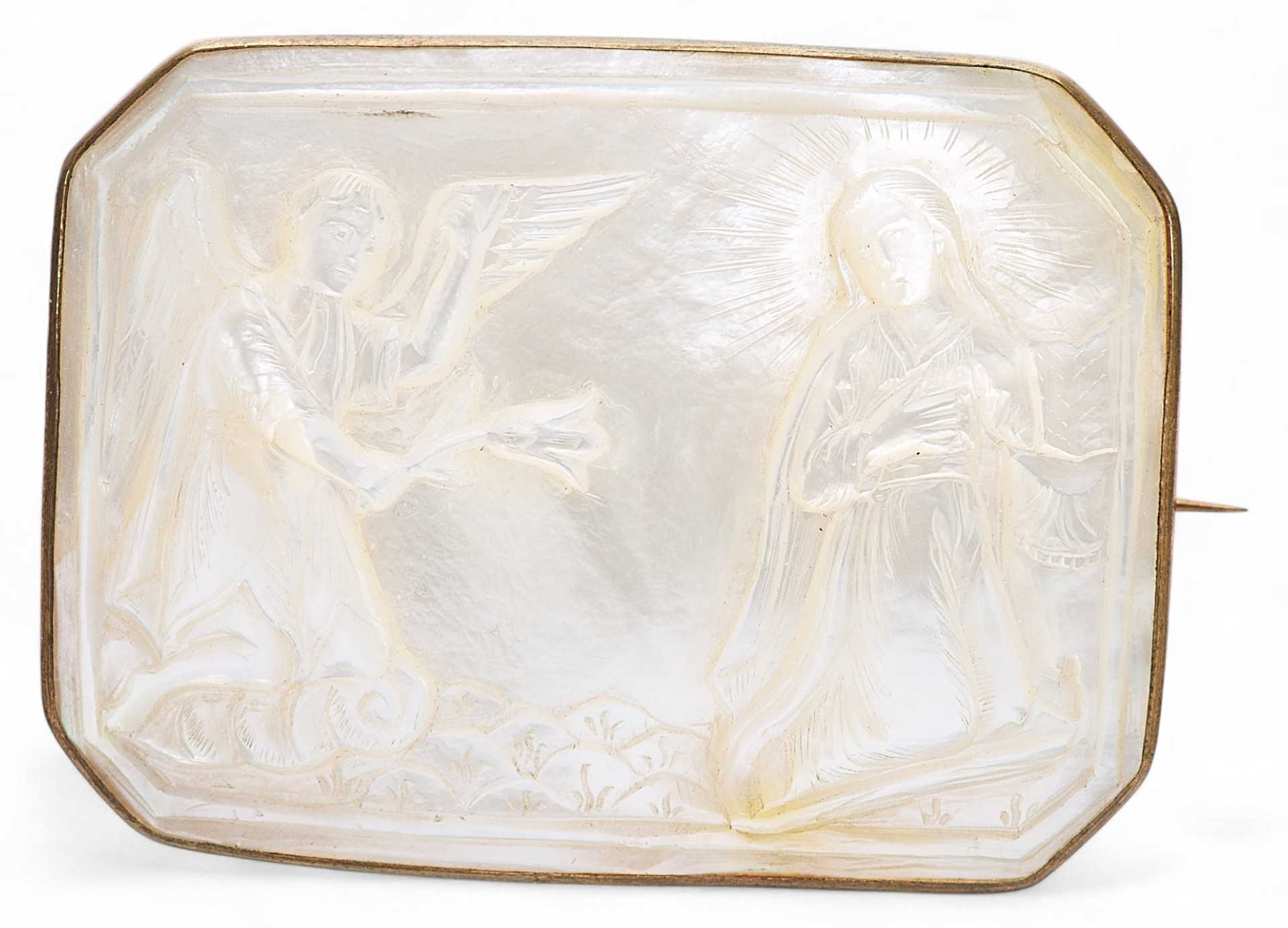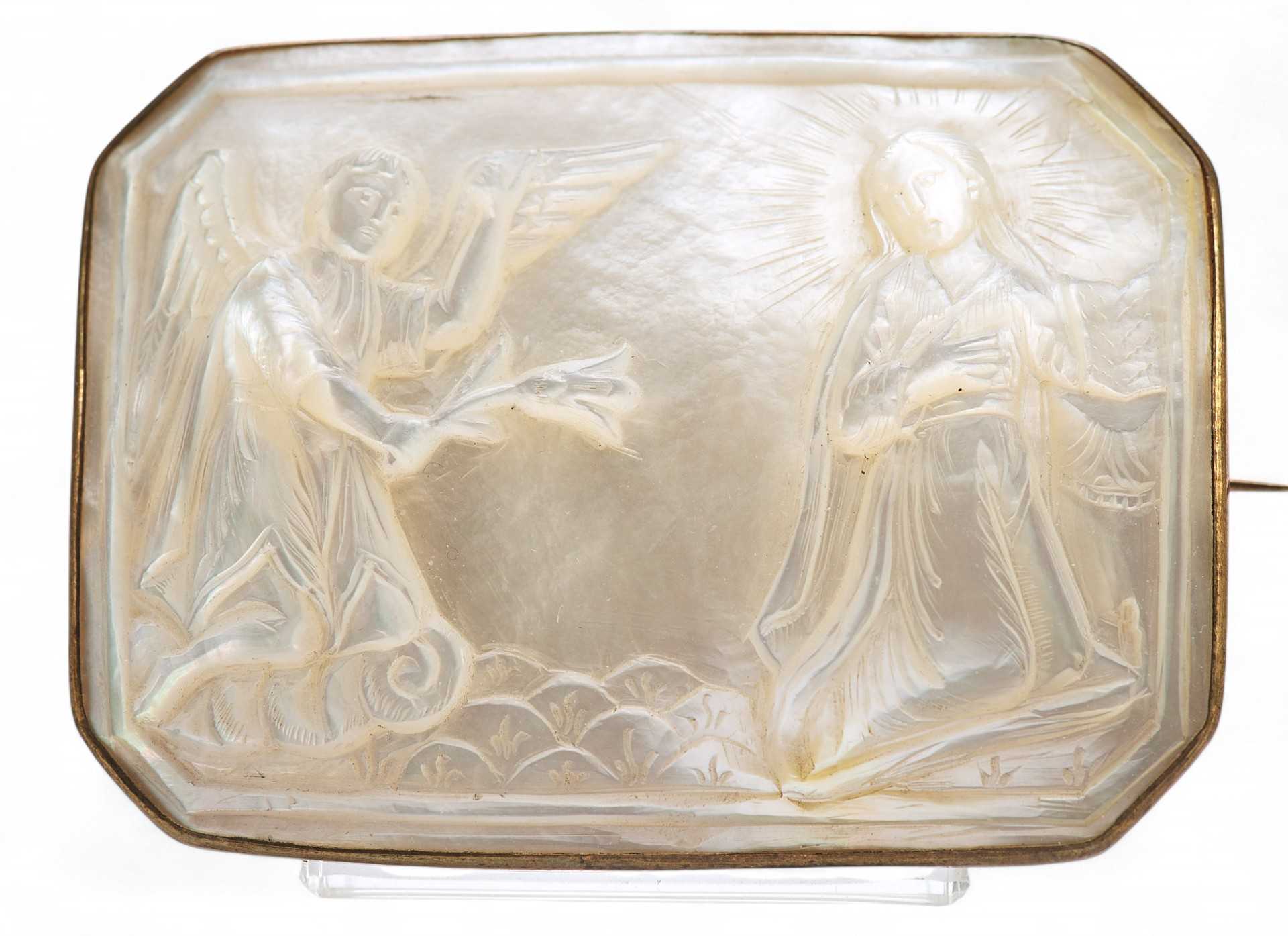 Евангельскими темами таких перламутровых иконок были: “Вознесение Господне”, “Тайная вечеря”, “Крещение Господа Иисуса Христа в Иордане” и другие религиозные сюжеты. Перламутровые раковины-иконки производили православные арабы Святой Земли в Вифлееме, преимущественно для русских паломников, вплоть до революции в России в октябре 1917 года. На Святой земле в художественных мастерских, располагавшихся при Русской Духовной миссии в Иерусалиме, работало немало и русских мастеров, которые изготавливали предметы для паломников из России. Выполняли здесь и перламутровые резные иконки-раковины с ликами русских святых, и большие иконы, инкрустированные перламутровыми резными пластинами, на которых изображали евангельские сюжеты. Брошь “Благовещение” — типичное произведение Вифлеемских художественных мастерских конца XIX — начала XX века.