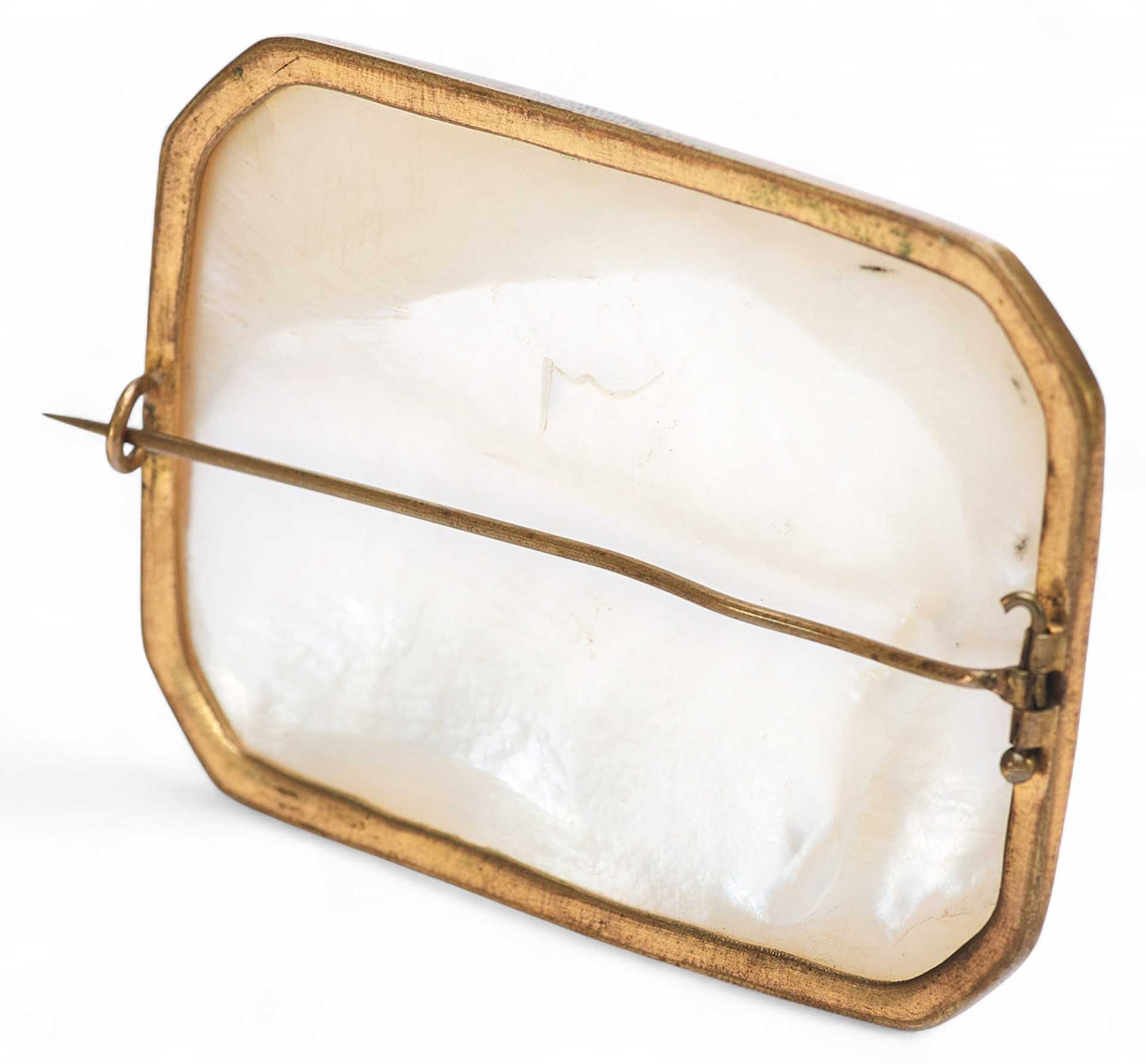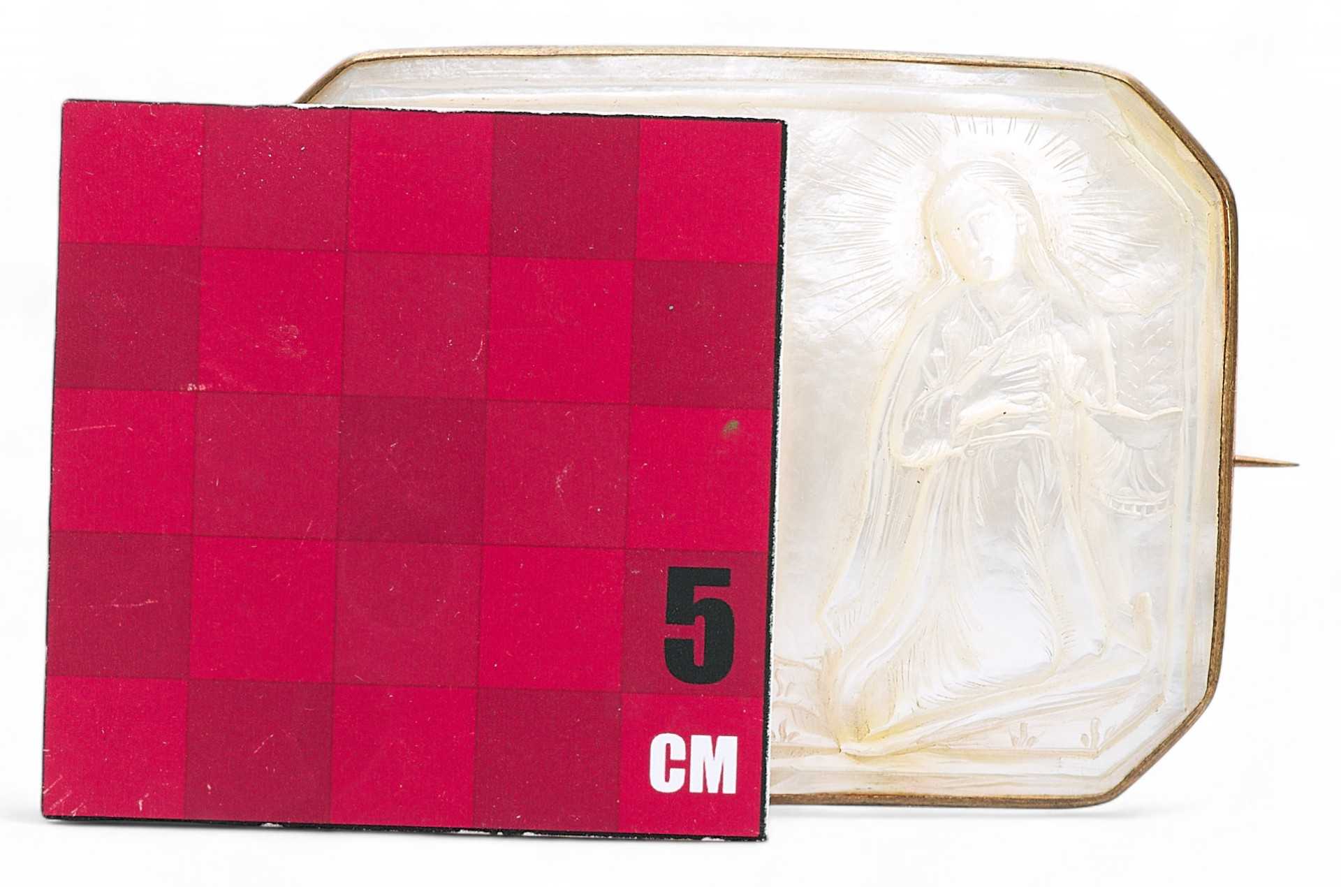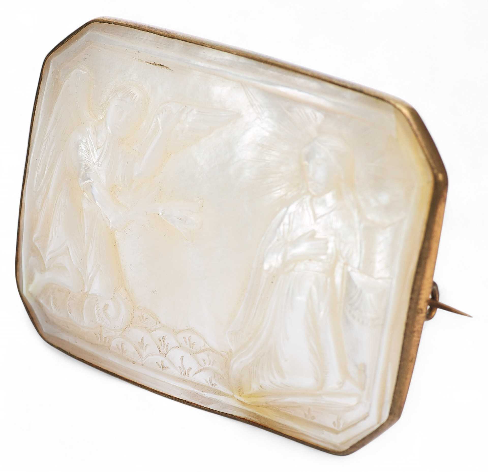 Евангельскими темами таких перламутровых иконок были: “Вознесение Господне”, “Тайная вечеря”, “Крещение Господа Иисуса Христа в Иордане” и другие религиозные сюжеты. Перламутровые раковины-иконки производили православные арабы Святой Земли в Вифлееме, преимущественно для русских паломников, вплоть до революции в России в октябре 1917 года. На Святой земле в художественных мастерских, располагавшихся при Русской Духовной миссии в Иерусалиме, работало немало и русских мастеров, которые изготавливали предметы для паломников из России. Выполняли здесь и перламутровые резные иконки-раковины с ликами русских святых, и большие иконы, инкрустированные перламутровыми резными пластинами, на которых изображали евангельские сюжеты. Брошь “Благовещение” — типичное произведение Вифлеемских художественных мастерских конца XIX — начала XX века.