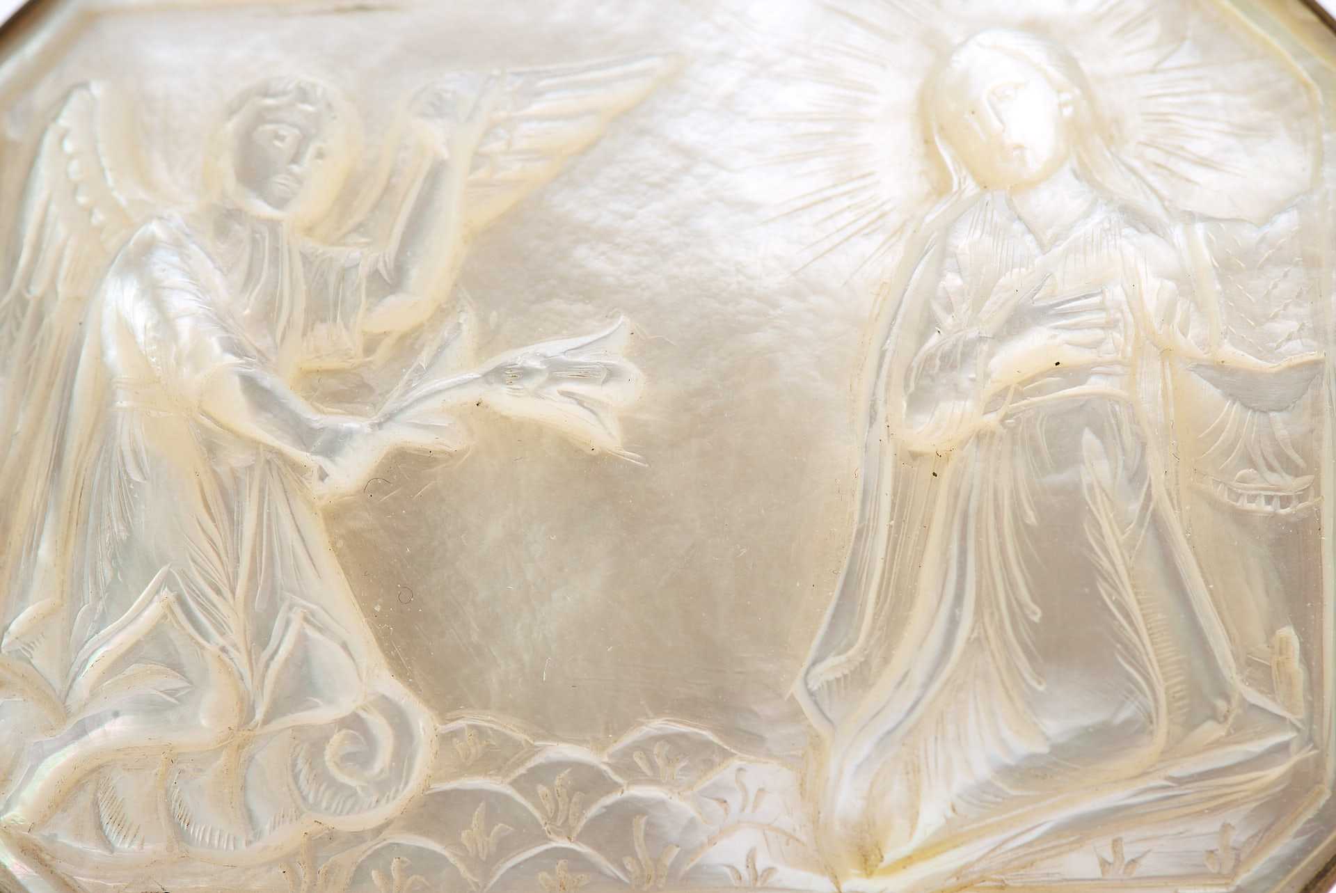 На перламутровой пластине прямоугольной формы со скошенными углами изображено Благовещение — евангельское событие и посвящённый ему христианский праздник: возвещение архангелом Гавриилом Деве Марии о будущем рождении по