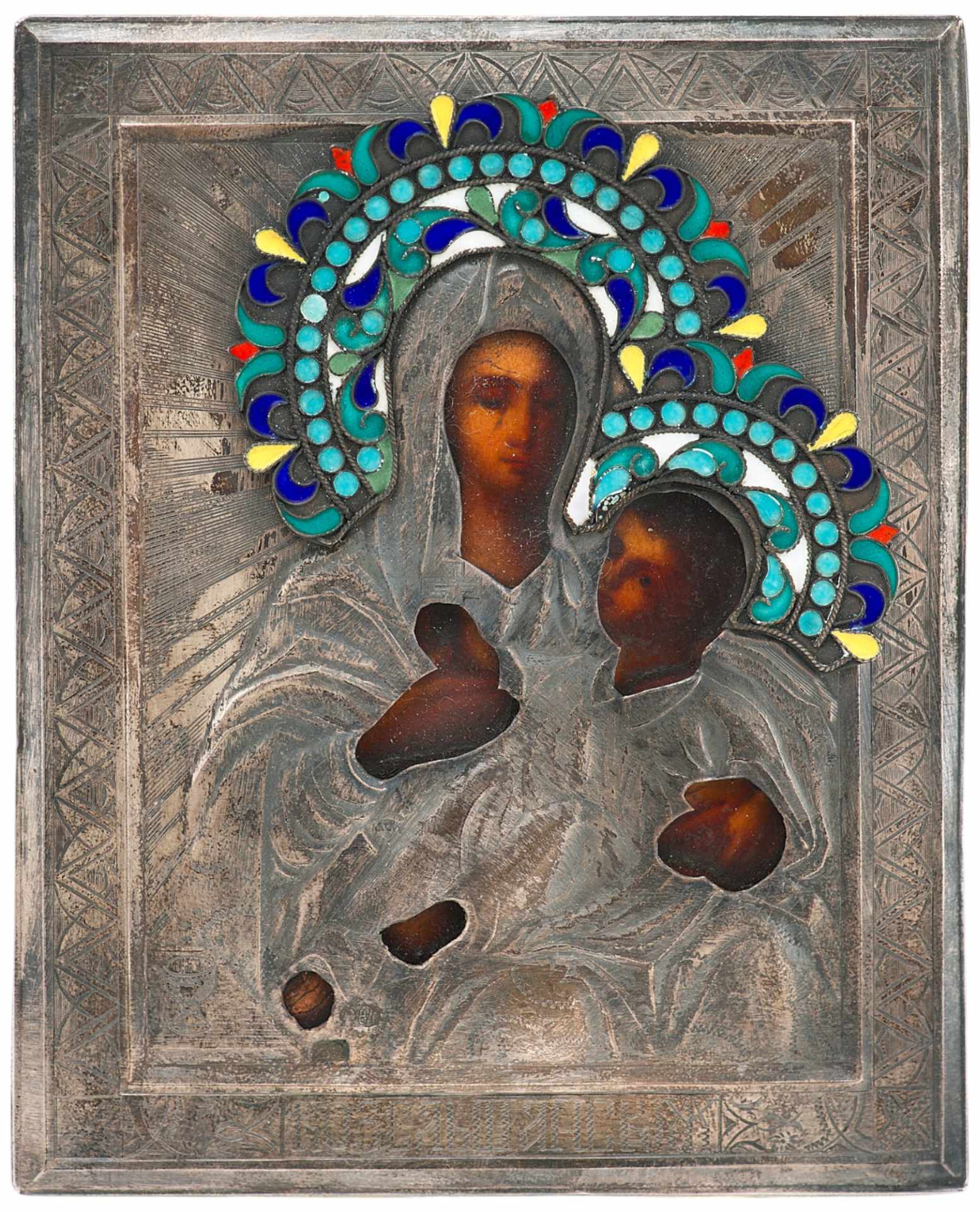 На окладе присутствуют клейма: пробирное клеймо московского управления с числом «84» (после 1908 года) и знак мастера Василия Сергеевича Сикачёва, владельца фабрики серебряных изделий в Москве (1883–1917). Эти клейма подтверждают время изготовления и происхождение предмета.