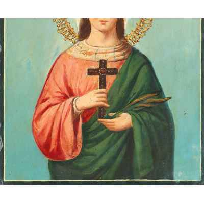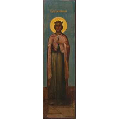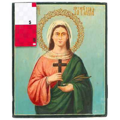 На иконе изображена святая Татьяна, в правой руке она держит крест, в левой - оливковую ветвь.