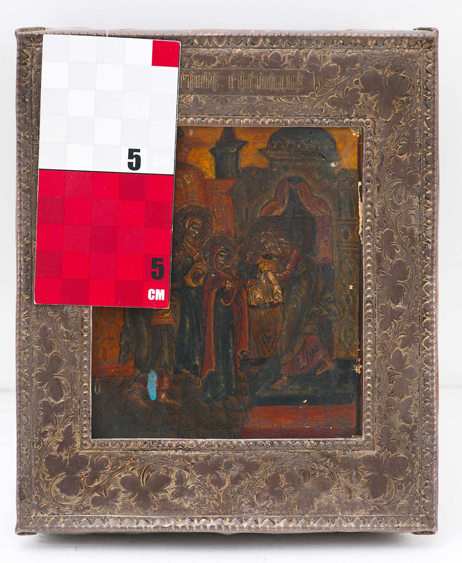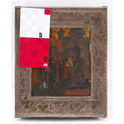 Икона заключена в оклад. Поля оклада украшены крупным растительным орнаментом. Оклад и манера живописи стилизованы под иконопись ХVІІ в. Сухость трактовки образов, жесткость контурных линий и общий темный колорит живописи подчеркивает их суровость и архаичность.