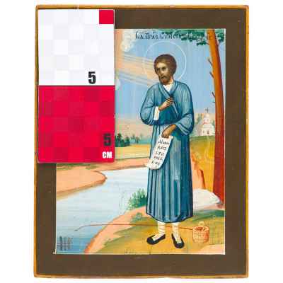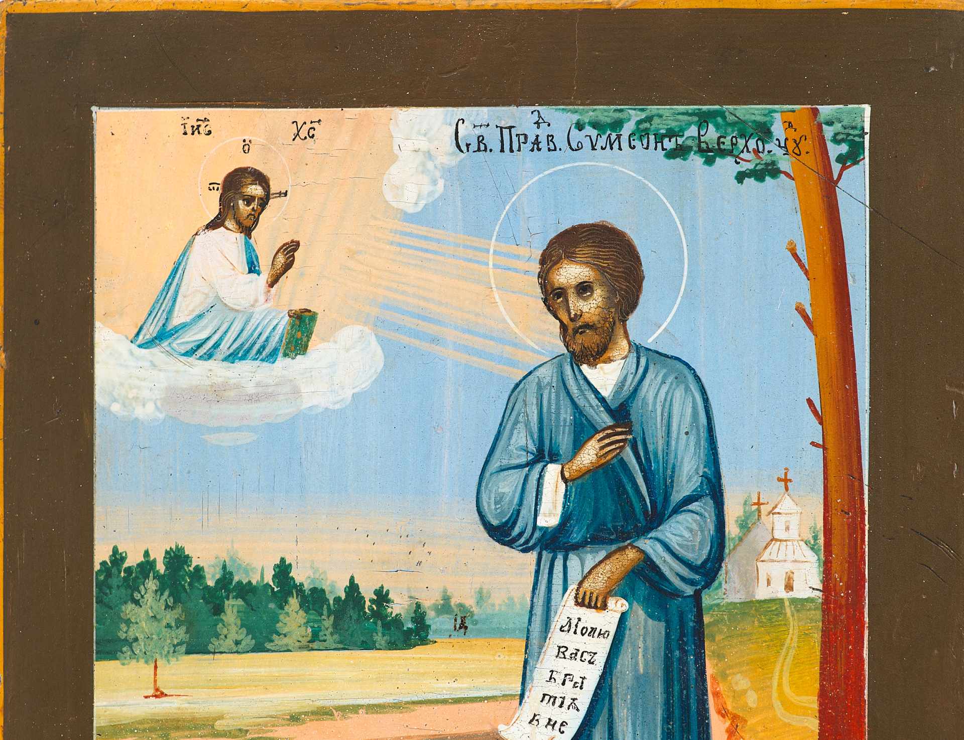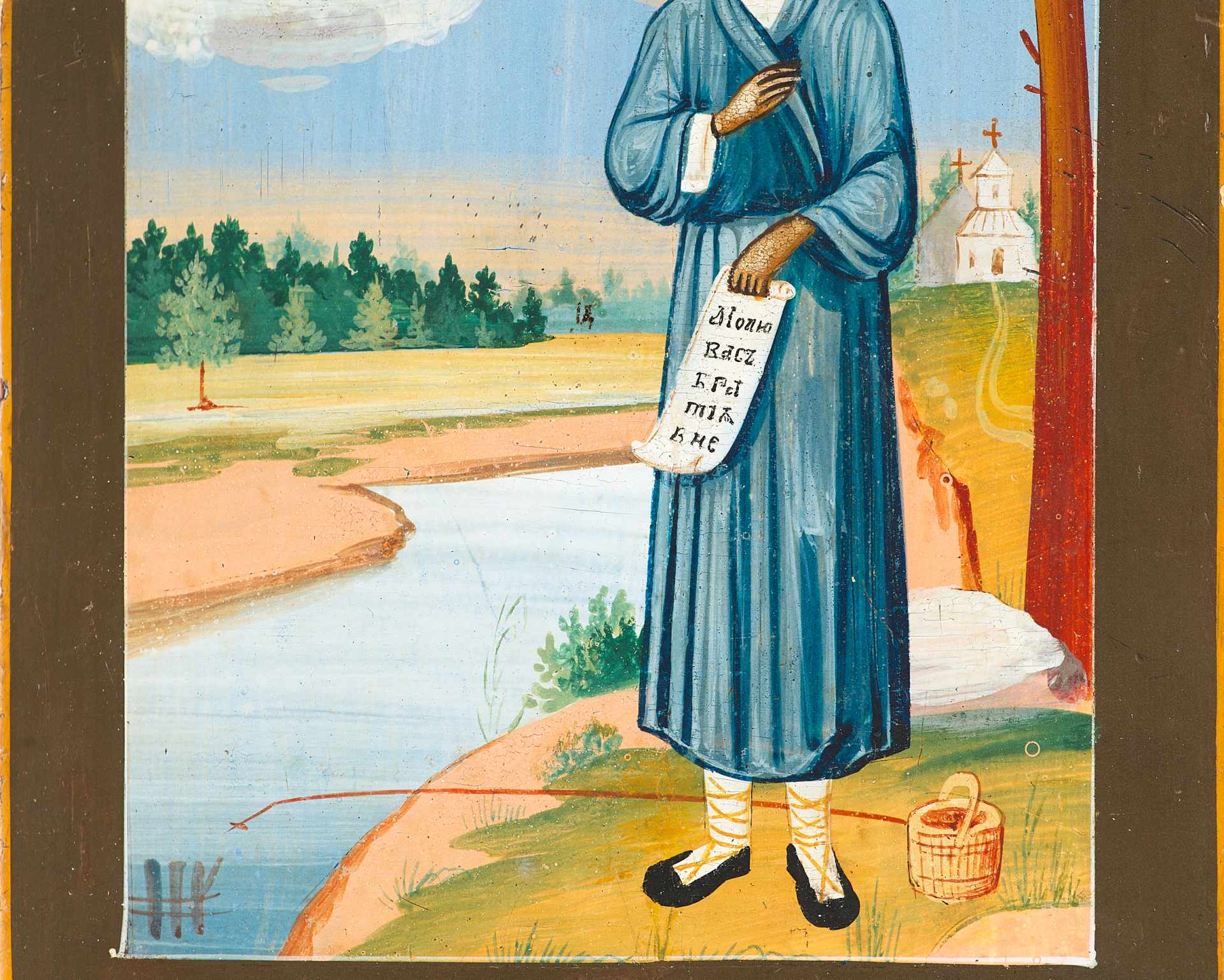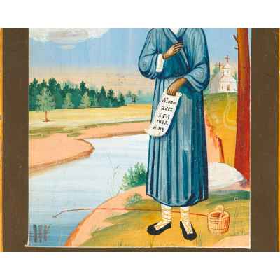 На иконе изображен святой на фоне пейзажа, держащий развернугый свиток.