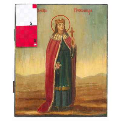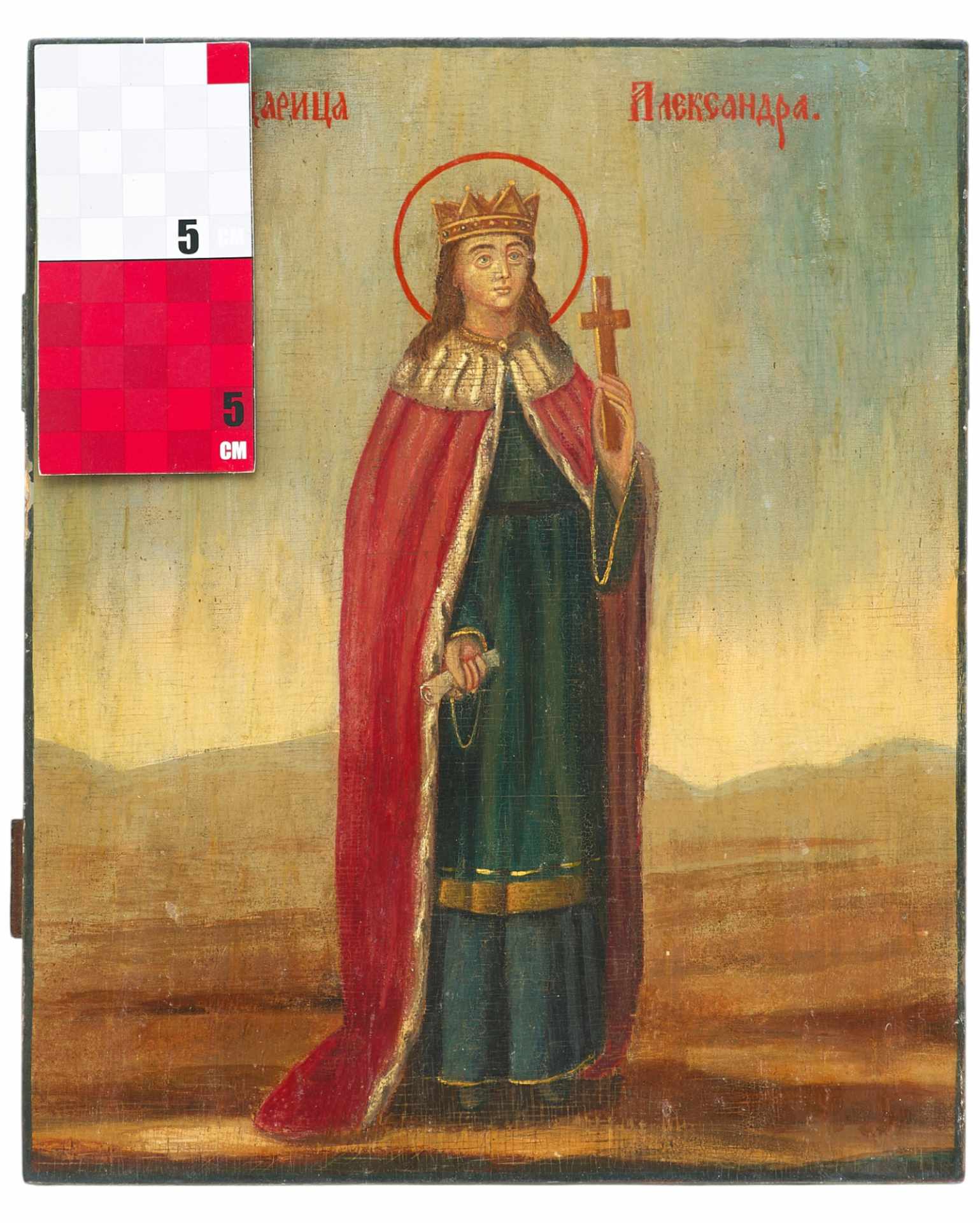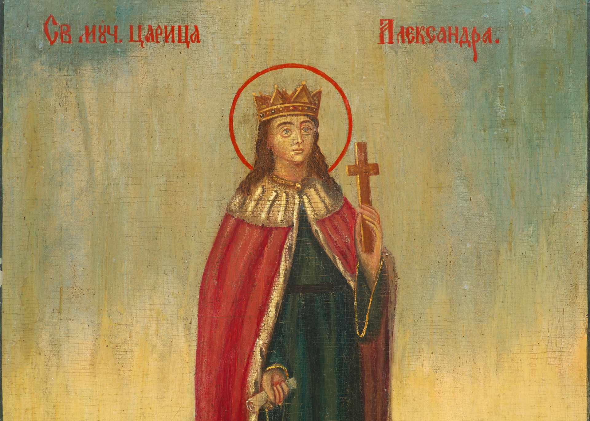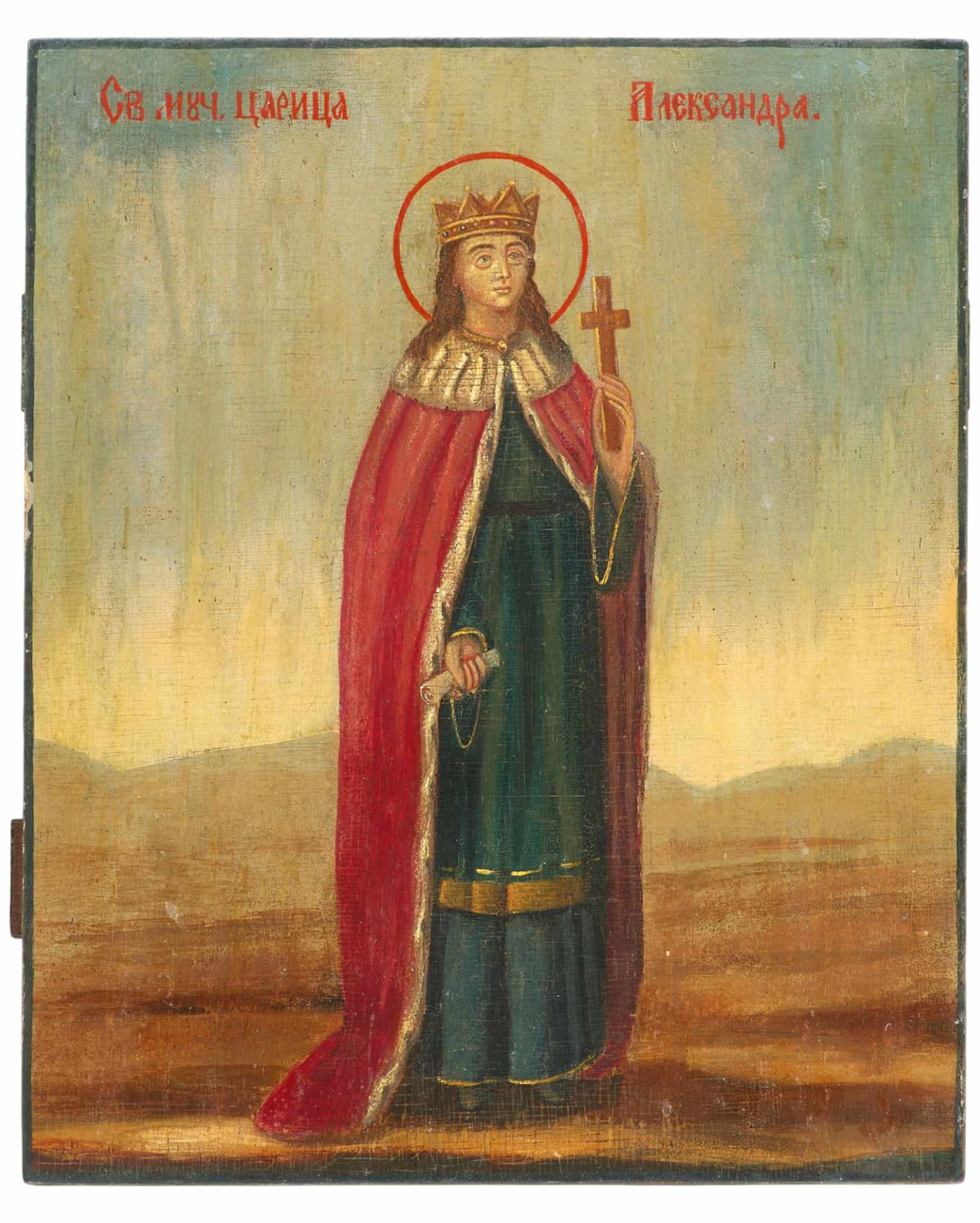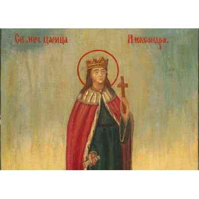 Александра Римская ( греч. АХессѵра, царица Александра', ?- 21 апреля 303 года) — христианская святая, почитаемая как мученица. Память совершается 23 апреля (по юлианскому календарю). Об Александре известно из жития Георгия Победоносца, в нём она называется царицей и женой императора Диоклетиана. Александра, видя страдания Георгия и неоднократную чудесную помощь ему от Бога, уверовала во Христа и открыто исповедовала свою веру. За это она была приговорена мужем к усечению мечом. По пути к месту казни Александра, устав, попросила воинов остановиться и, прислонившись к стене здания, мирно скончалась (по другой версии жития она, как и святой Георгий, была усечена мечом).