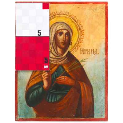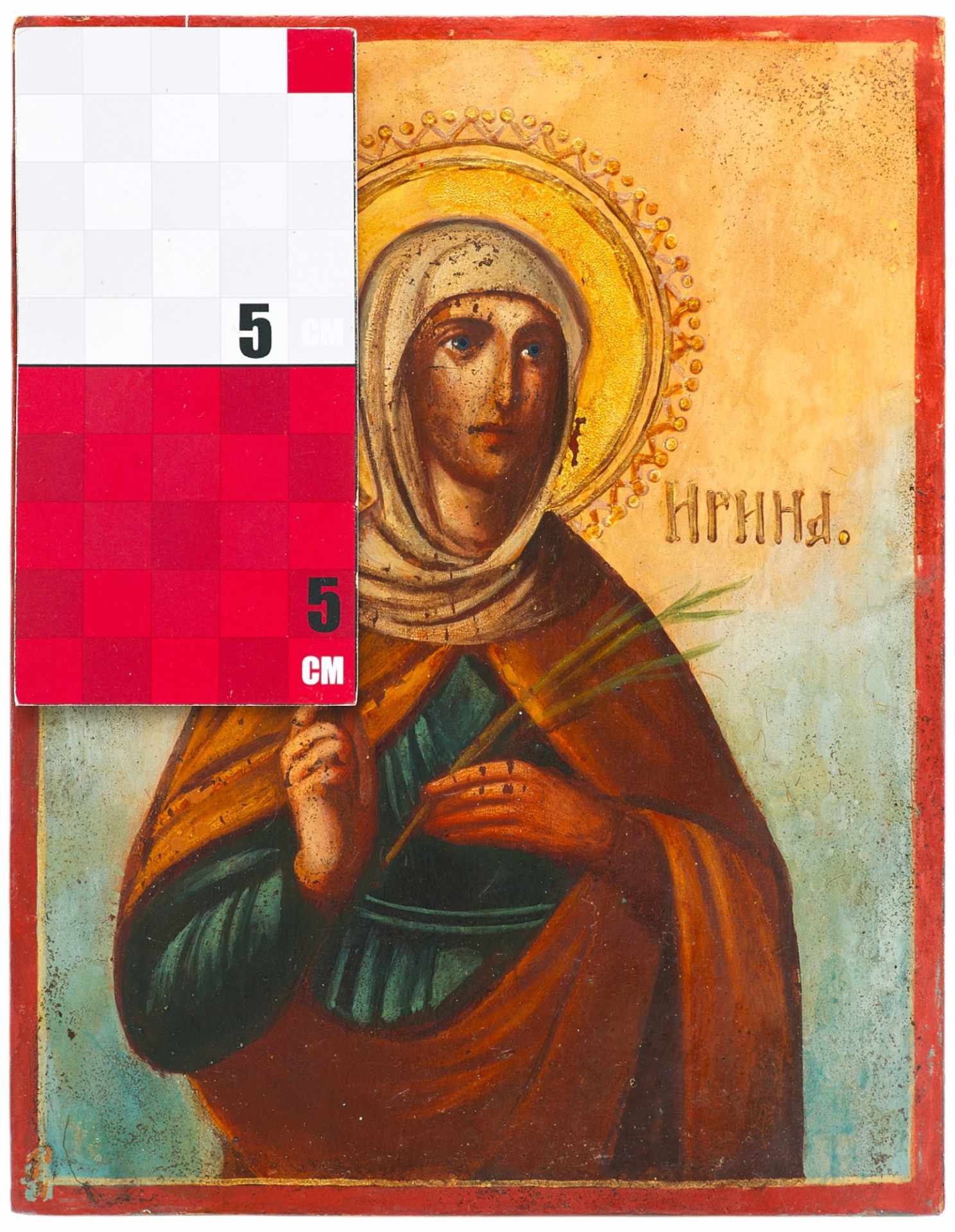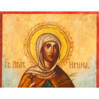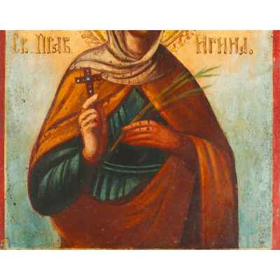 На иконе представлено поясное изображение святой праведной Ирины. В правой руке она держит крест, в левой оливковую ветвь. Лик святой изображен в трехчетвертном повороте.