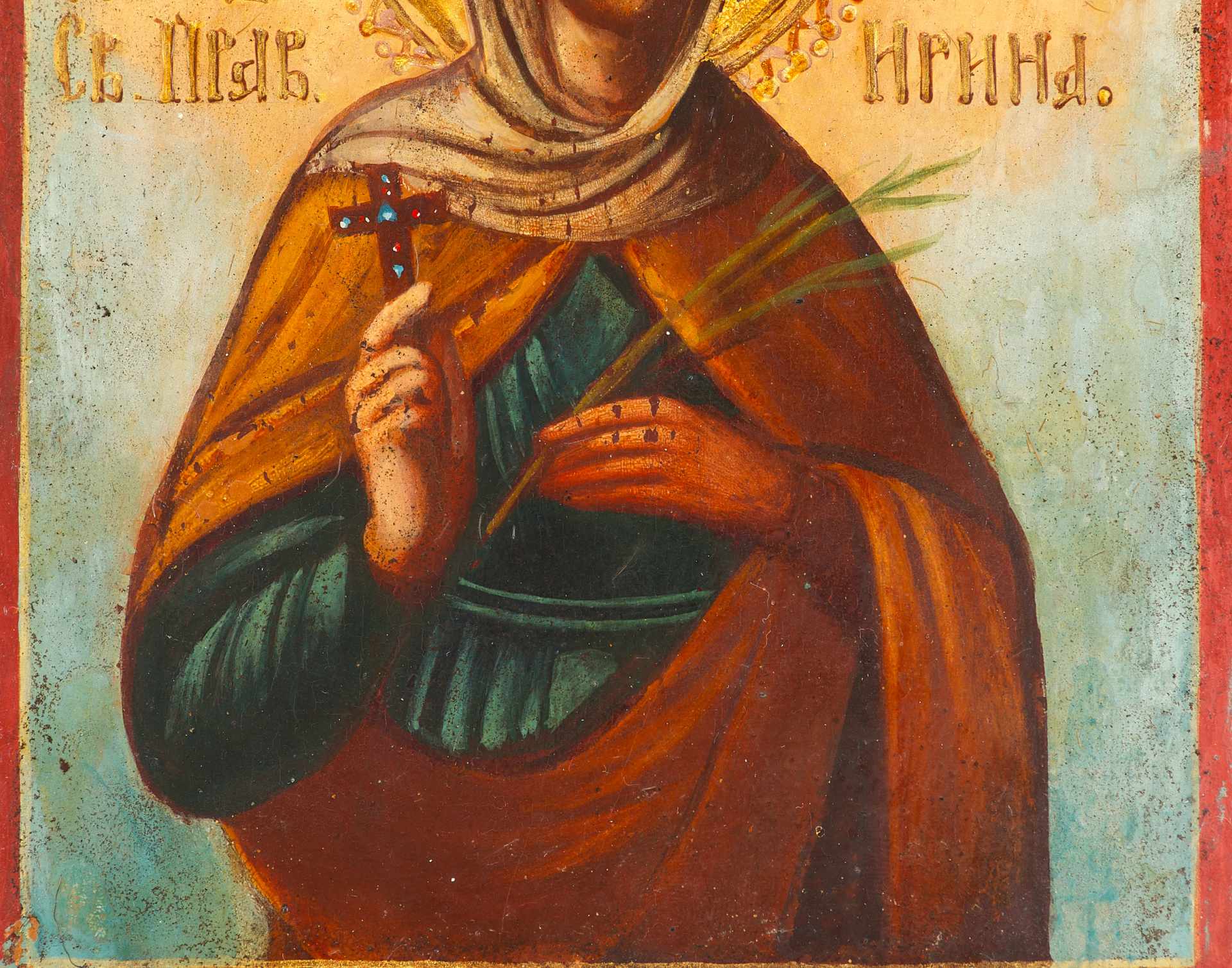 Святая праведная мученица Ирина пострадала в Греции в 258 году в день Святой Пасхи. Она жила вместе с другими христианами в пещере и проводила время в постоянных молитвах. По доносу язычников святая Ирина была схвачена воинами правителя и заключена в темницу. За безбоязненное исповедание Христа Истинным Богом святая Ирина приняла жестокие мучения. Ей отрезали язык, выбили зубы и, наконец, отсекли мечом голову.