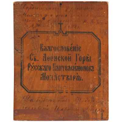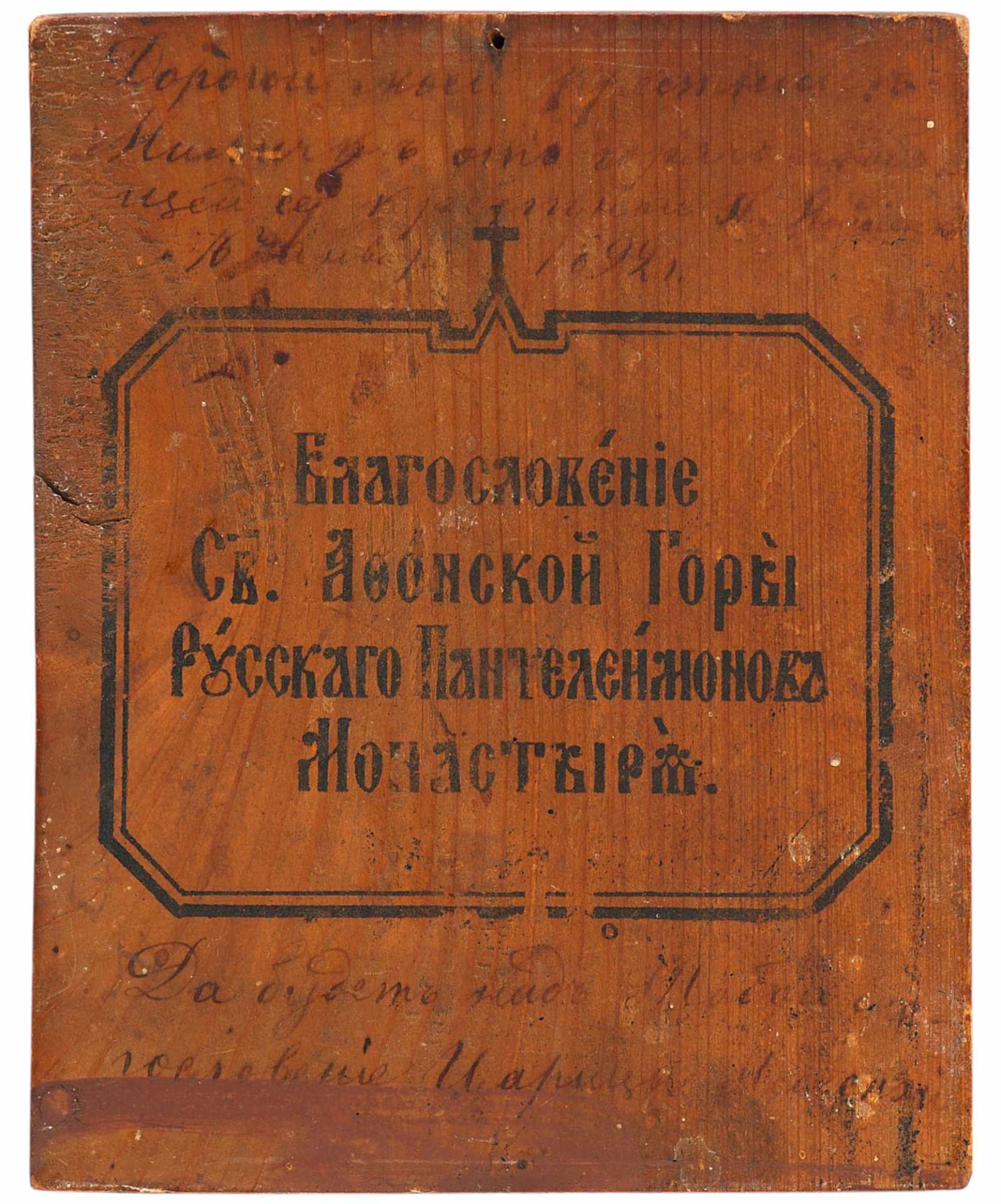 На обороте иконы также имеется штамп с надписью: «Благословеніе Св. Афонской Горы Русскаго Пантелеймонова Монастыря». На Святой Афонской горе существует 20 больших монастырей, множество скитов и келий. Одной из крупных афонских обителей является Пантелеймоновский монастырь, где и находится чудотворный образ святого.