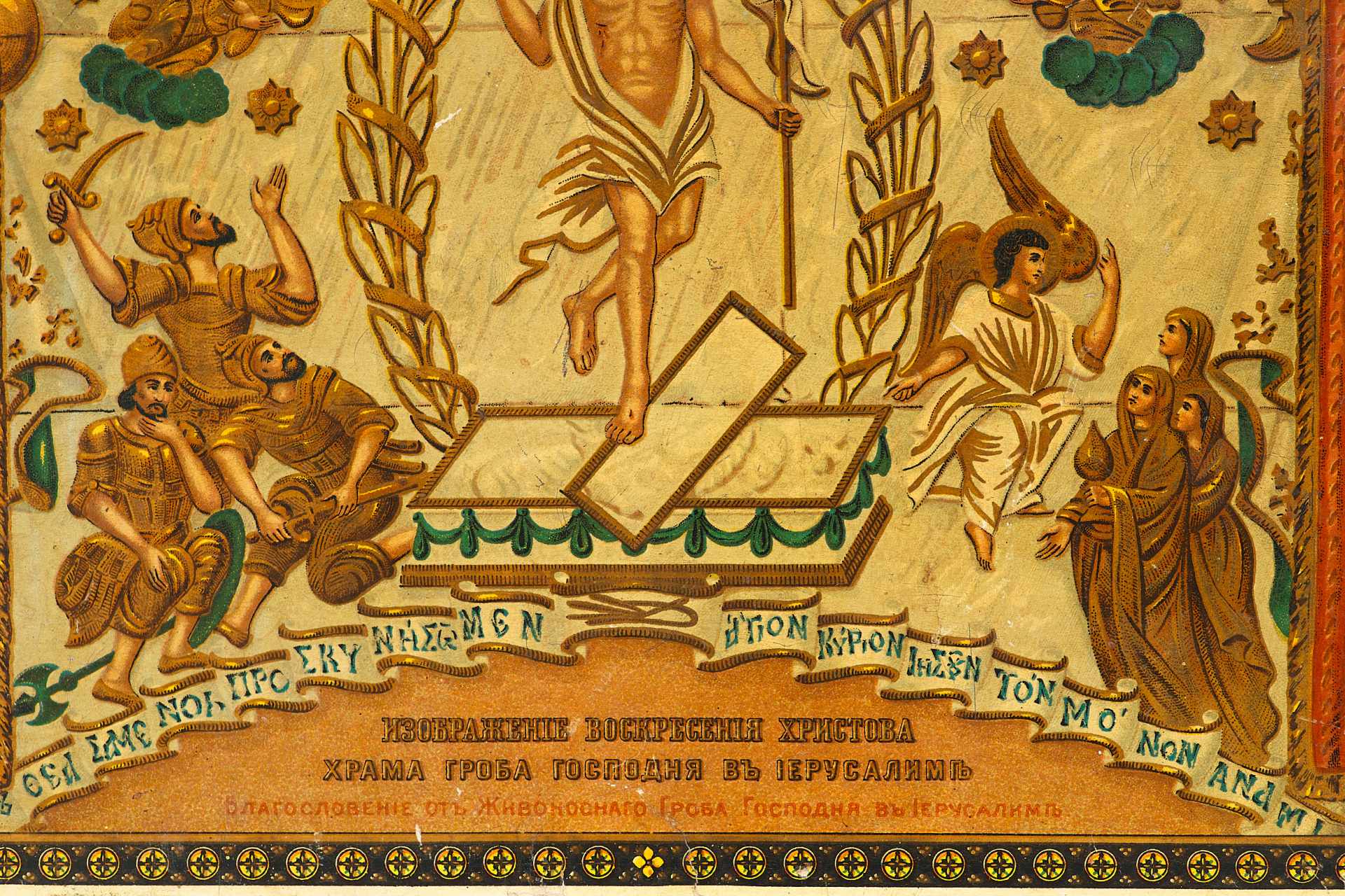 На иконе представлен благославляющий Христос, парящий над гробом . По сторонам - фигуры стражников, ангелы и жены-мироносицы. Воскресение Христово - один из главных христианских праздников. По преданию, на третий день после Распятия Христа Он воскрес. Светлое