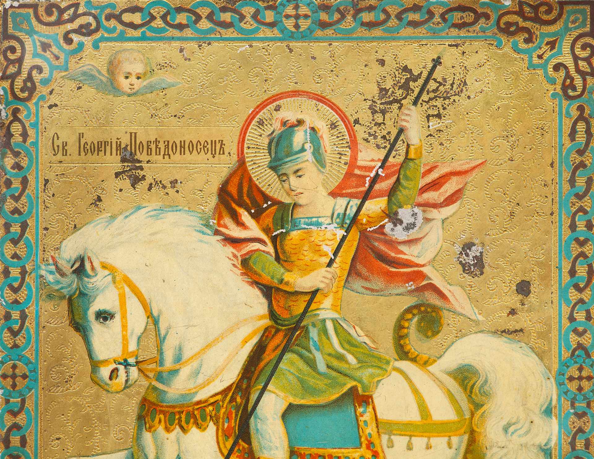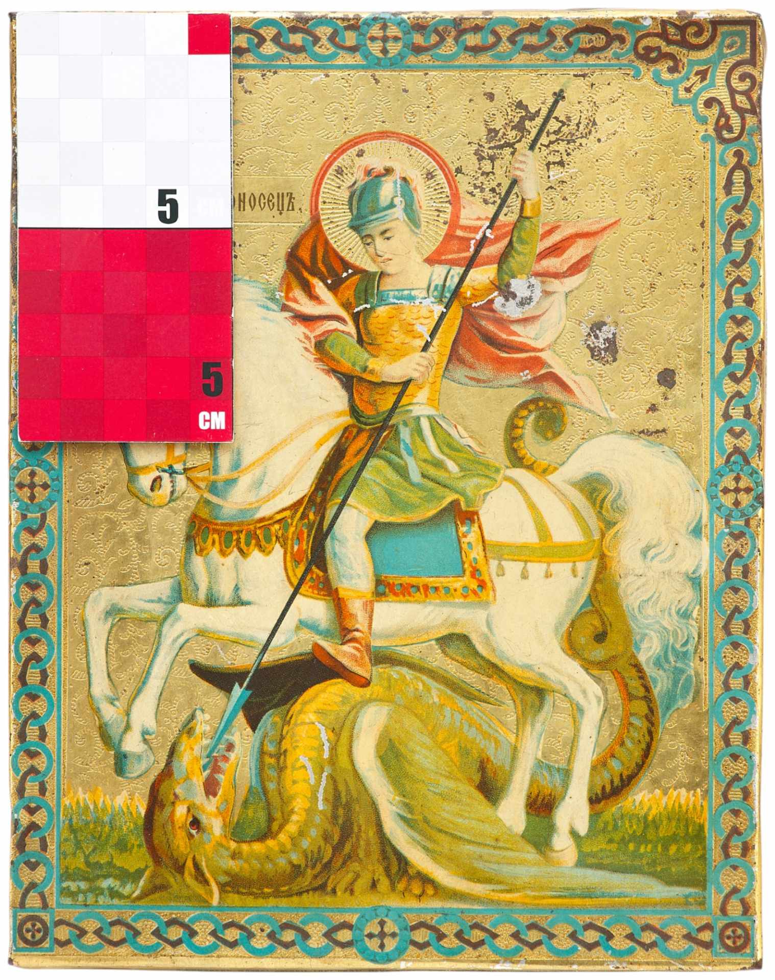 Икона выполнена в технике цветной литографской печати на жести.