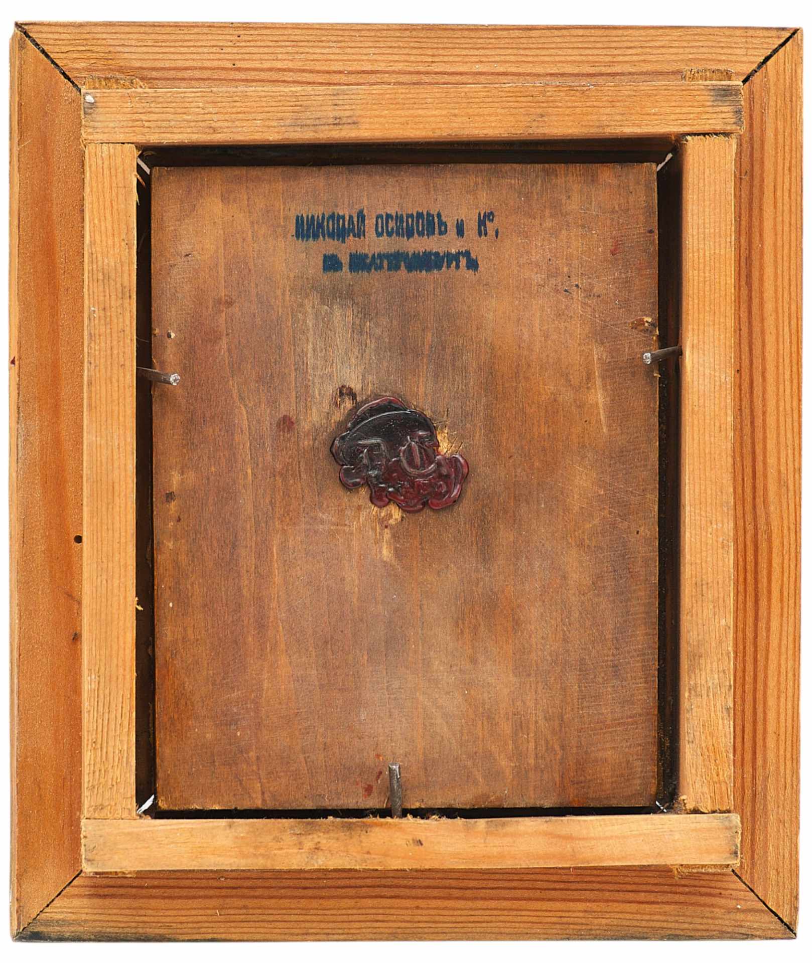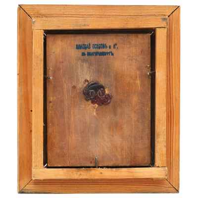 На оборотной стороне иконы в центре сурrучная печать с владельческой монограммой. Вверху штамп: "Николай Осиnовъ и К. в Екатеринбурге". Гранильная мастерская Николая Осипова нахолилась на углу Покровского проспекта и Колобовской улицы.