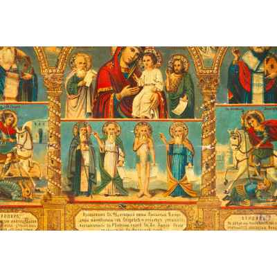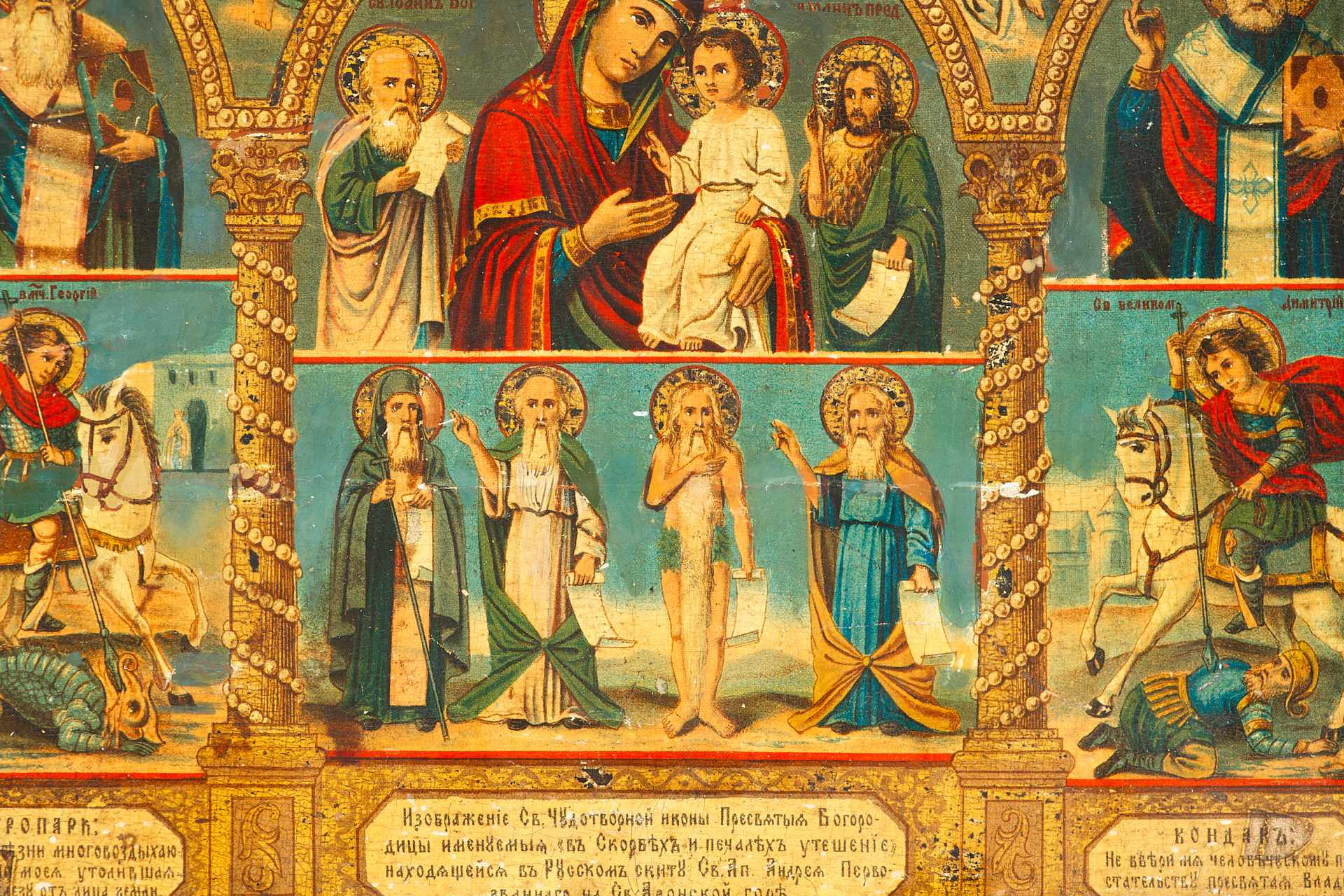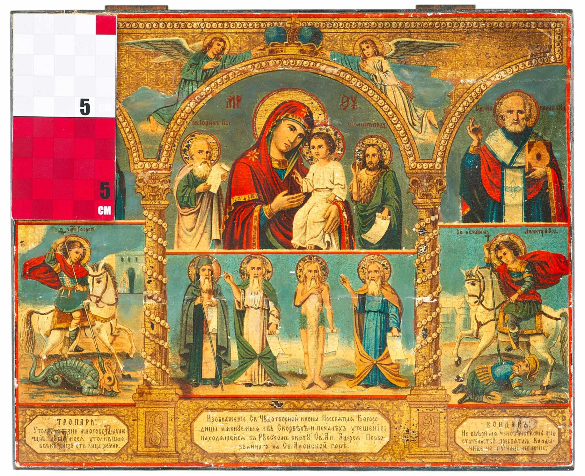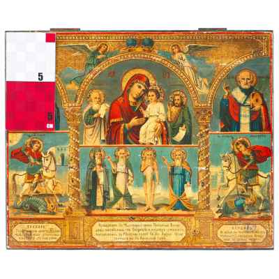 На иконе изображен сводчатый складень со святыми и Богоматерью и младенцем Христом в центре.
