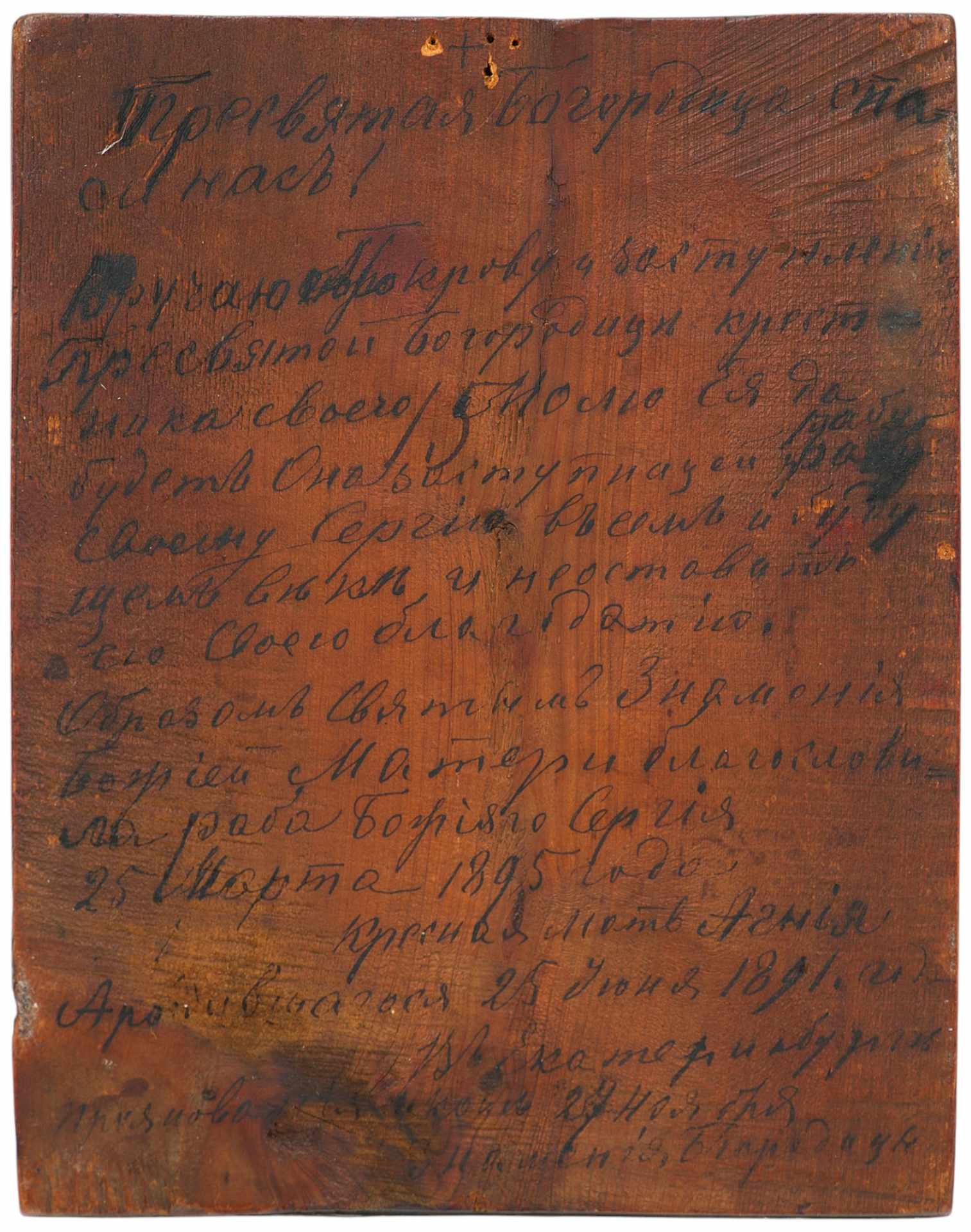 крестника своего. Молю Ея да будет Она заступницей рабу своему Сергuю въ семъ и будущ,емъ векамъ и неоставить его своею благодатию. Образомъ святымъ Знамения Божией Матери благословила раба Божия Сергия 25 марта 1895 года. Красная мать Агния Ародuвшагося 25 июня 1891 года Въ Екатеринбурге 27 ноября Знамения Богородицы ».