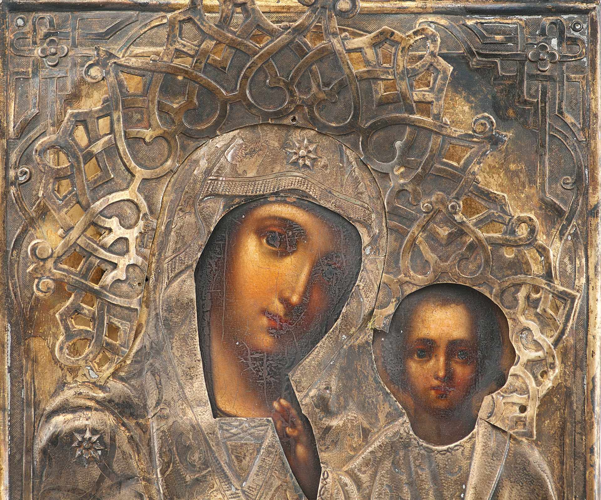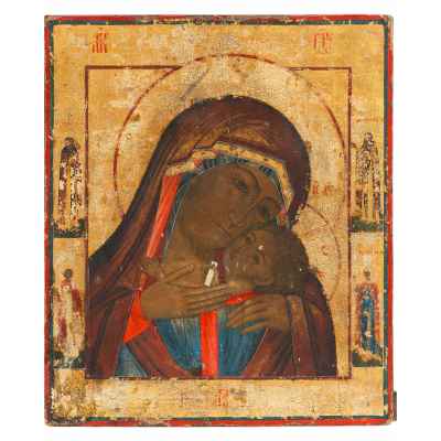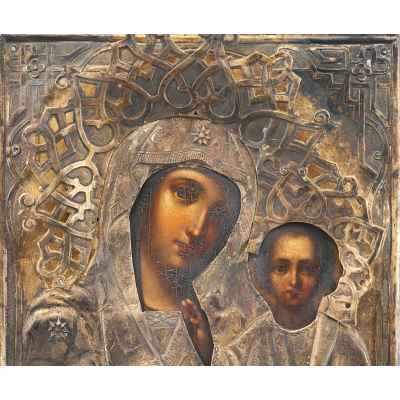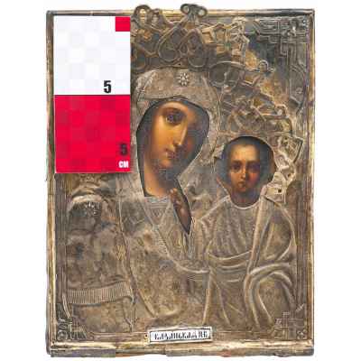 На иконе изображены - Богоматерь и поколенное изображение младенца Христа. Богоматерь Казанская одна из наиболее почитаемых на Руси икон Божьей Матери. Чудесное явление этой иконы совершилось в Казани в июле 1579 г. С чудотворной