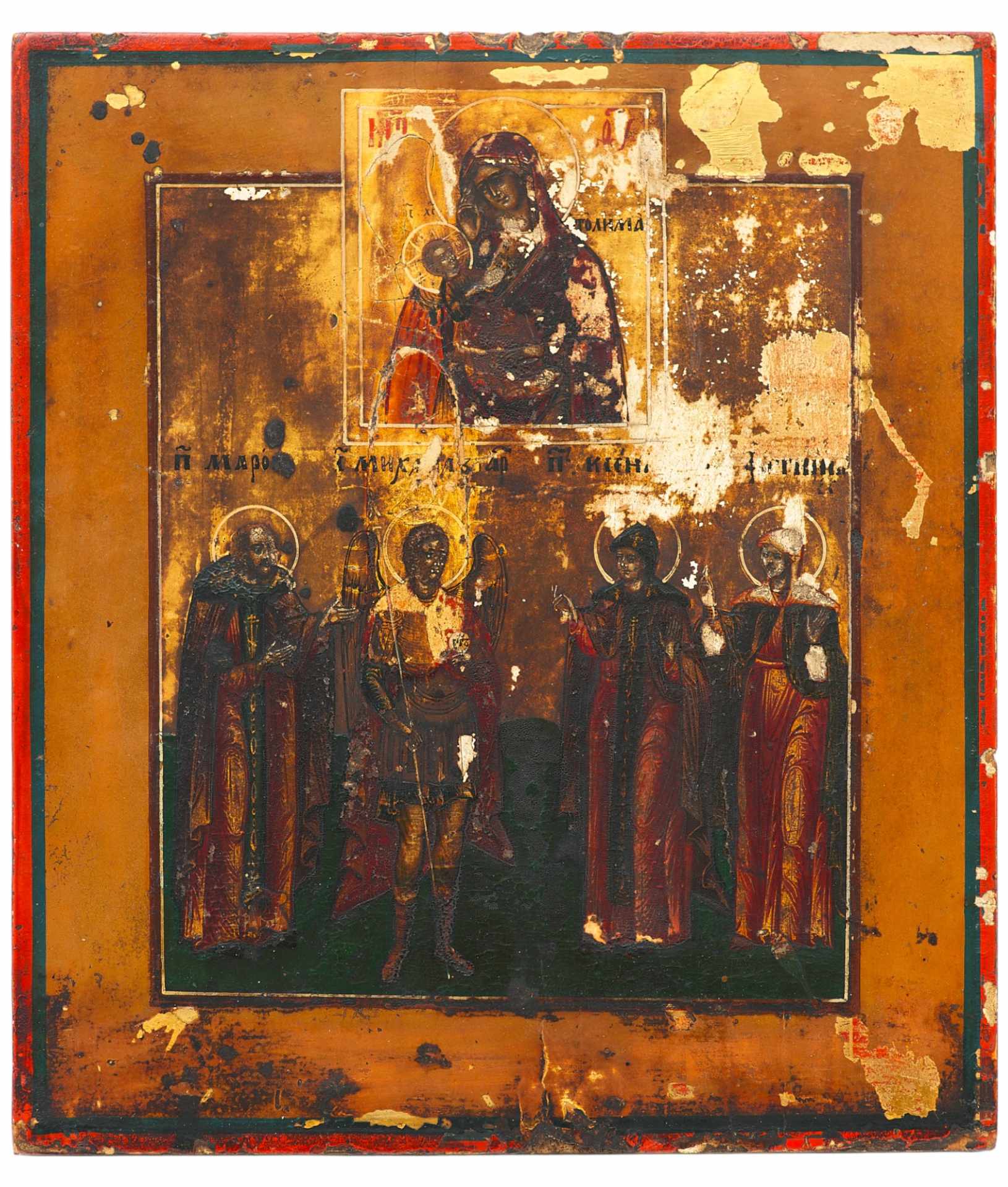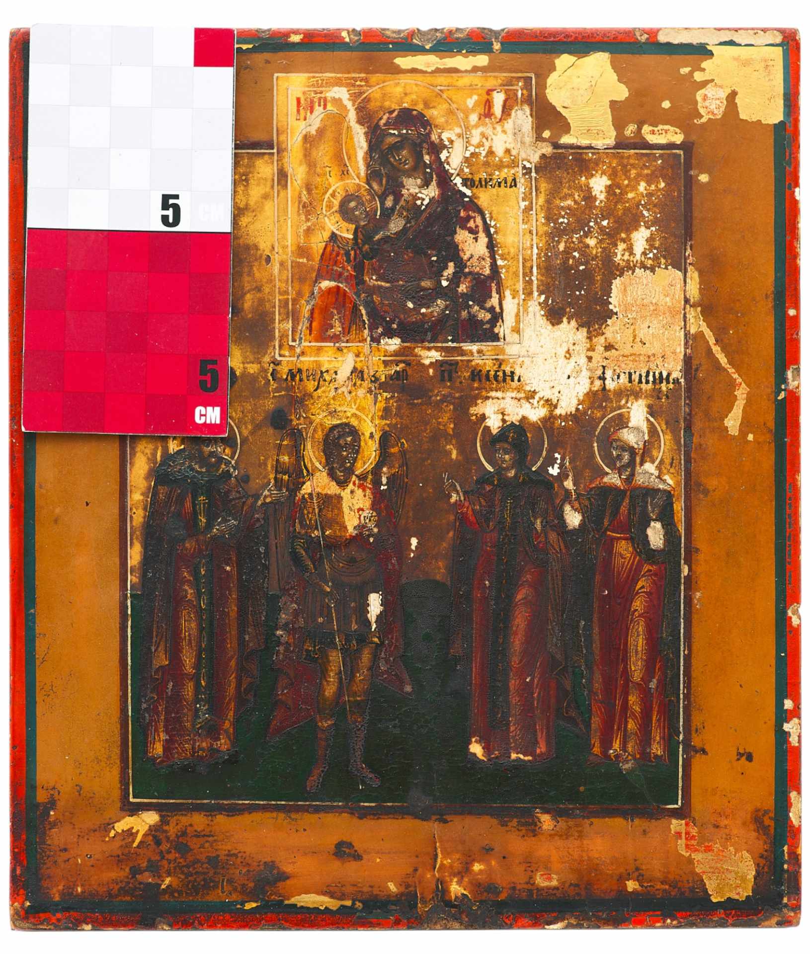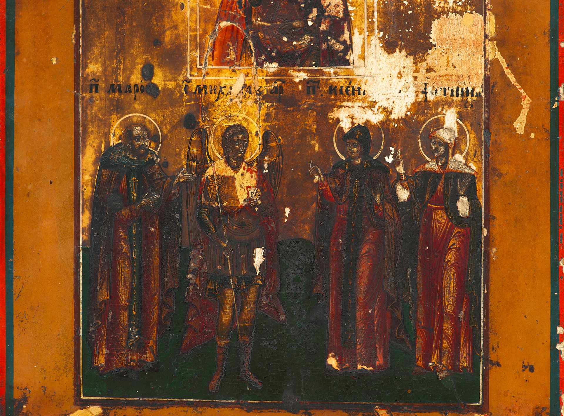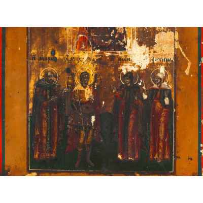 На иконе в молитвенном предстоянии изображены святые: преподобный Марон, архангел Михаил, святая блаженная Ксения и святая мученица Фотиния (Светлана). Судя по изображениям святых, возможно соименных членам семьи заказчика, можно предположить, что икона была написана на заказ.
