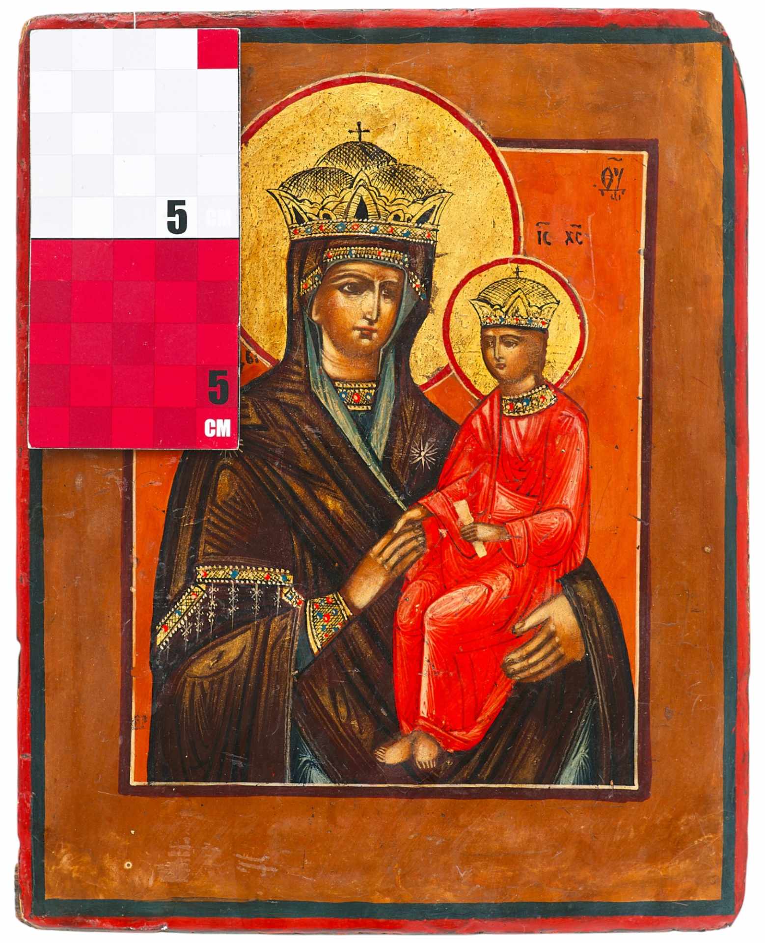 На иконе изображена Богоматерь младенцем Христом на левой руке. На головах у них — короны.