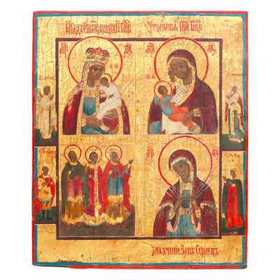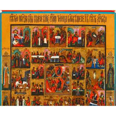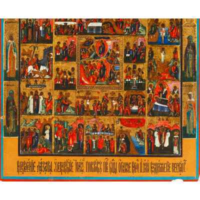 По краям 16 клейм: Рождество Богоматери, Введение во храм, Св. Троица, Благовещение, Рождество Христово, Сретенье, Богоявление, Вход в Иерусалим, Преображение, Вознесение, Успение, Воскресение Лазаря, Усекновение главы Иоанна Предтечи, Покров, Огненное восхождение пророка Илии, Воздвижение Креста.