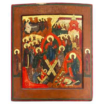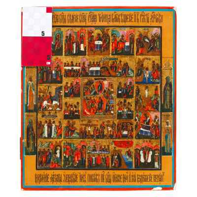Икона Воскресение Христово и Сошествие во ад с Двунадесятыми праздниками, избранными сюжетами и Страстями 31,2x26,5 см. XIX век