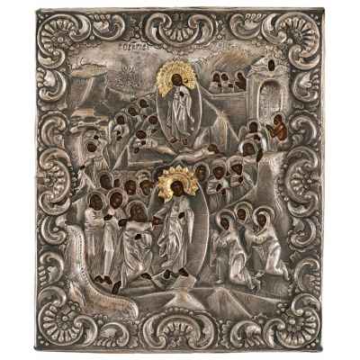 В среднике иконы — “Воскресение Христово - Сошествие во ад”, где изображены парящий над гробом Христос, сидящий ангел у гроба и жены мироносицы. Ниже изображён Иисус Христос на фоне лучистой славы. Он стоит над бездной ада, под ногами у него - разрушенные врата ада. Вокруг спасителя праотцы, пророки, Адам и Ева.