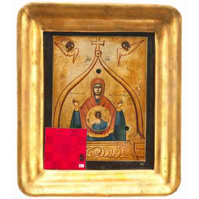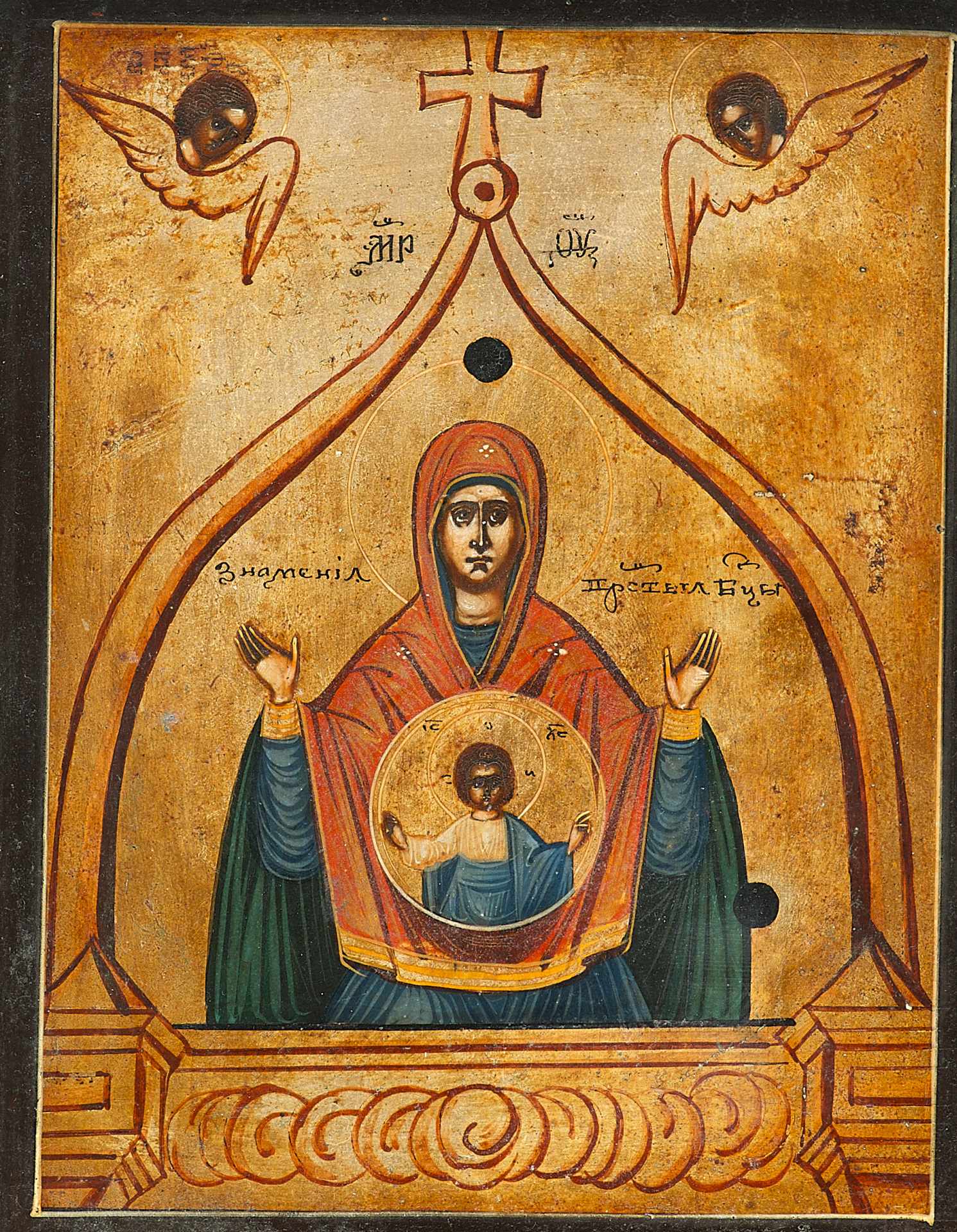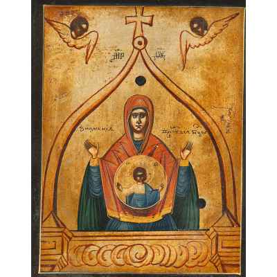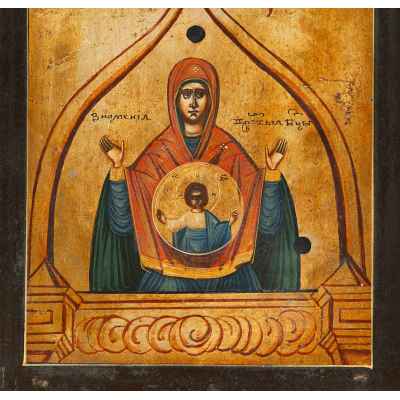 Это поясной варианr иконографического типа Великой Панагии. Тип изображения Богоматери основан на пророчестве Исайи, который предсказал воплощение Сына Божия в человеческом образе. На Руси появилась в XII веке, а именоваться так стала после чудесного знамения новгородской иконы.