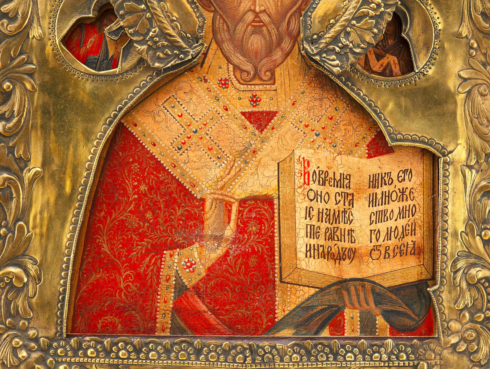 На иконе святой Николай предстаёт полным суровой сдержанности. Покрытый густой сетью морщин лик строго вглядывается в молящегося. Еще при жизни святителя людей к нему привлекала редкая его доброта: он приходил на помощь всем, кто обращался к нему, и к тем, о несчастьях кого случайно узнавал. И все свои благодеяния Николай старался творить тайно, славы не искал. С конца XV - начала XVI в. Николай считается покровителем Московской земли. Праздник Николая Чудотворца установлен 9(22) мая и 6(19) декабря.