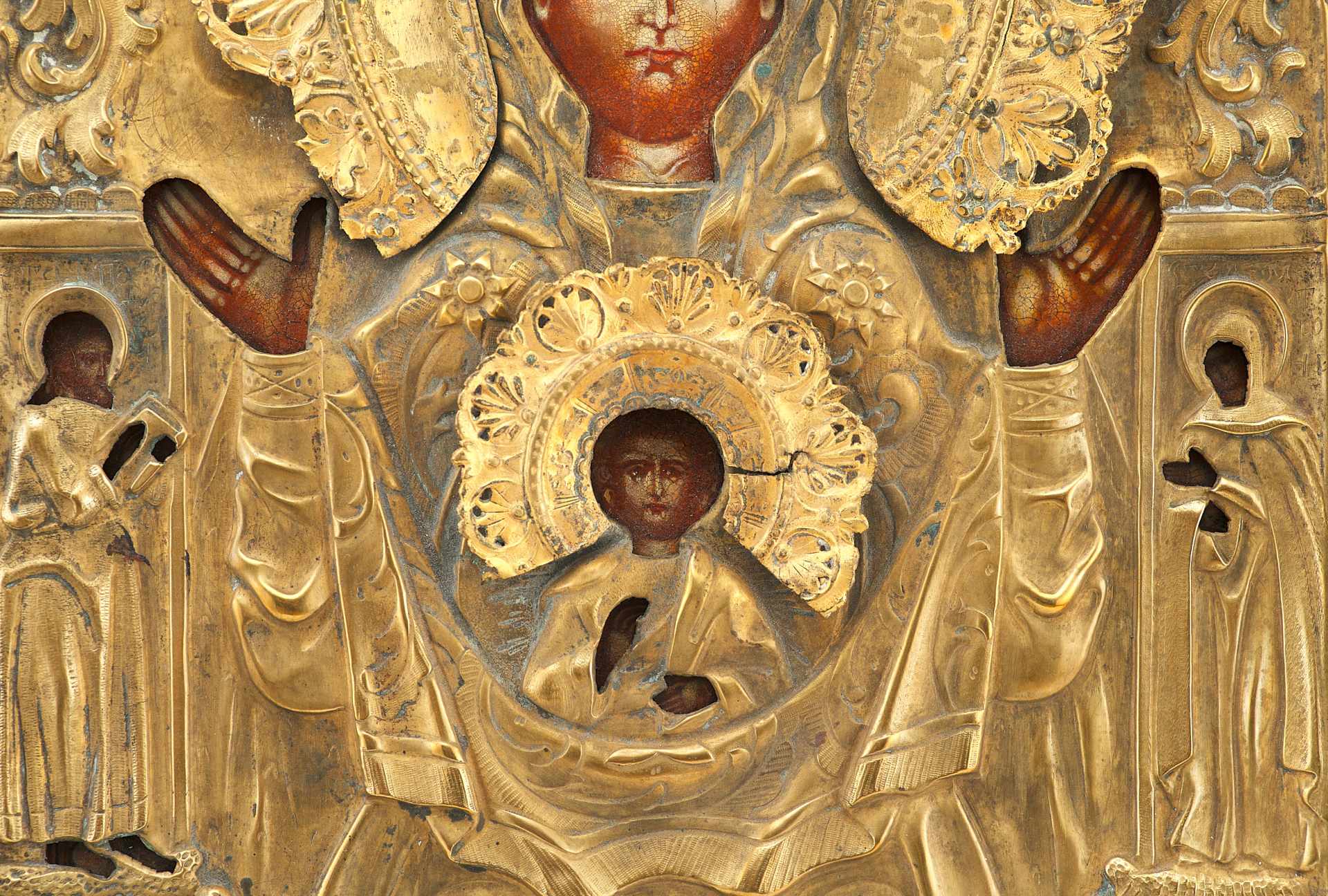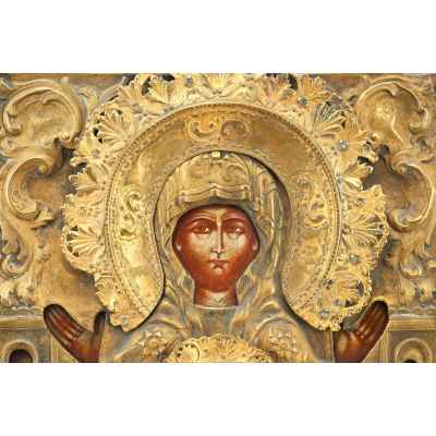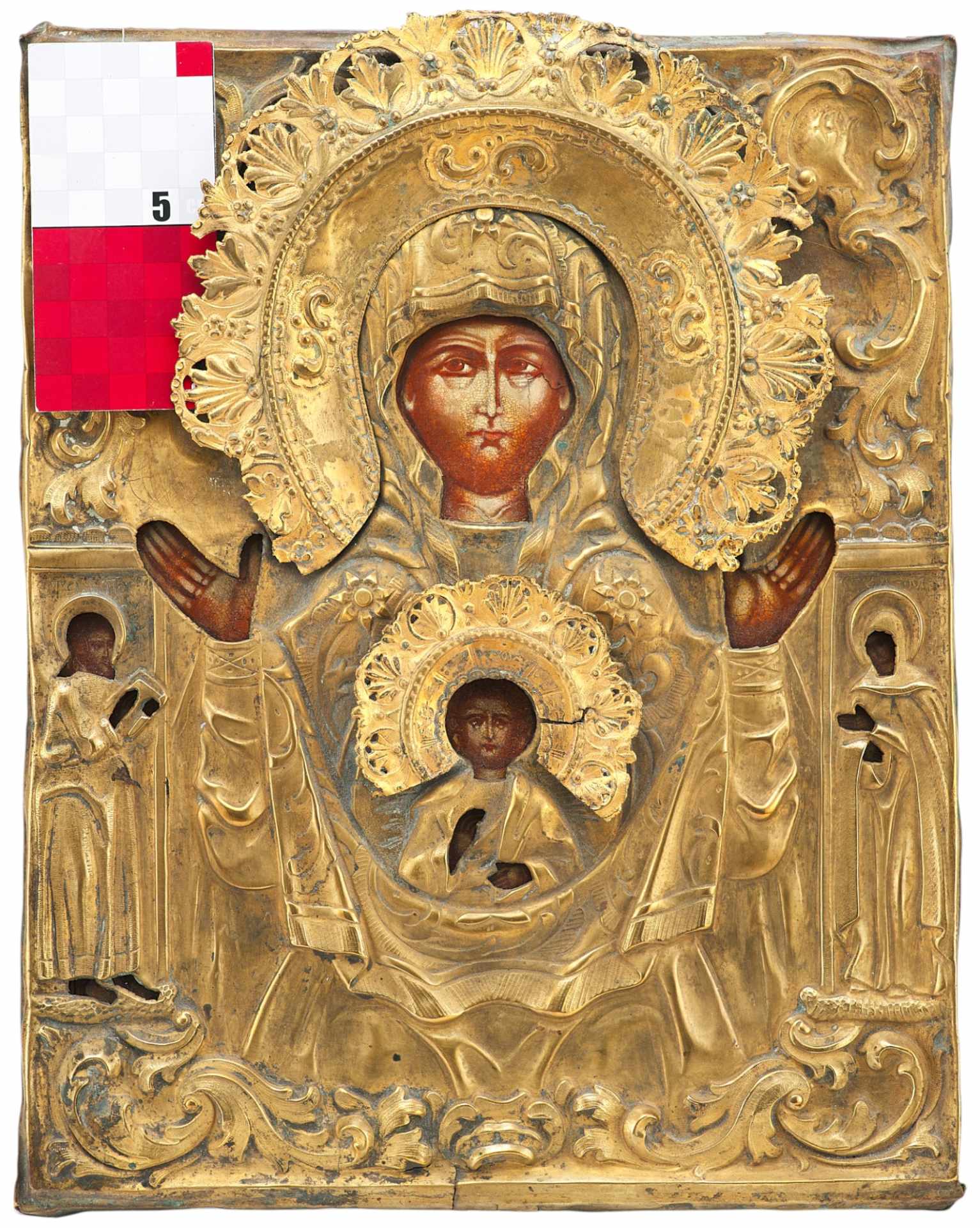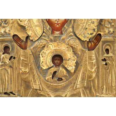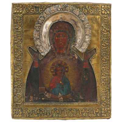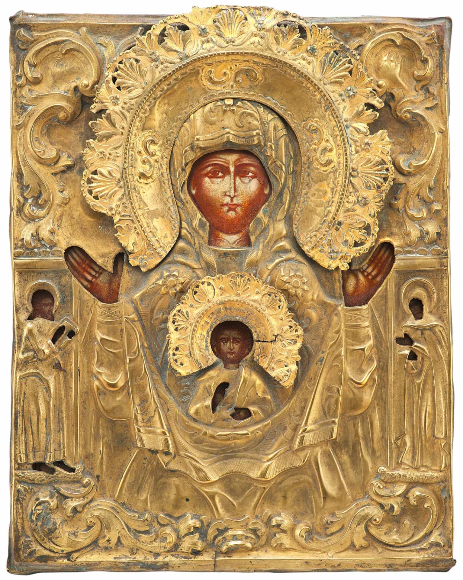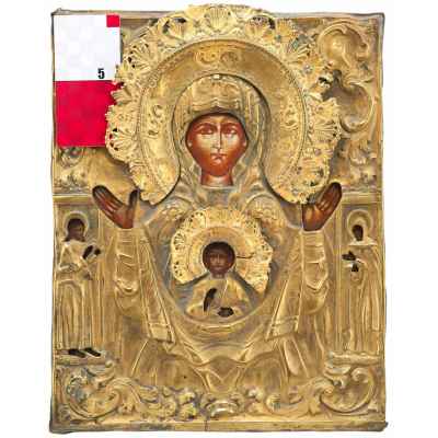 Икона в окладе Богоматерь Знамение латунь, золочение 1860-е г. 32,5x25,5 см. 1860-е г