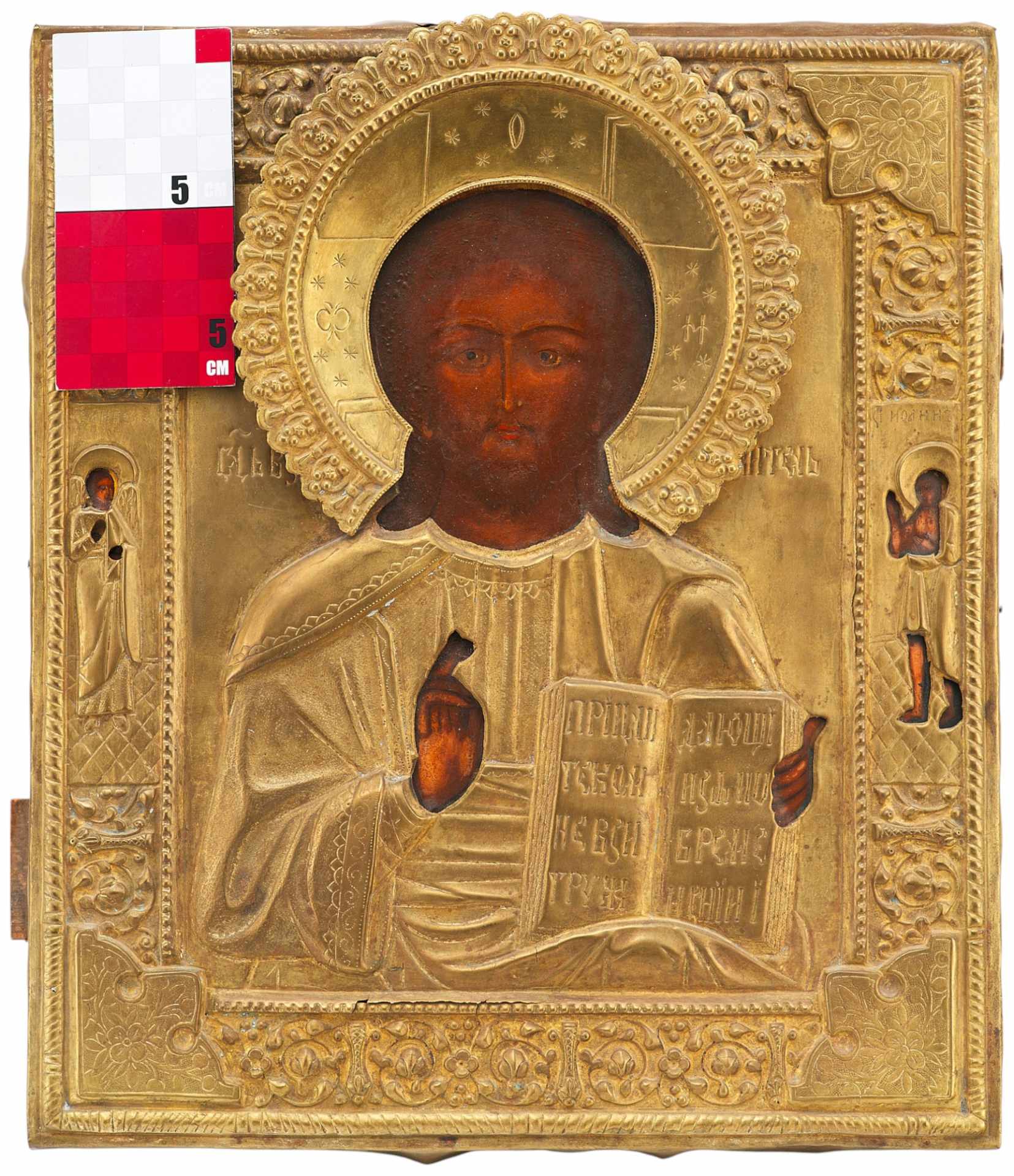 Евангелие в руках Христа открыто. На открытых страницах надпись: «Приидите ко мне ecи Нуждающиеся».