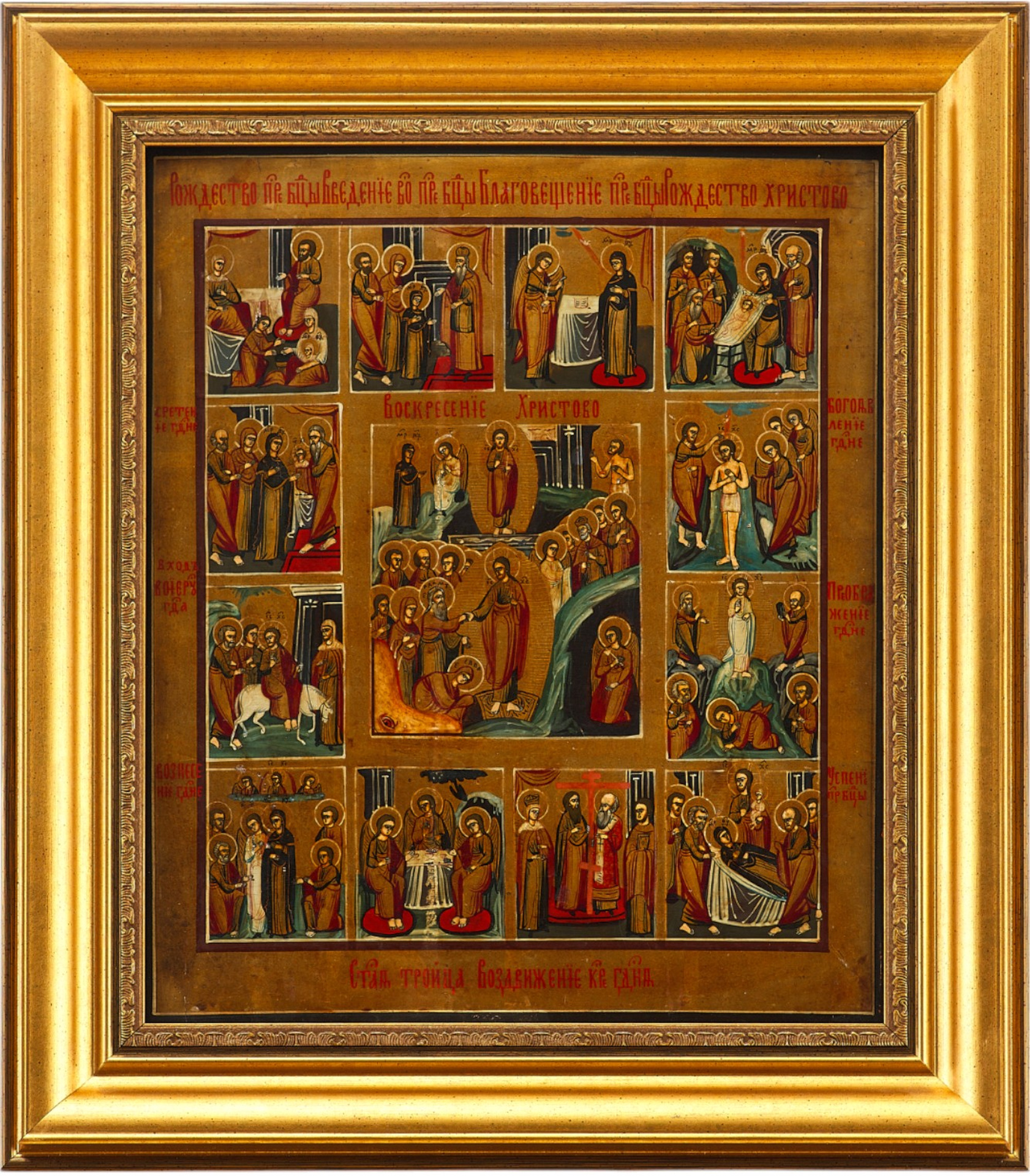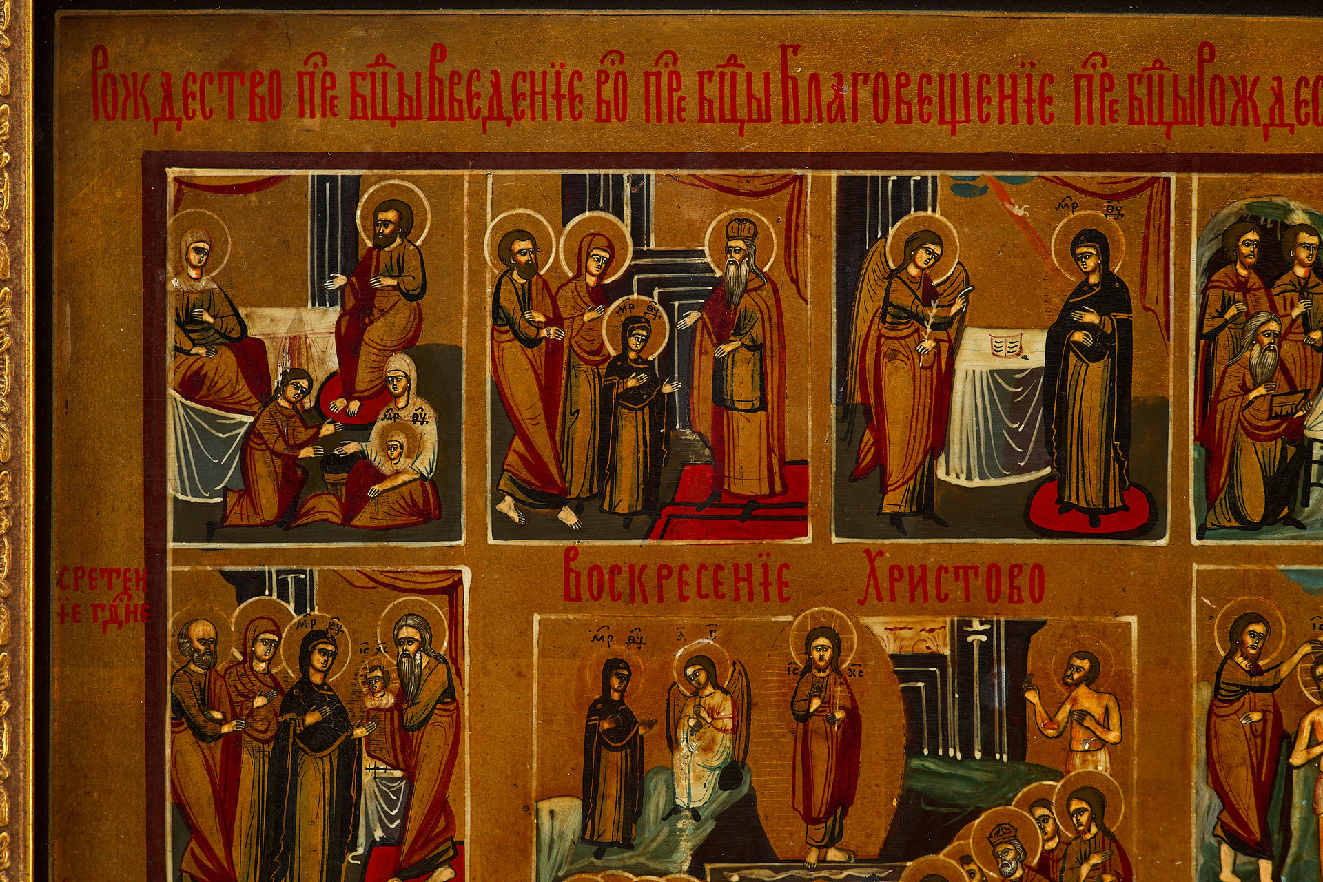Икона «Воскресение Христово с двунадесятыми праздниками» является ярким примером русской иконописи конца XIX века, выполненной в традиционном каноническом стиле. Она представляет собой сложную композицию, включающую центральное изображение Воскресения Христова — Сошествия во ад, окружённое двенадцатью клеймами, иллюстрирующими важнейшие евангельские события, получившие название Двунадесятых праздников.