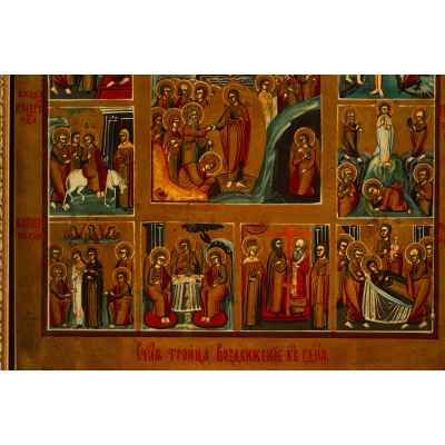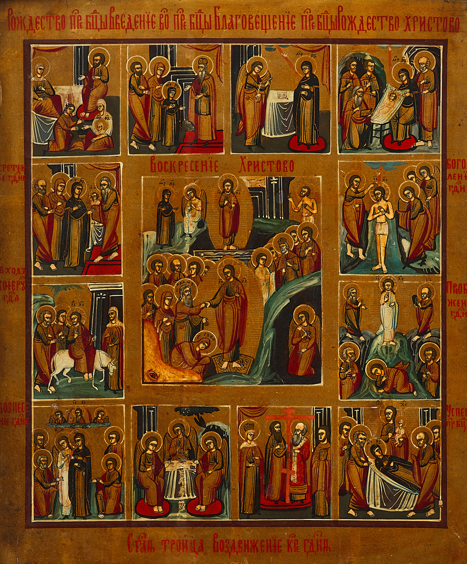 Сюжетная структура охватывает ключевые моменты земной жизни Христа и Богородицы: от Рождества Богоматери до Успения Пресвятой Девы. Среди них: Введение во храм, Благовещение, Рождество Христово, Сретение, Крещение, Вход в Иерусалим, Преображение, Вознесение, Пятидесятница (Троица), Воздвижение Креста Господня. Эти сцены не только иллюстрируют литургический год, но и служат визуальным напоминанием о спасительном пути Христа.
