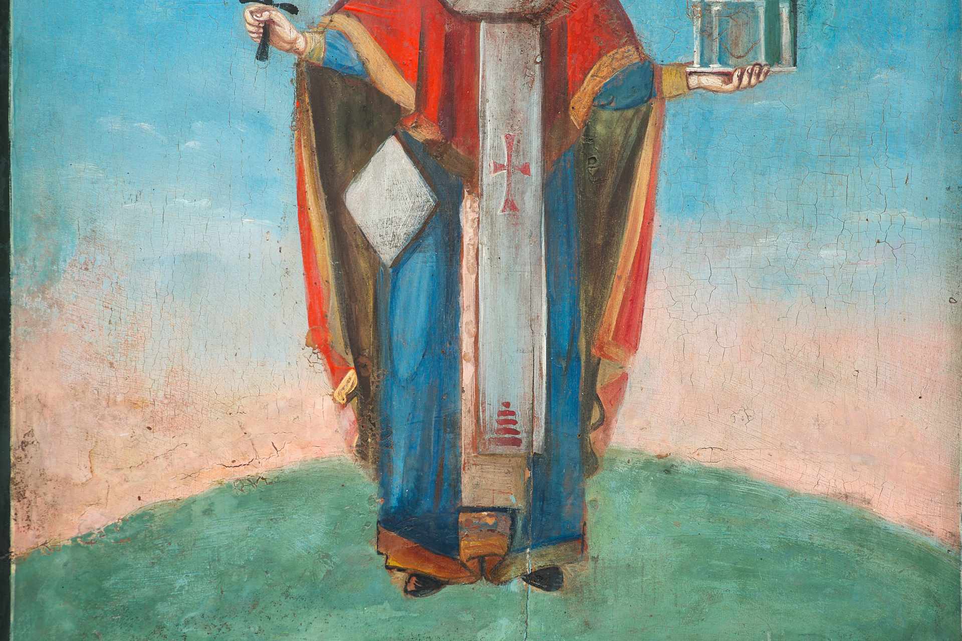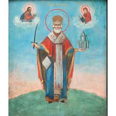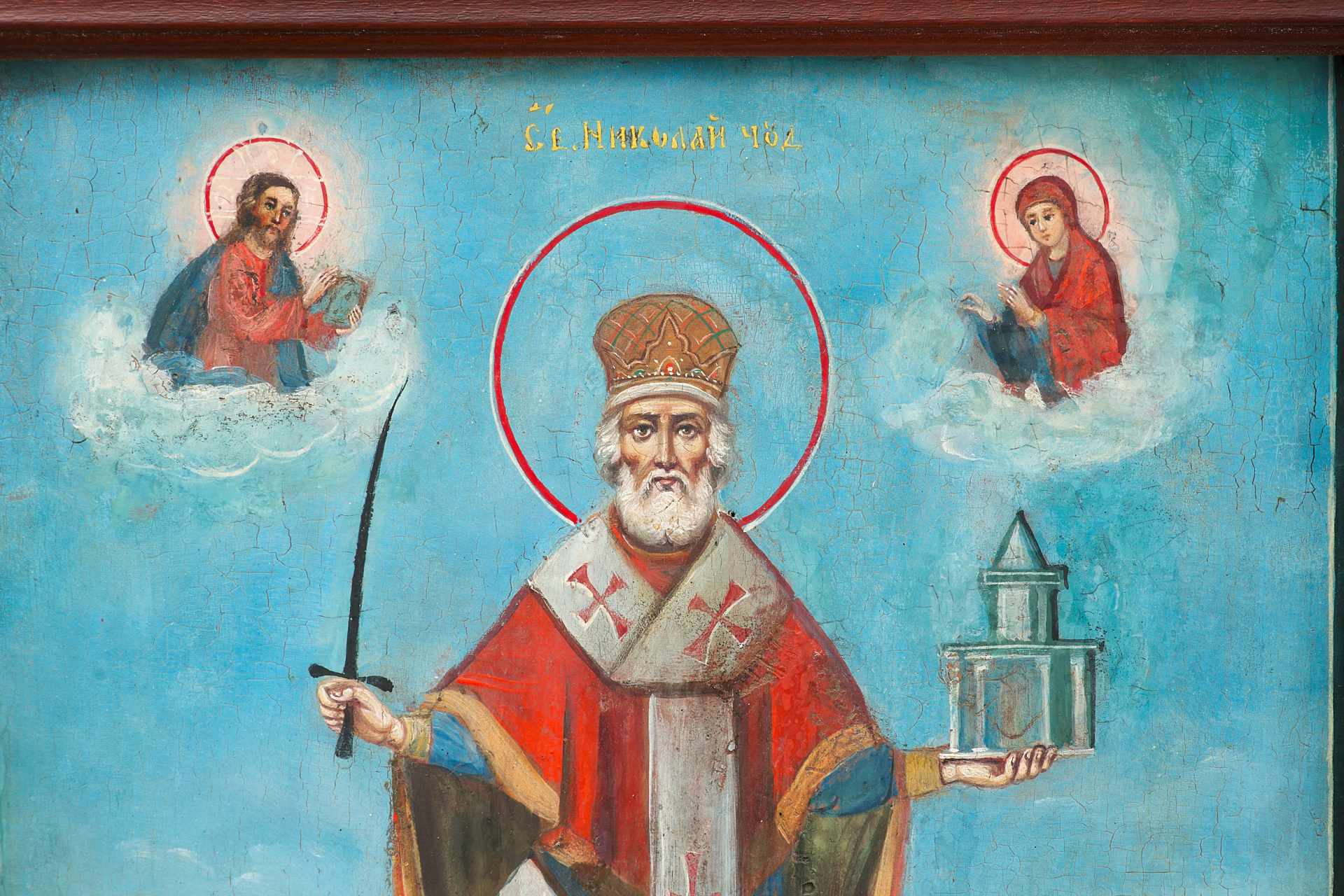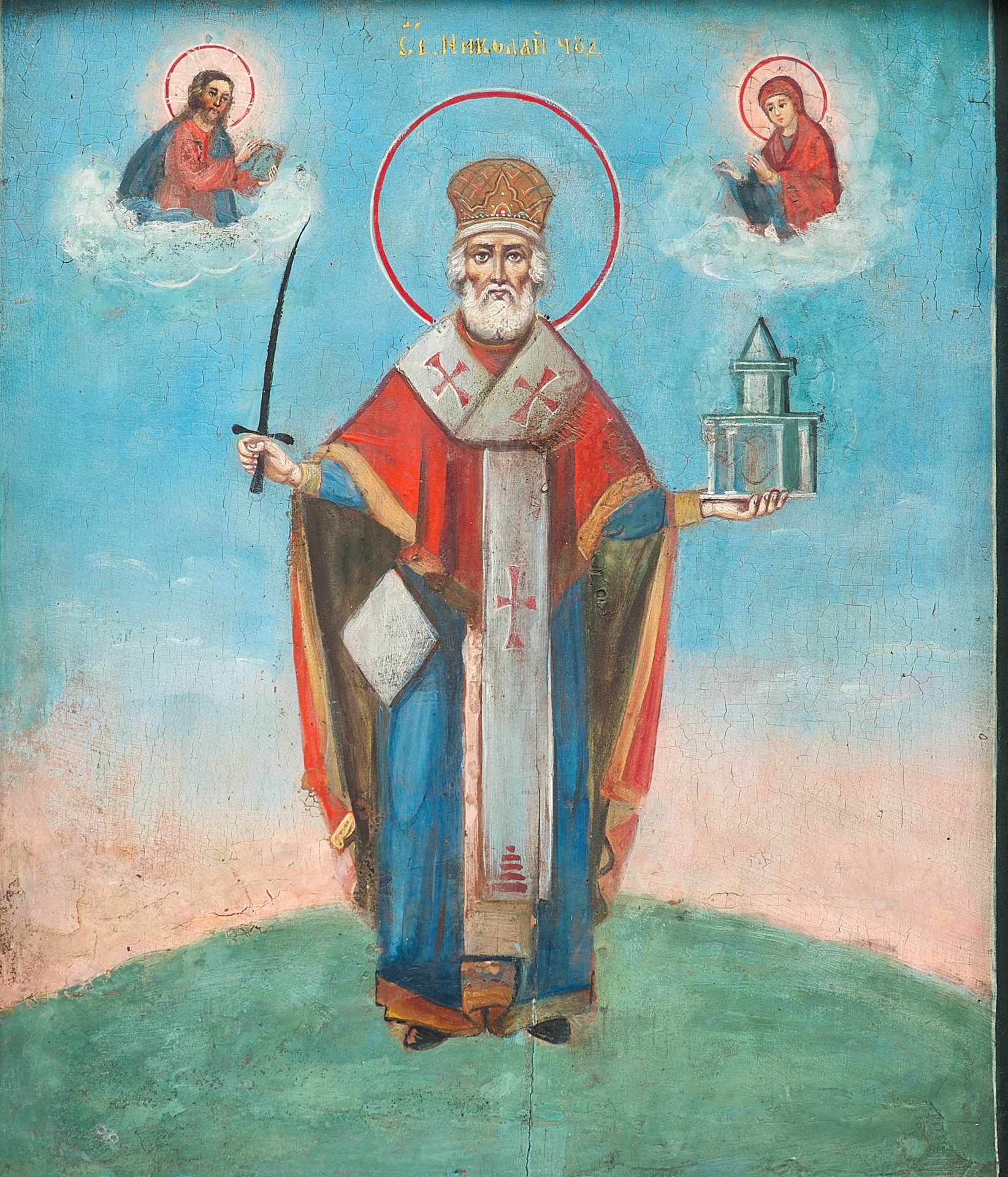 Иконографический тип Никола Можайский», представляющий святителя Николая Мирликийского в рост, в епископских одеждах, с поднятым мечом в правой руке и градом церковью) в левой, получил свое название по месту происхождения