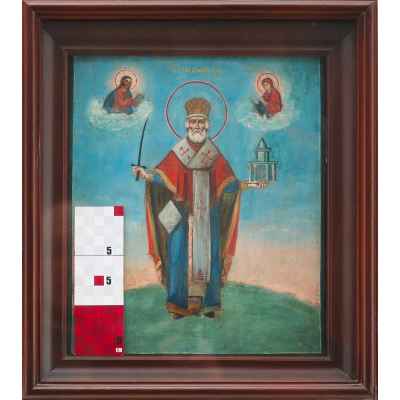 Икона в киоте Никола Можайский масло посл. чет. XIX в. 31,5 x 26,5 см. последняя четверть XIX века