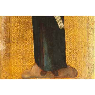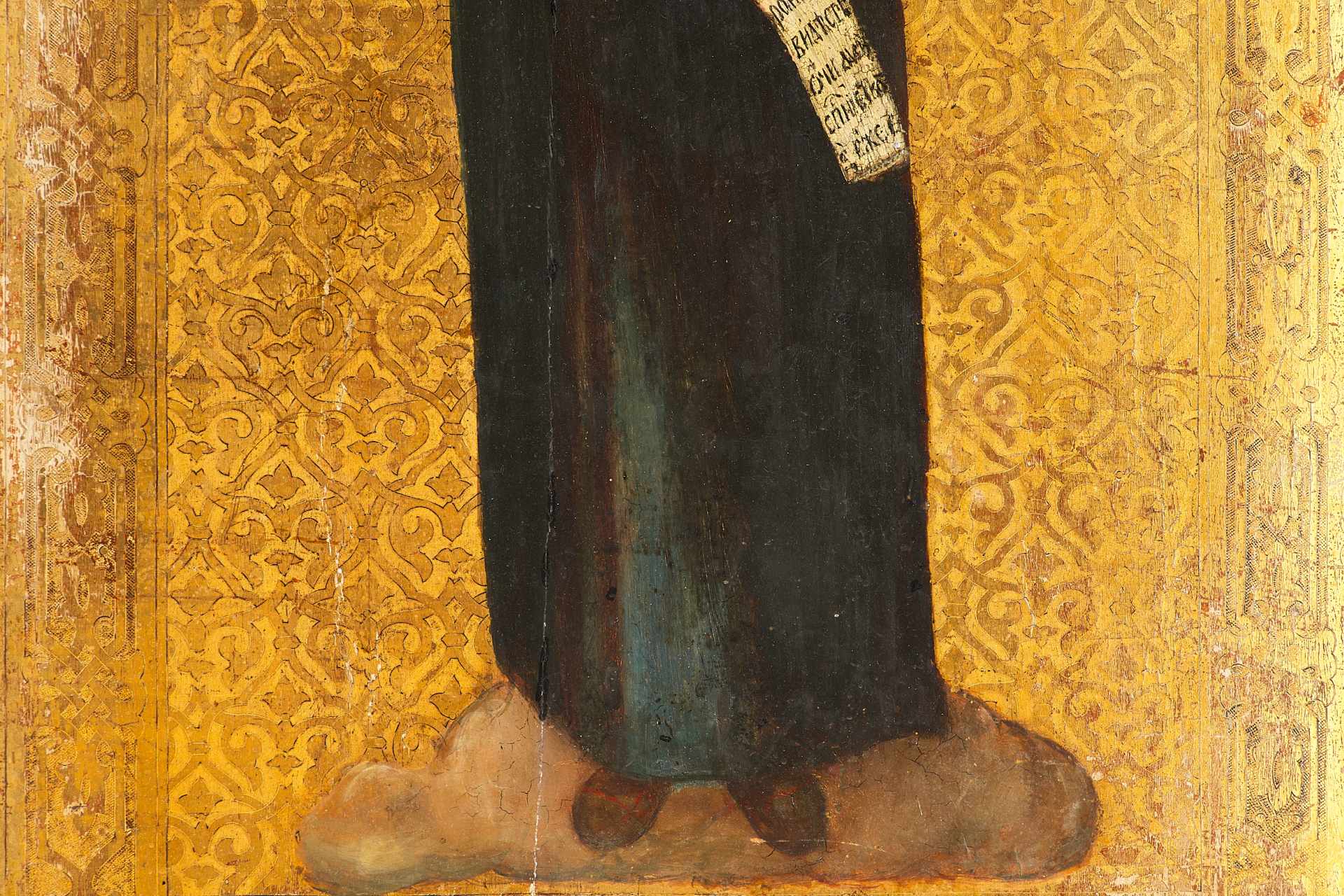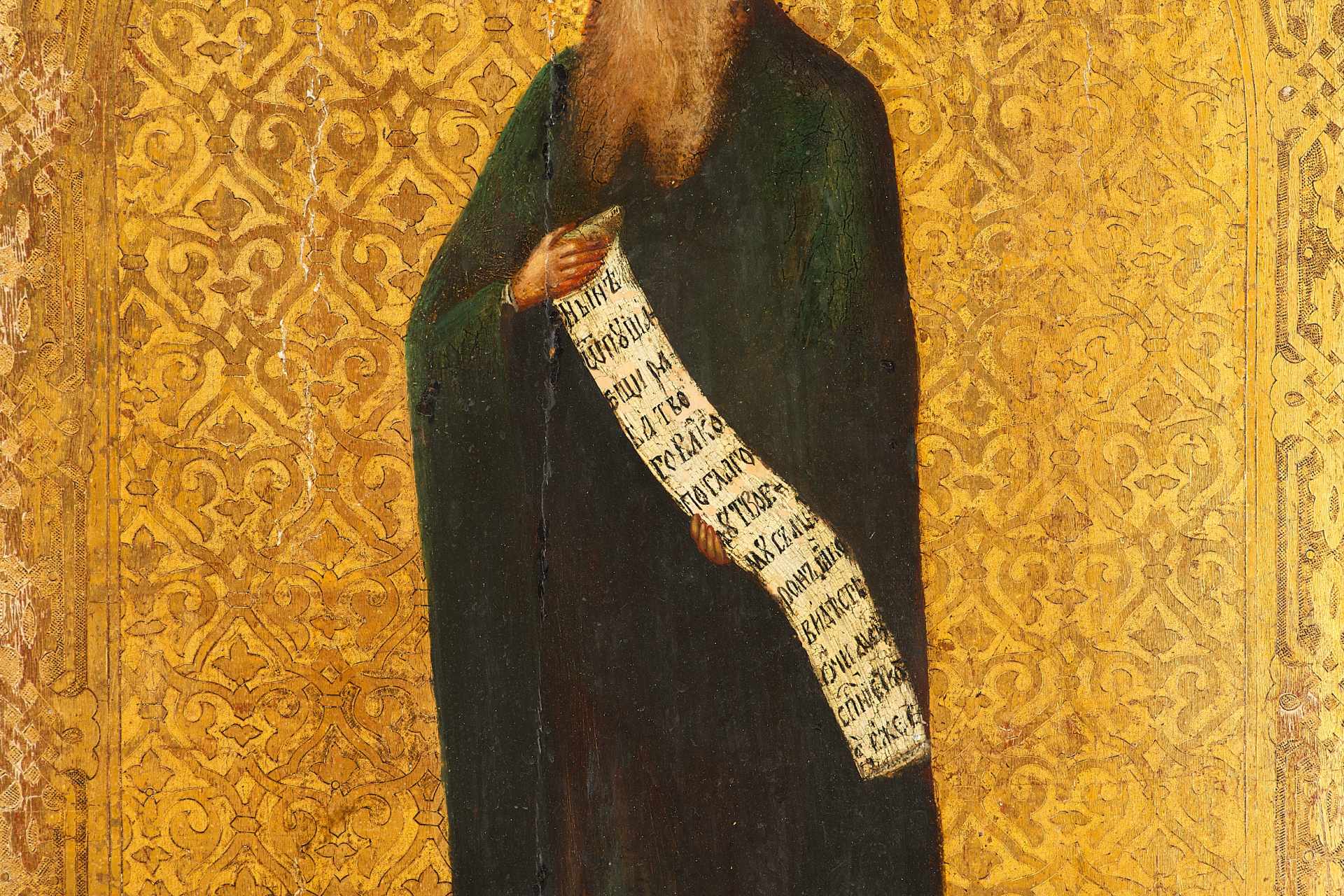 держит развернутый свиток с текстом на старославянском языке. Фон украшен богатым орнаментом в византийском стиле.