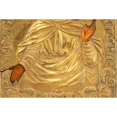 Живопись на иконе выполнена профессиональным мастером в конце XX века на старой основе “под оклад”.
