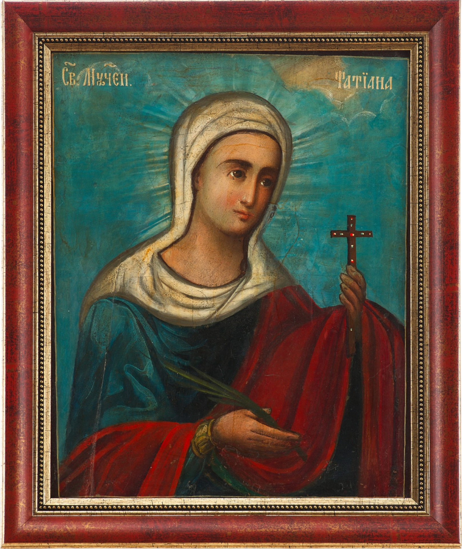 Согласно житию, святая Татьяна была дочерью римского сановника-христианина и с юных лет посвятила себя Богу. Она служила диакониссой в Римской церкви, заботясь о нуждающихся, больных и узниках. Во время гонений при императоре Александре Севере была схвачена за исповедание христианской веры. Несмотря на мучения, она оставалась стойкой в своей вере и молилась за своих истязателей. В 226 году была казнена через усечение мечом. В этот же день был казнён и её отец, принявший мученичество. День её памяти в православной церкви отмечается 12 (25) января.