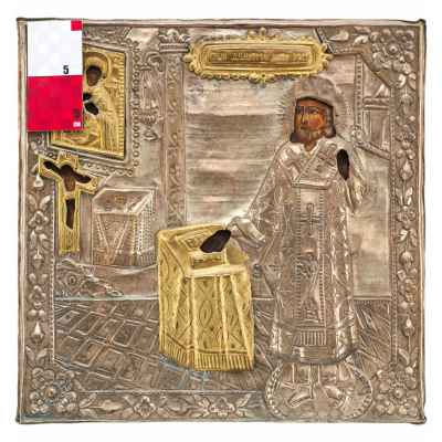 Икона в окладе Св. Дмитрий Ростовский в молении перед образом БМ Ватопедской 36,5x37x2,7 см. Конец XIX века