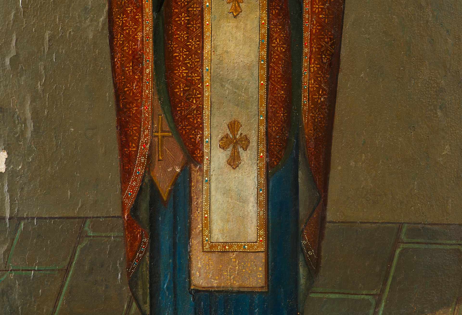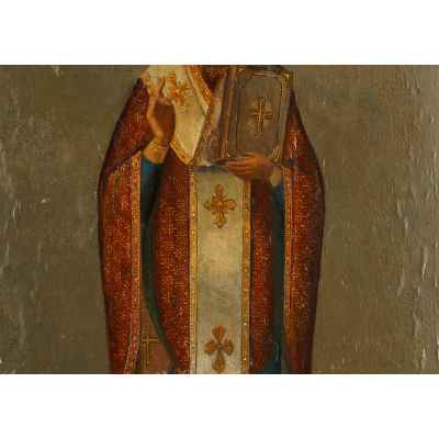 На иконе в полный рост представлен Святитель Николай Чудотворец, с благословляющим жестом правой руки и Евангелием в левой руке. Николай одет в святительские одежды с широким омофором.