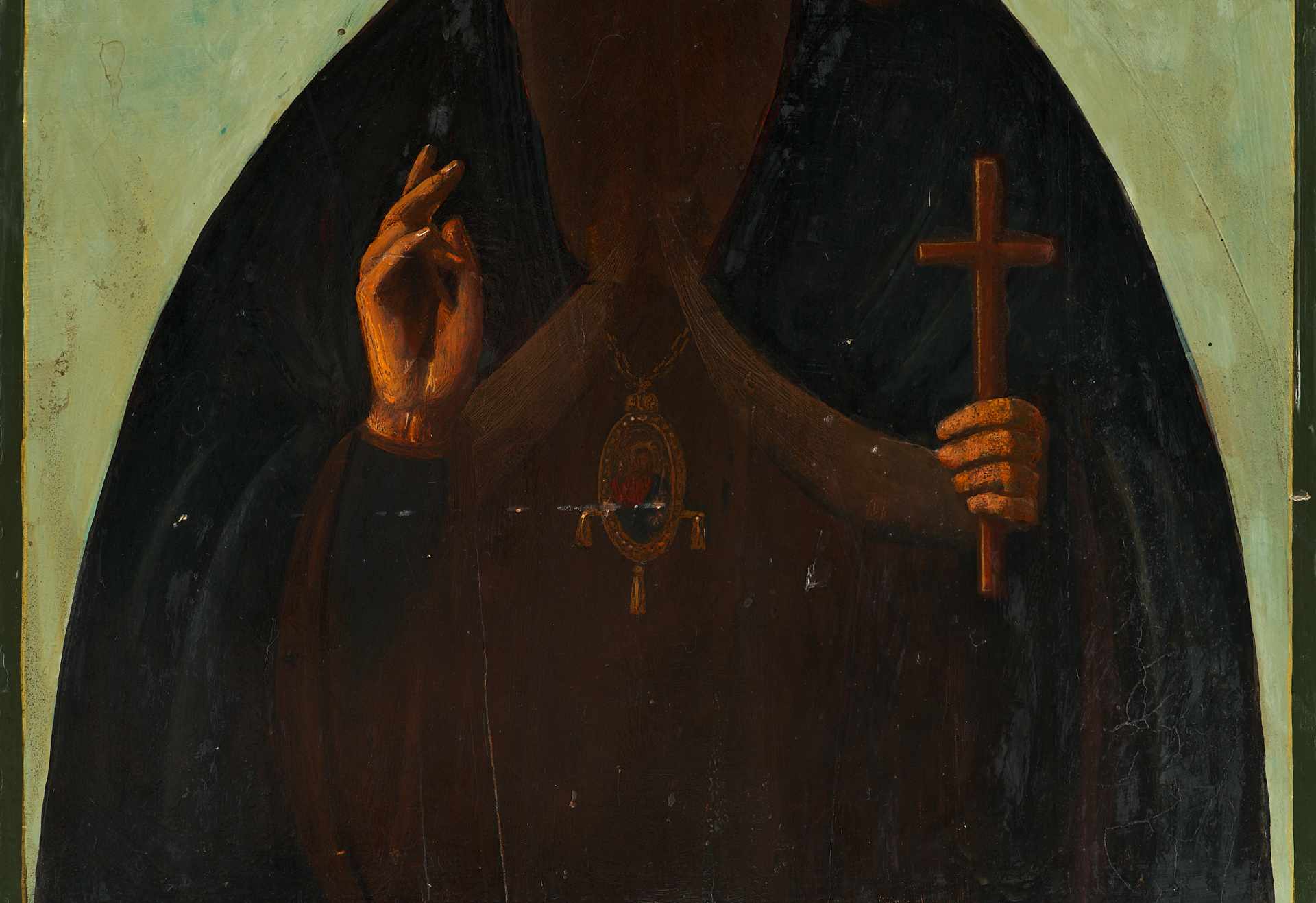 На иконе представлен святой, в монашеском облачении. В правой руке его крест, левая рука сложена в благословляющем жесте.