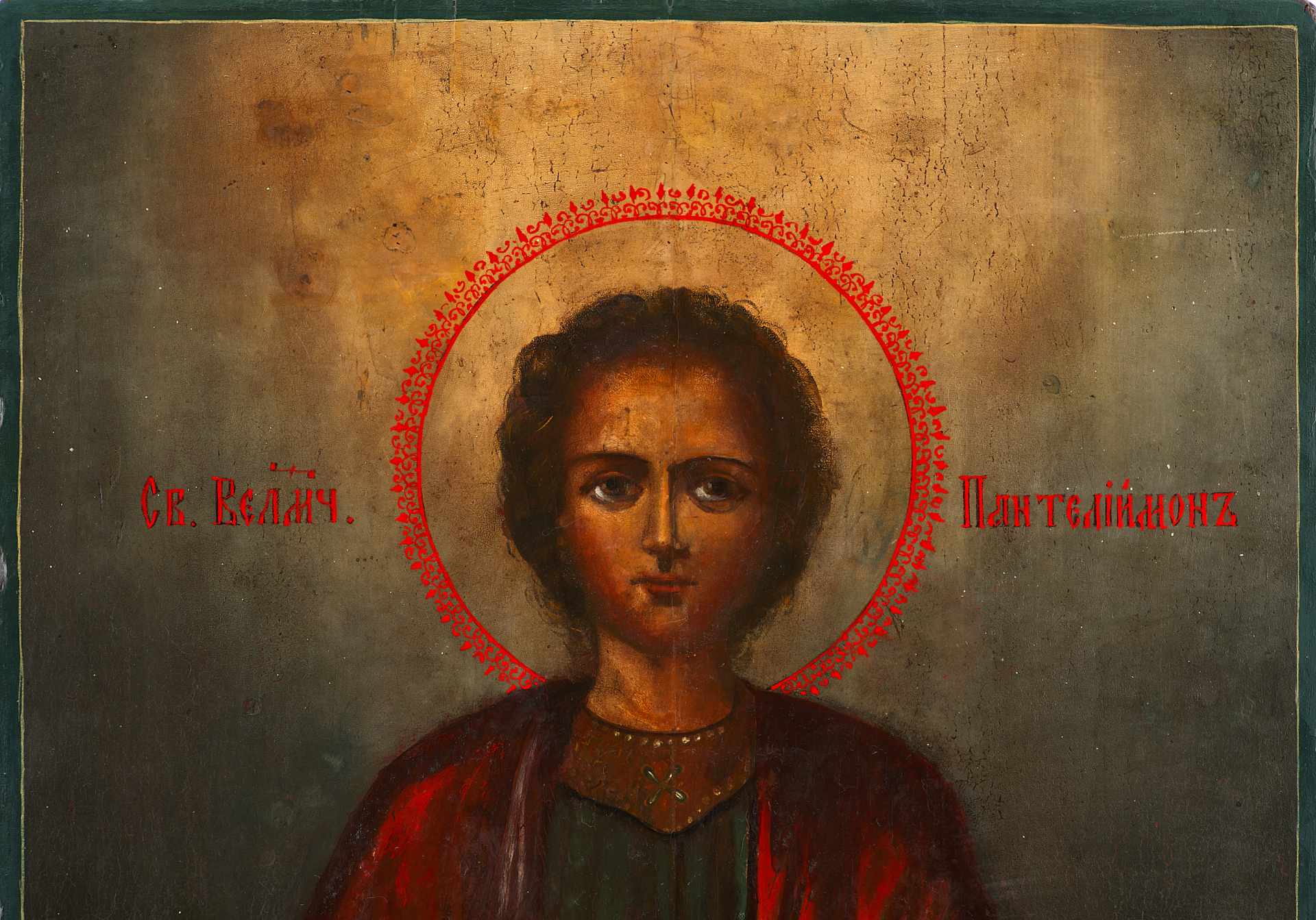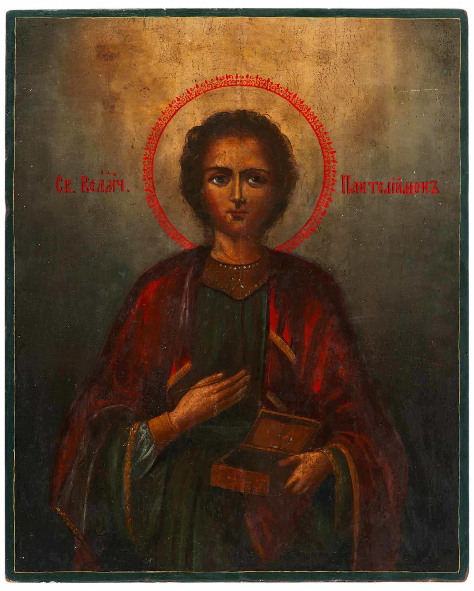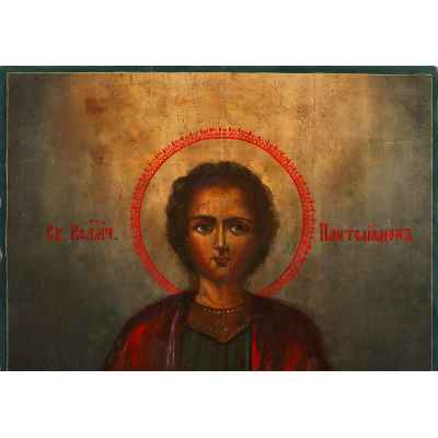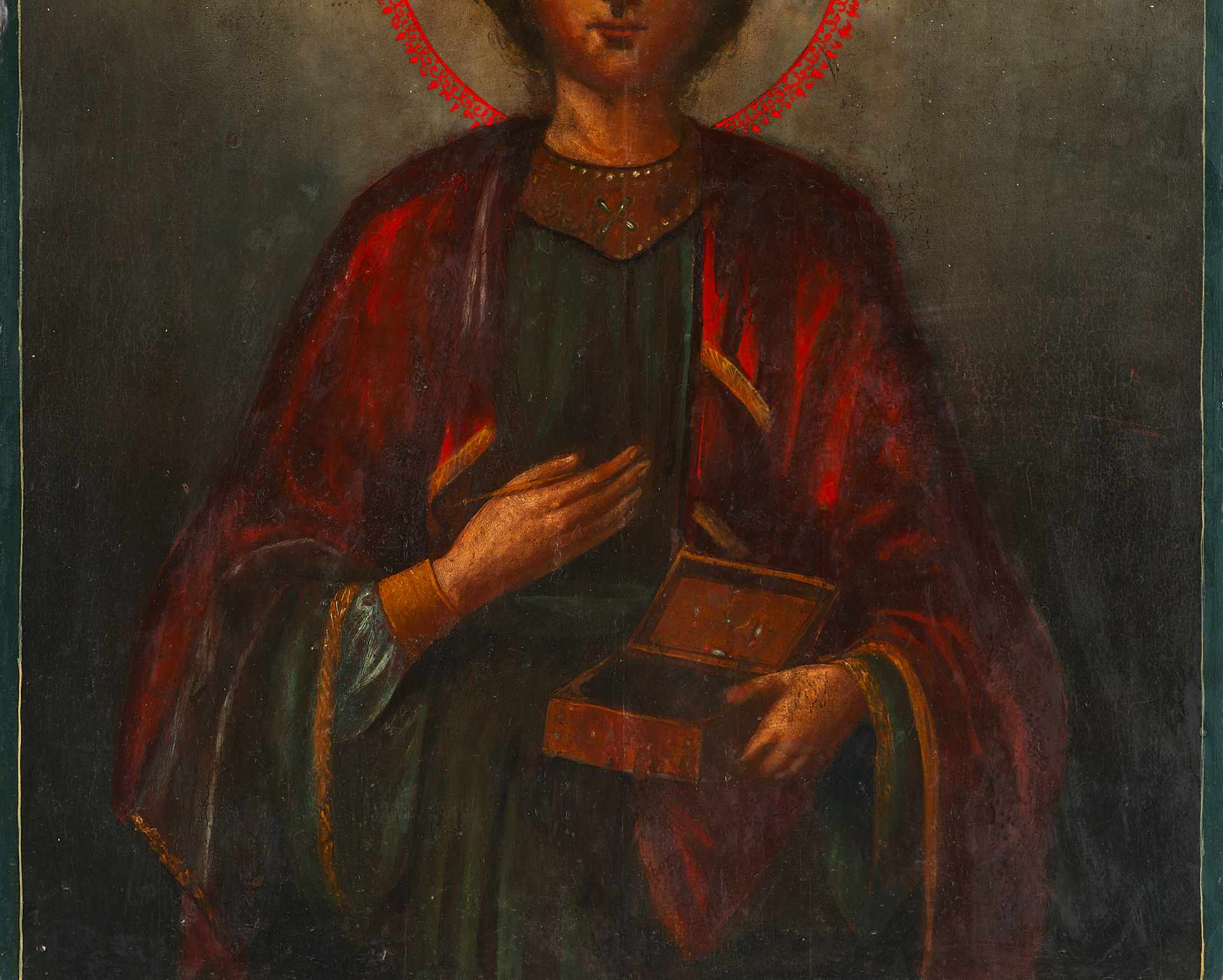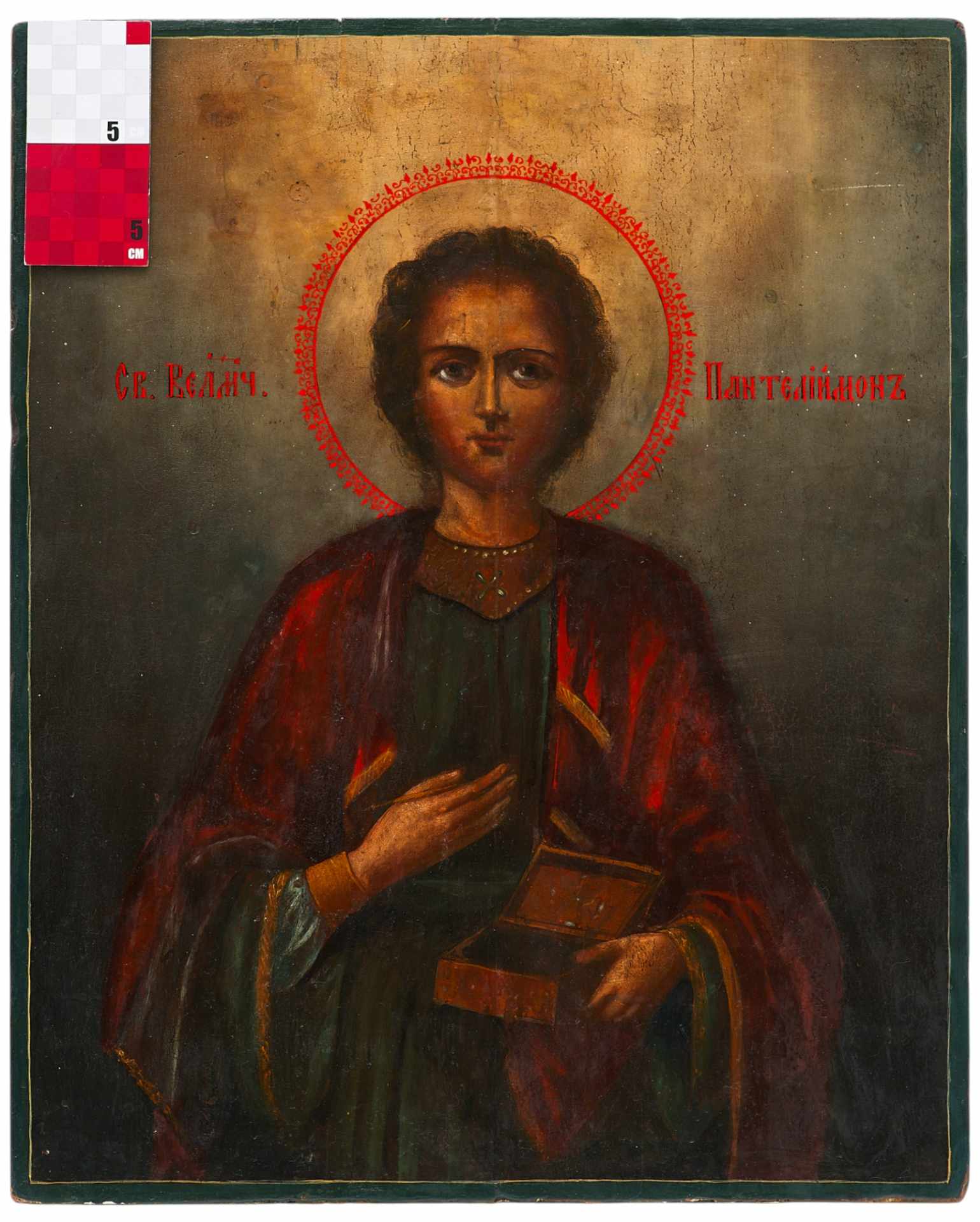 На иконе представлен святой в образе прекрасного юноши со лжицей — ложечкой для раздачи причастия — в правой руке и дарохранительницей в левой. Родился он в 80-х годах III века, казнен в 309г. В некоторых областях существовало поверье, что Пантелеймон «помогал при моровых болезнях» - эпидемиях. Пантелеймона прославляли как безмездного врача, лечившего больных именем Господа Бога.