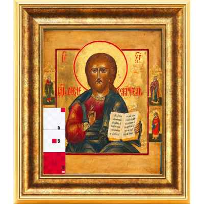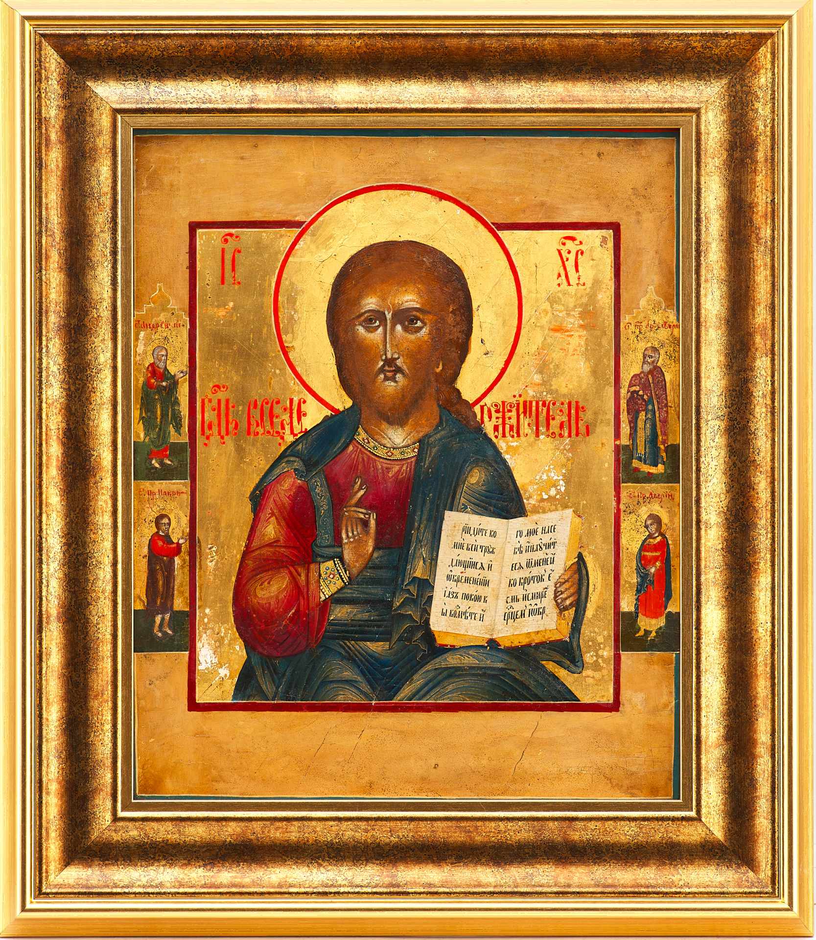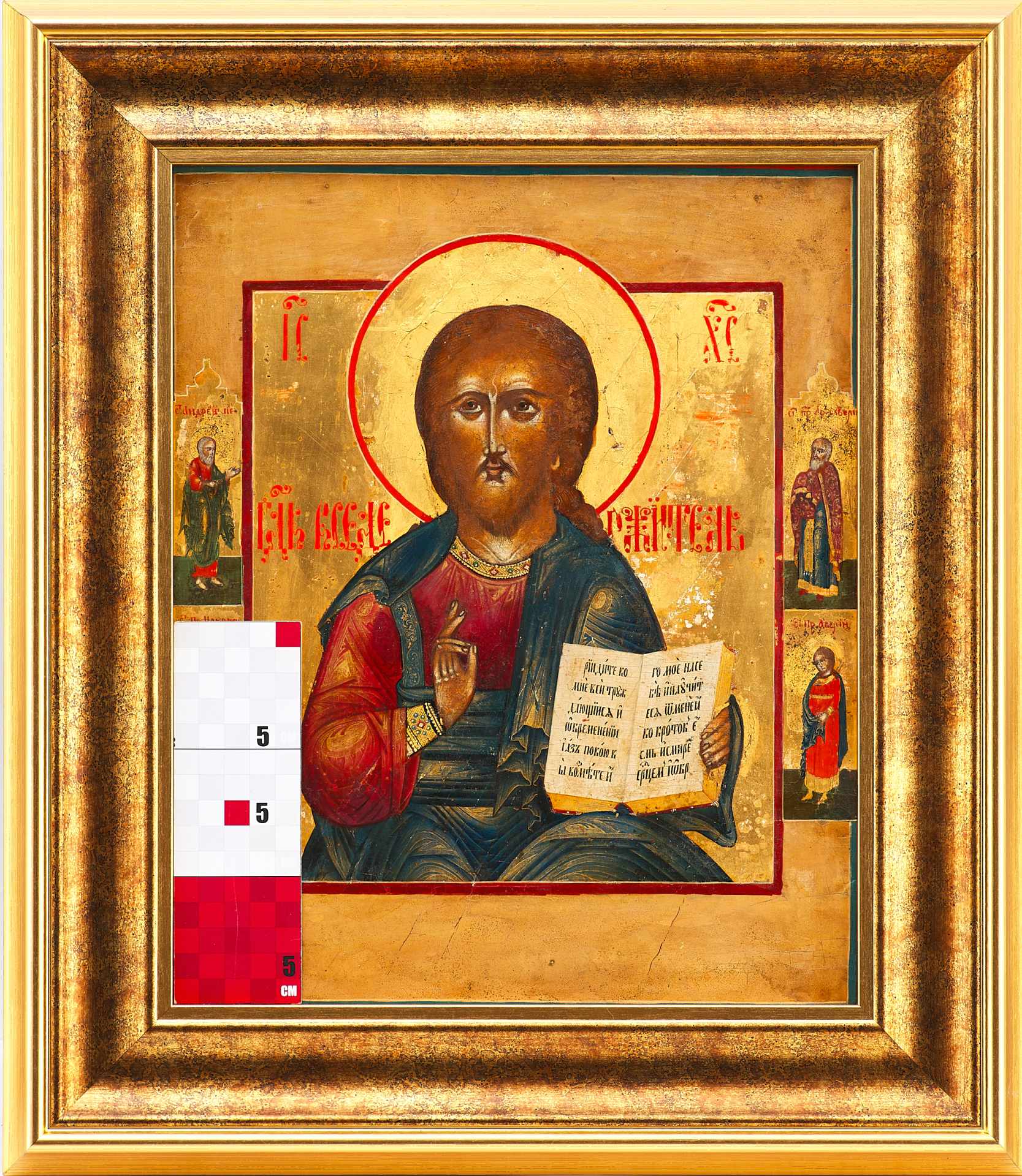 На иконе изображена поясная фигура Христа в фас с евангелием в левой руке и с благословляющей правой рукой. Евангелие в руках Христа открыто. На открытых страницах надпись: "Приидите ко мне все труждающиеся...".