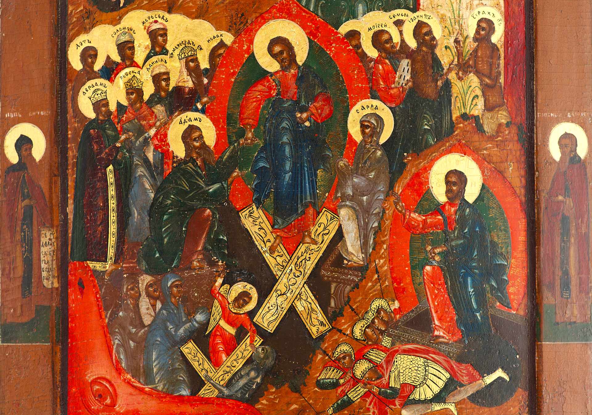 попирает разрушенные врата ада. Адам и Ева исходят из гробов. Подобная иконография праздника получила распространение в русских землях.