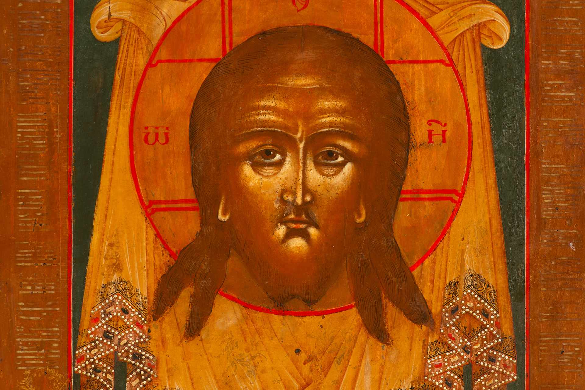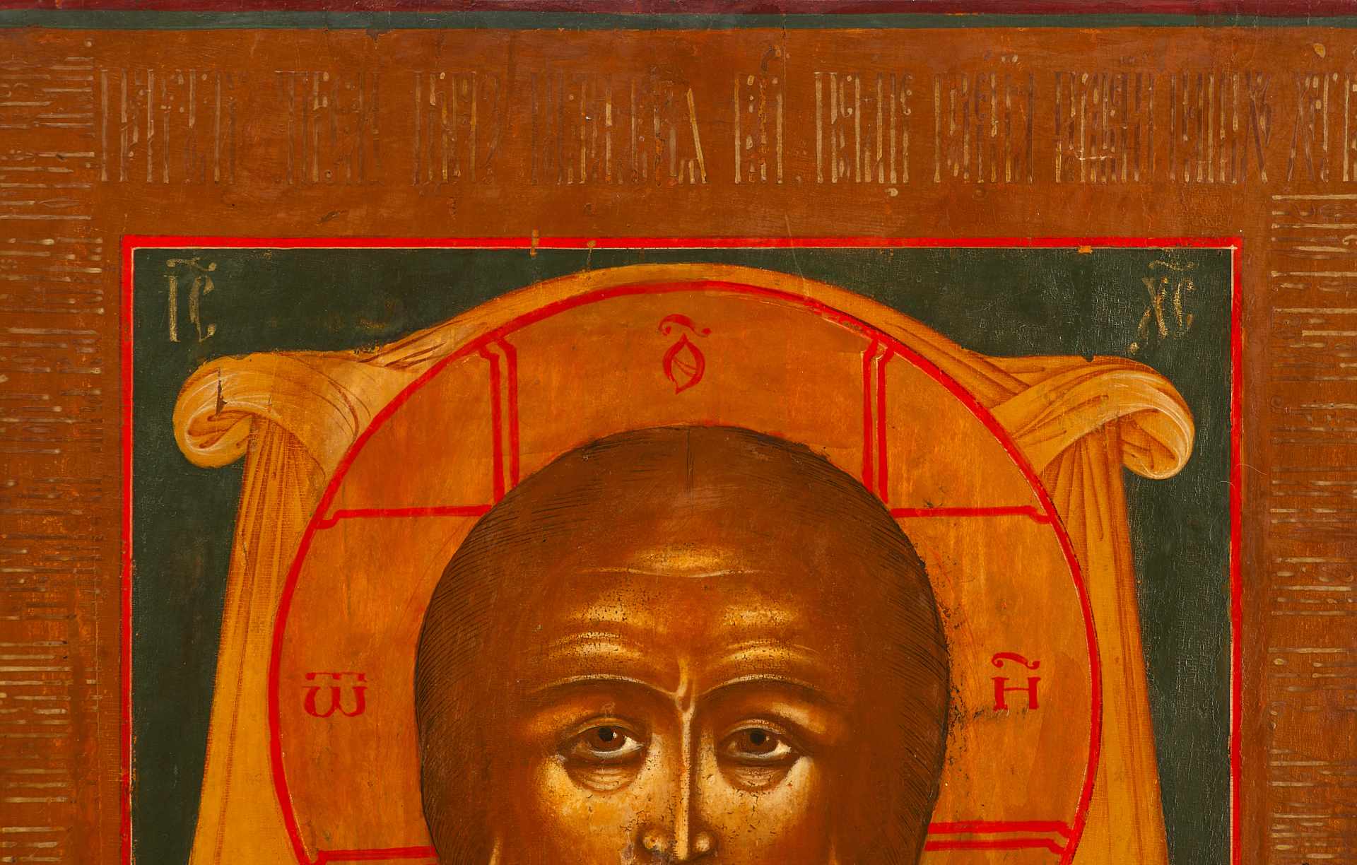 На иконе изображен лик Иисуса Христа, запечатленный на убрусе (полотенце), который вписывается во весь средник.