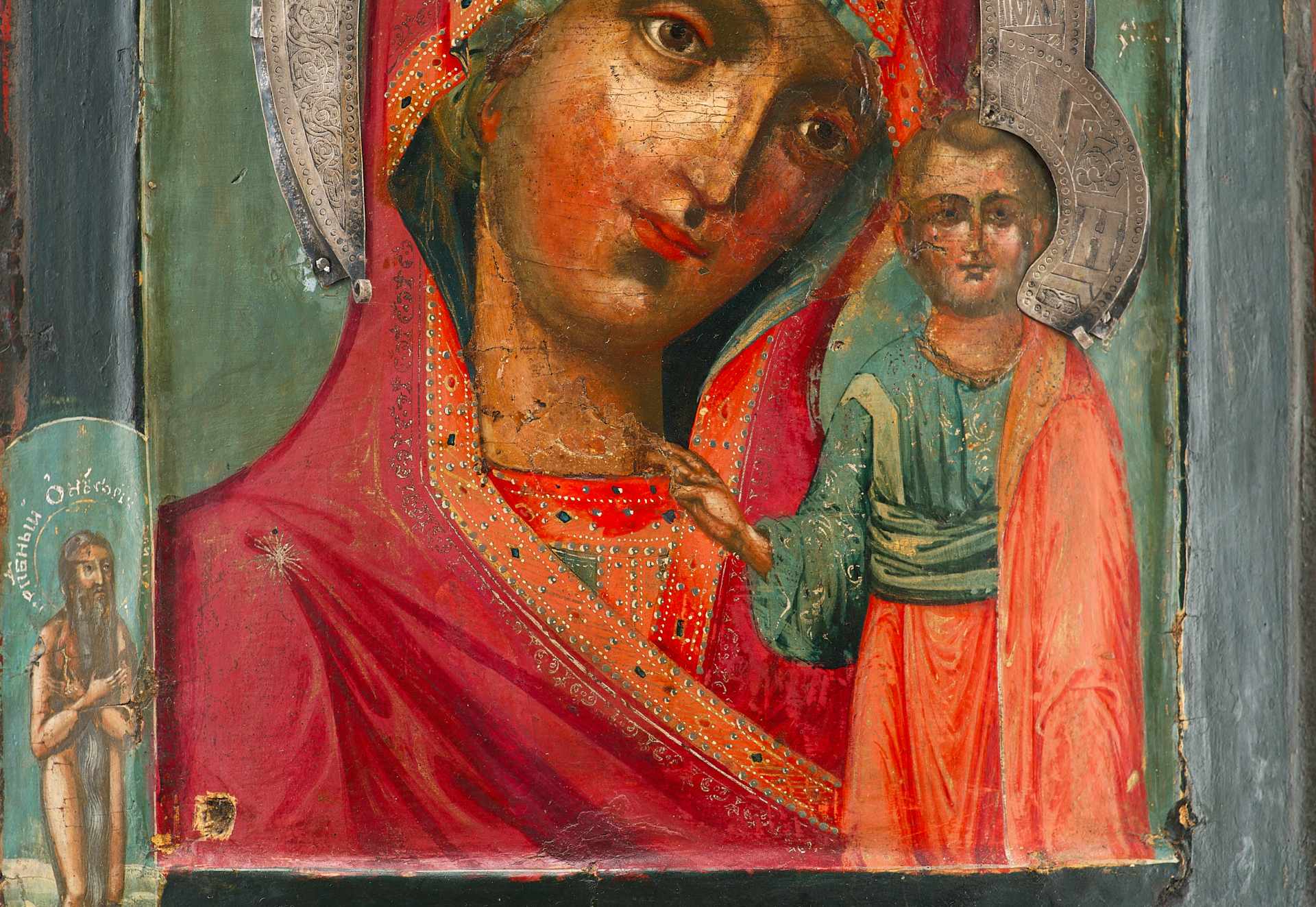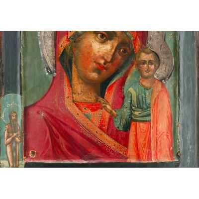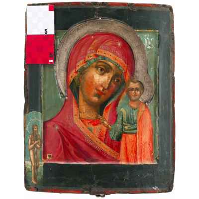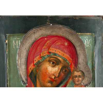 На иконе - Богоматерь и поколенное изображение младенца Христа. Богоматерь Казанская одна из наиболее почитаемых на Руси икон Божьей Матери. Чудесное явление этой иконы совершилось в Казани в июле 1579г.
