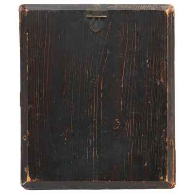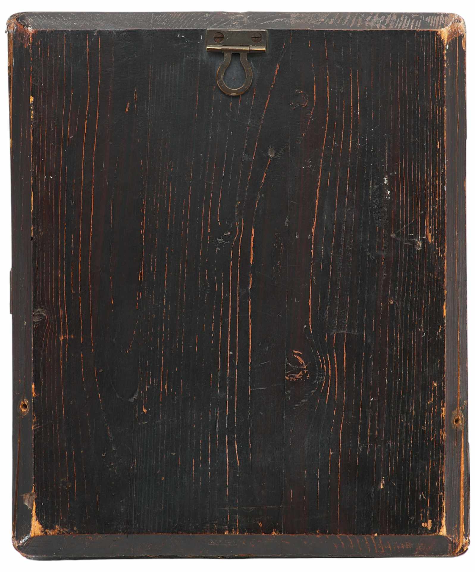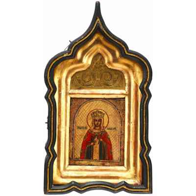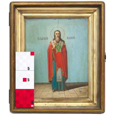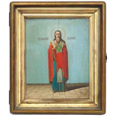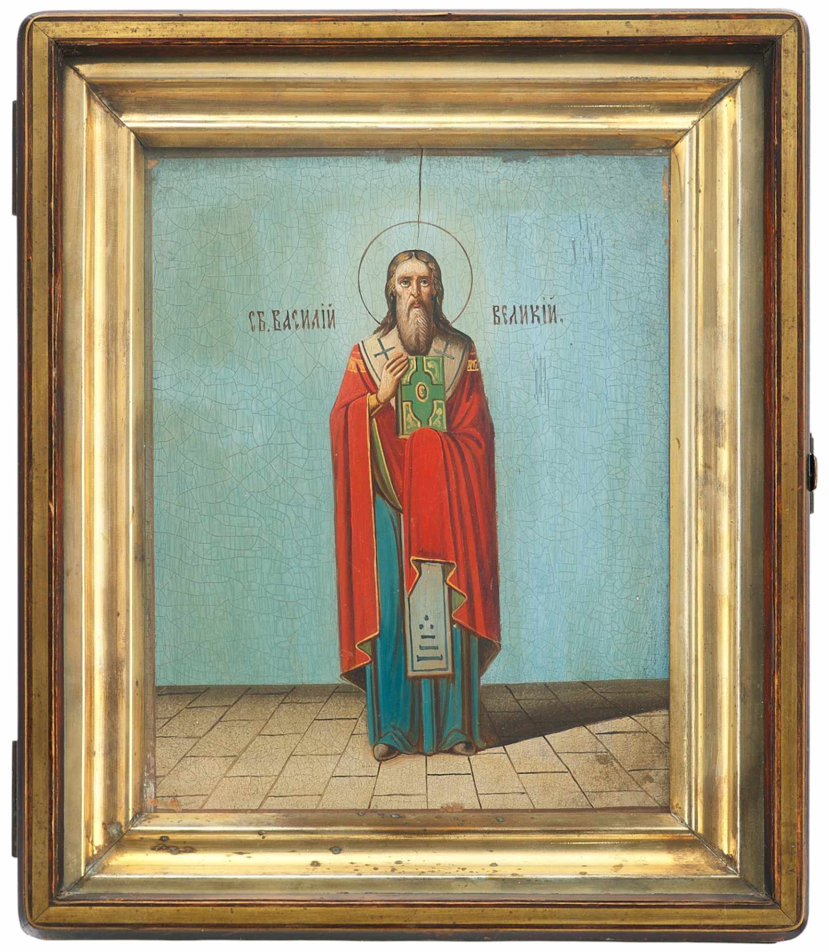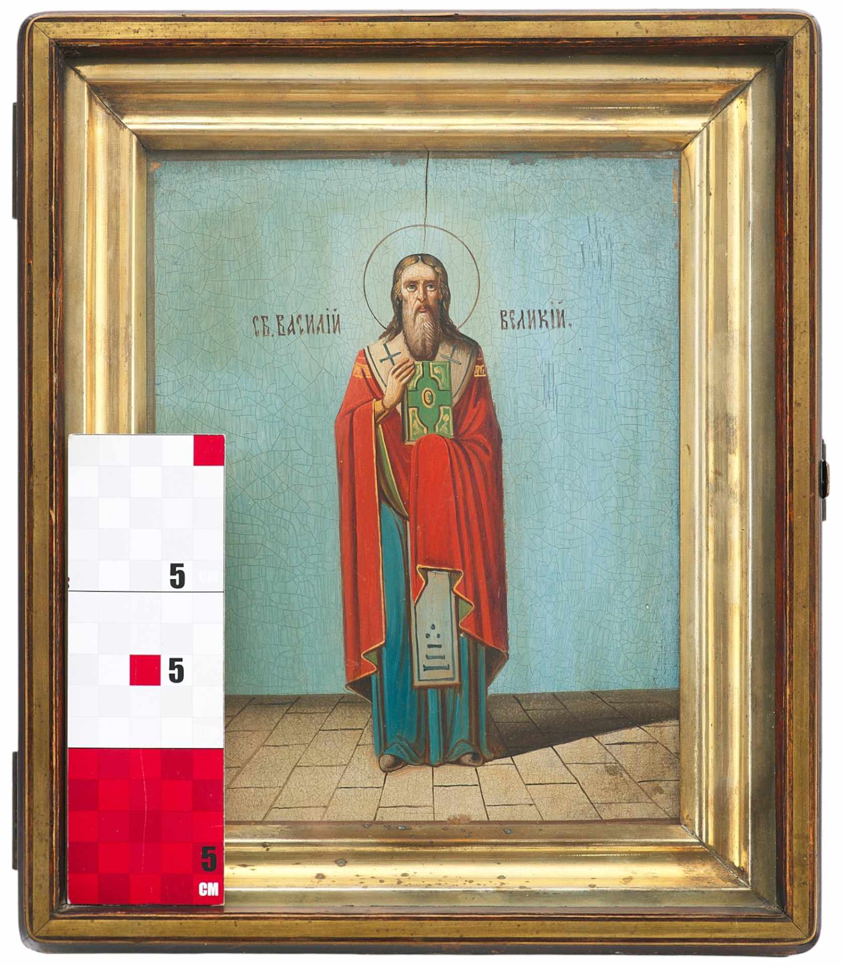 Икона «Святитель Василий Великий» представляет собой высококачественный пример русской иконописи конца XIX века, выполненный в мастерской Якова Васильевича Кудрявцева. На обороте иконы сохранился штамп мастерской, подтверждающий её происхождение, а также карандашная надпись: «Предстоящее Василия Великова по голубому фону», указывающая на сюжет и цветовую палитру. Изделие выполнено на деревянной доске с торцовыми шпонками, в технике левкаса и масляной живописи, что типично для икон второй половины XIX столетия.